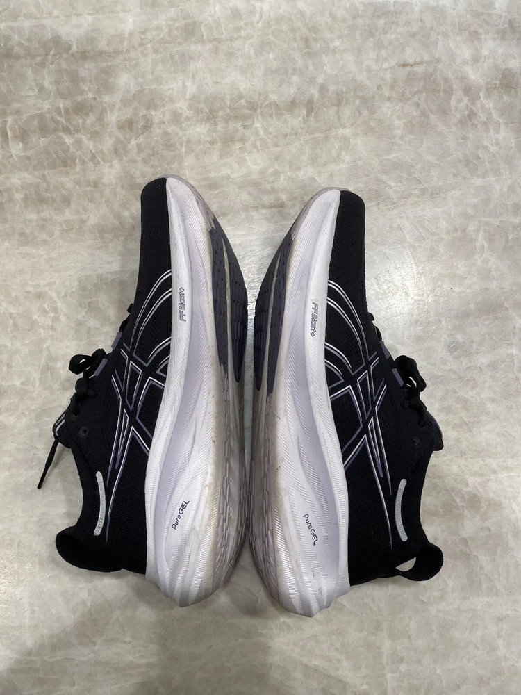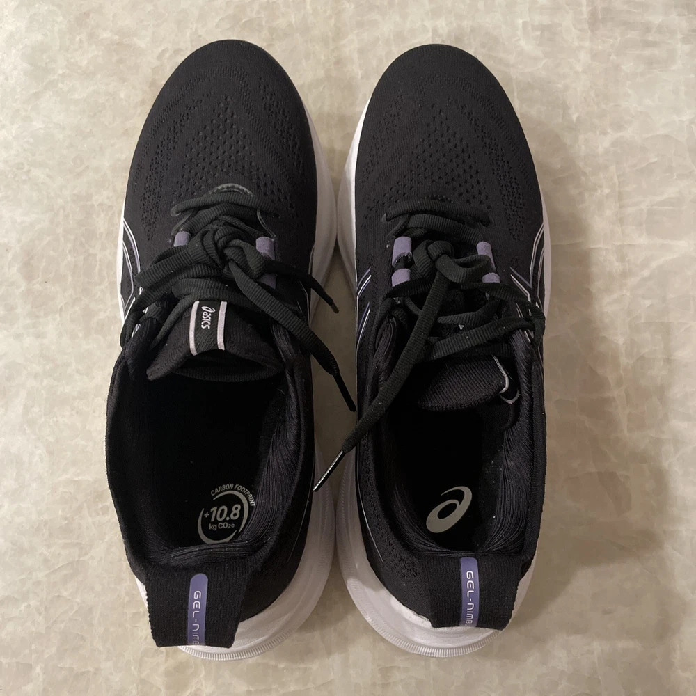 Experience the fusion of performance and comfort with the ASICS Women's GEL-NIMBUS 26 Sneakers. Designed for the active woman, these sleek black sneakers with purple and white accents deliver a smooth ride whether you're running on the treadmill or hitting the streets. The low top shaft and lace-up closure ensure a secure and customizable fit, while the durable rubber outsole provides superior traction. Crafted for both avid runners and casual joggers, the US size 9.5 (EU 41.5, UK 7.5) sneakers hail from the acclaimed ASICS GEL-Nimbus product line, known for its exceptional support and cushioning. Please reach out if you have any questions. Thank you!