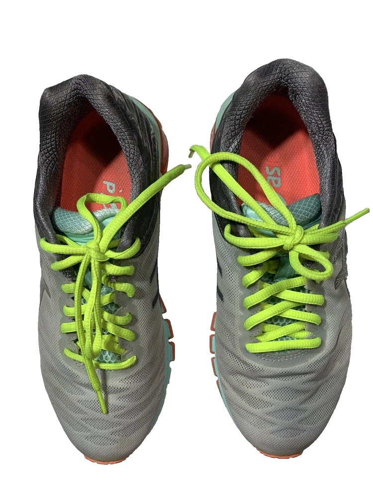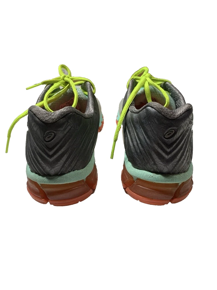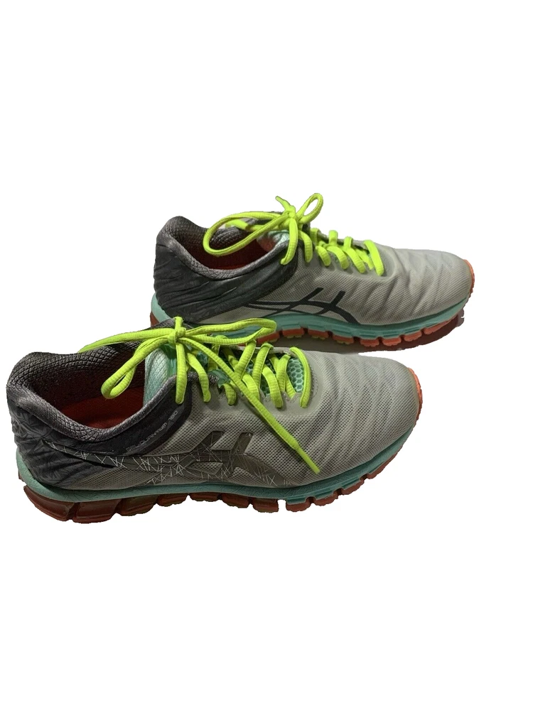 The Asics Women's Gel Quantum 180 T5J7N Sneaker Running Shoes in size 6.5 feature a low top shaft style in a solid gray color with green accents. These lace-up sneakers are designed for activewear, casual wear, and workwear, suitable for walking and running activities. The shoes have a cushioned and comfortable design, with a synthetic upper material and fabric lining. The outsole is made of rubber for traction, and the shoes are part of the ASICS GEL-Quantum product line, known for their quality and performance in athletic footwear.