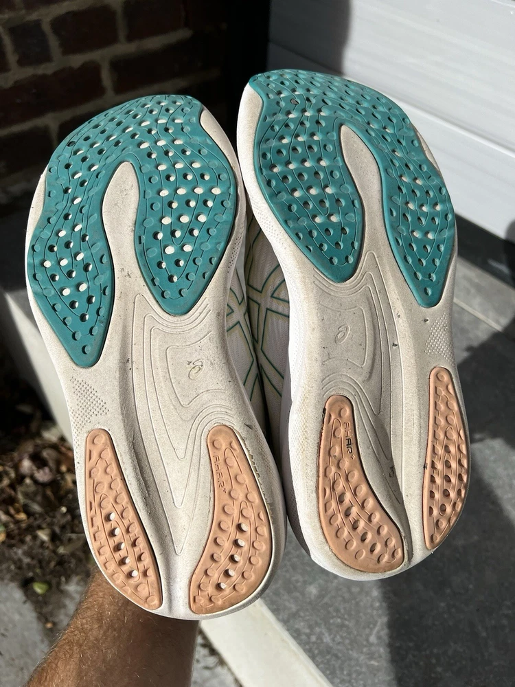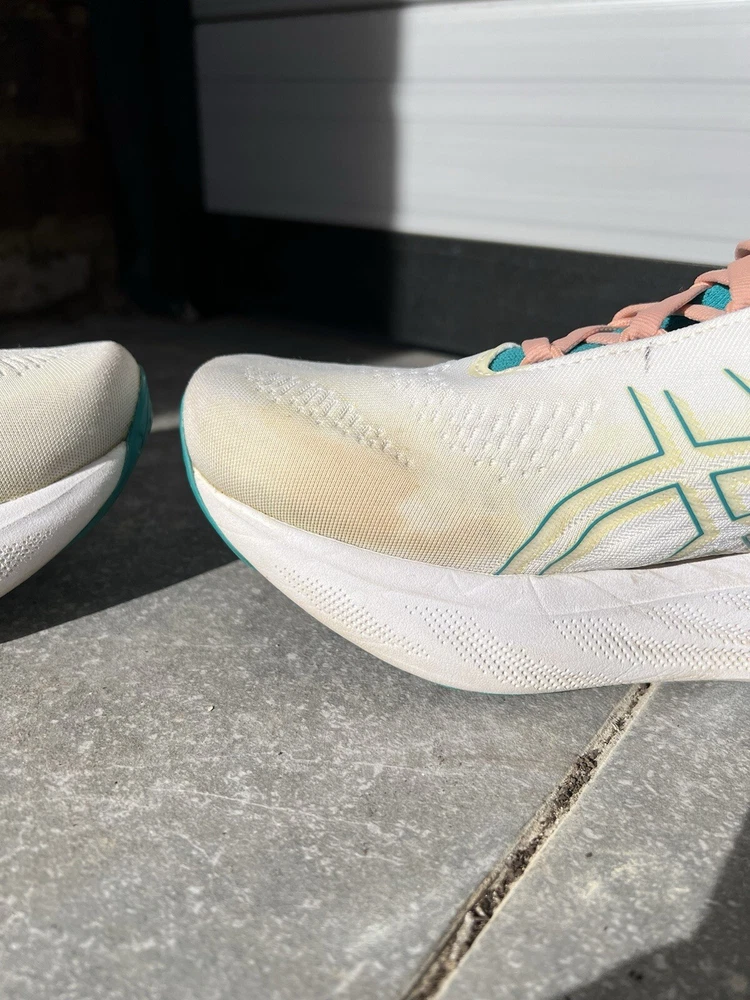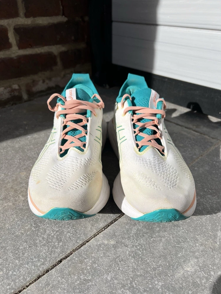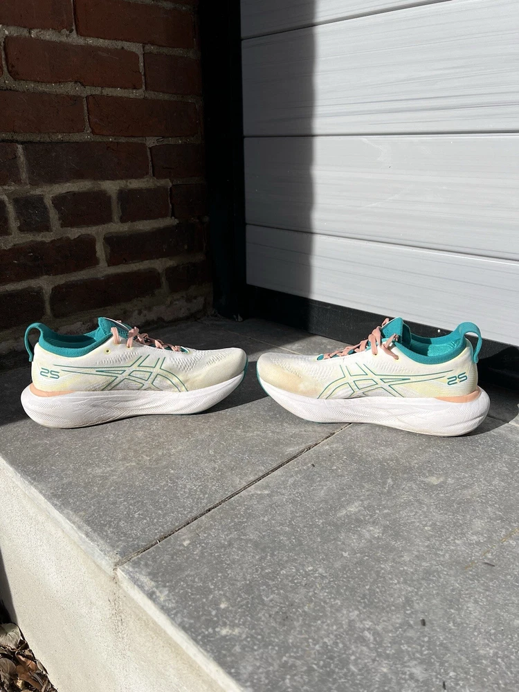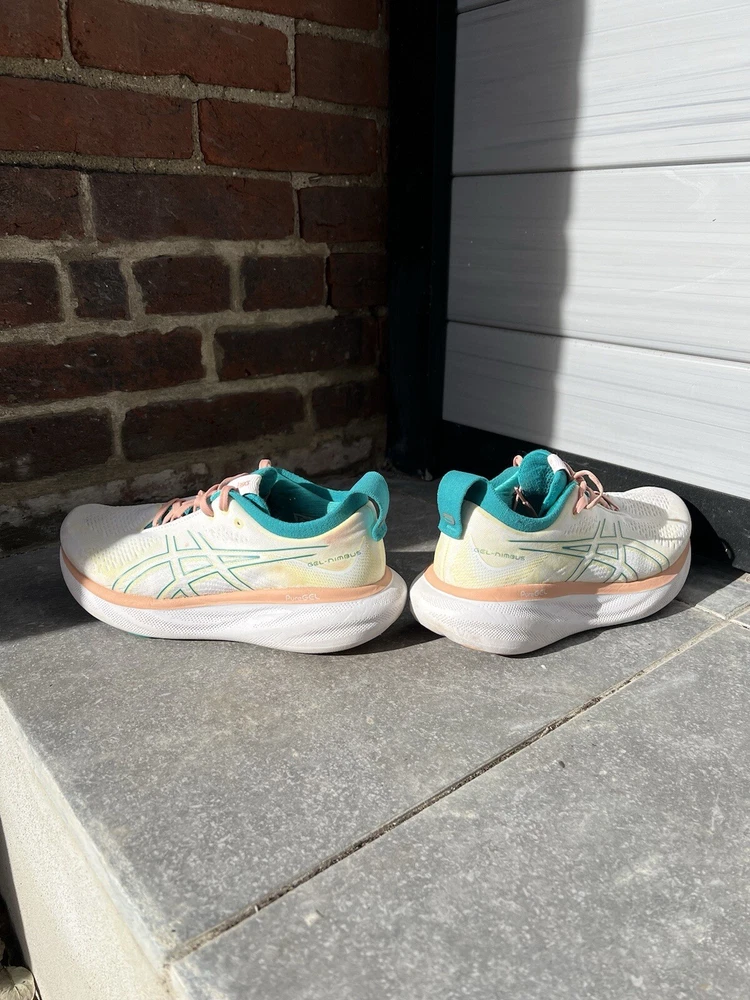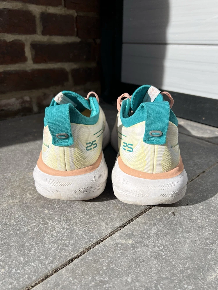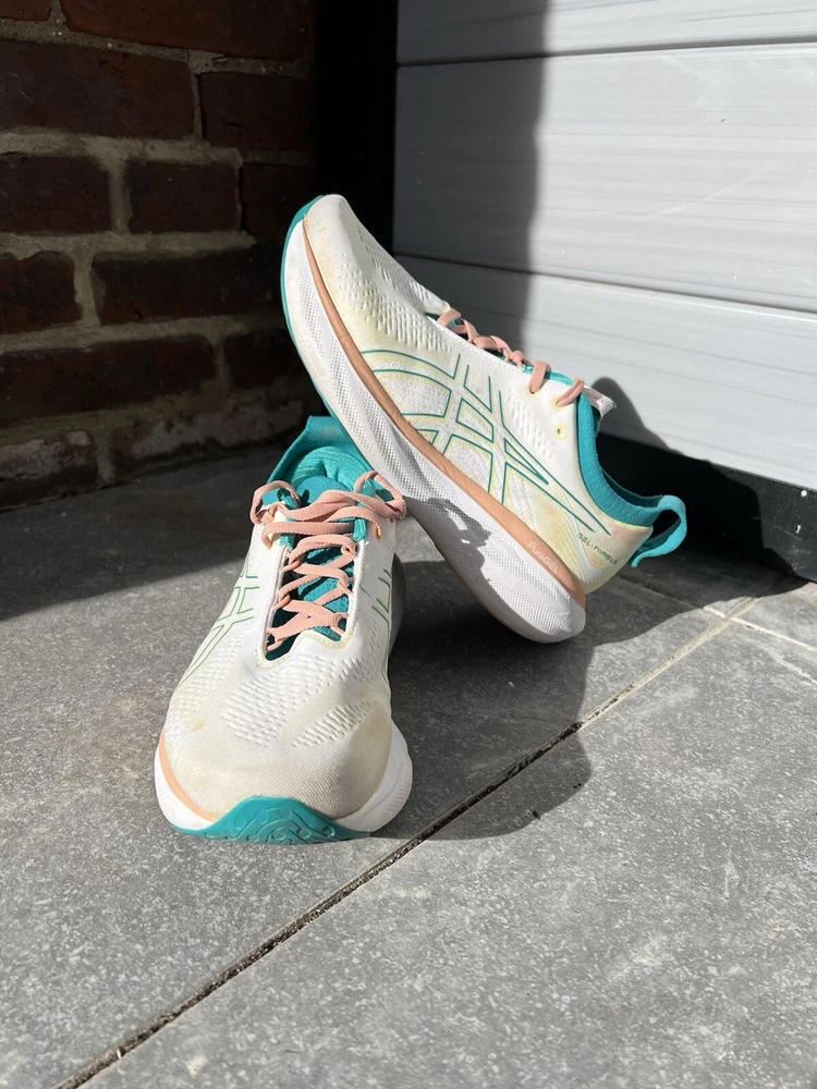 Experience the perfect blend of comfort and style with these ASICS GEL-Nimbus 25 sneakers. Designed for women who love to run, these shoes come in a beautiful white color with coral and teal accents. The mesh upper material is both breathable and cushioned, ensuring your feet stay comfortable even on long runs. The rubber outsole provides excellent traction, while the synthetic insole material offers additional support. These sneakers are perfect for gym and training, walking, and running and jogging. With a lace-up closure and low top style, these shoes are both fashionable and functional. Great lightly used condition. Some minor discoloration in right shoe toe area. See pictures before purchase and check out my other listings