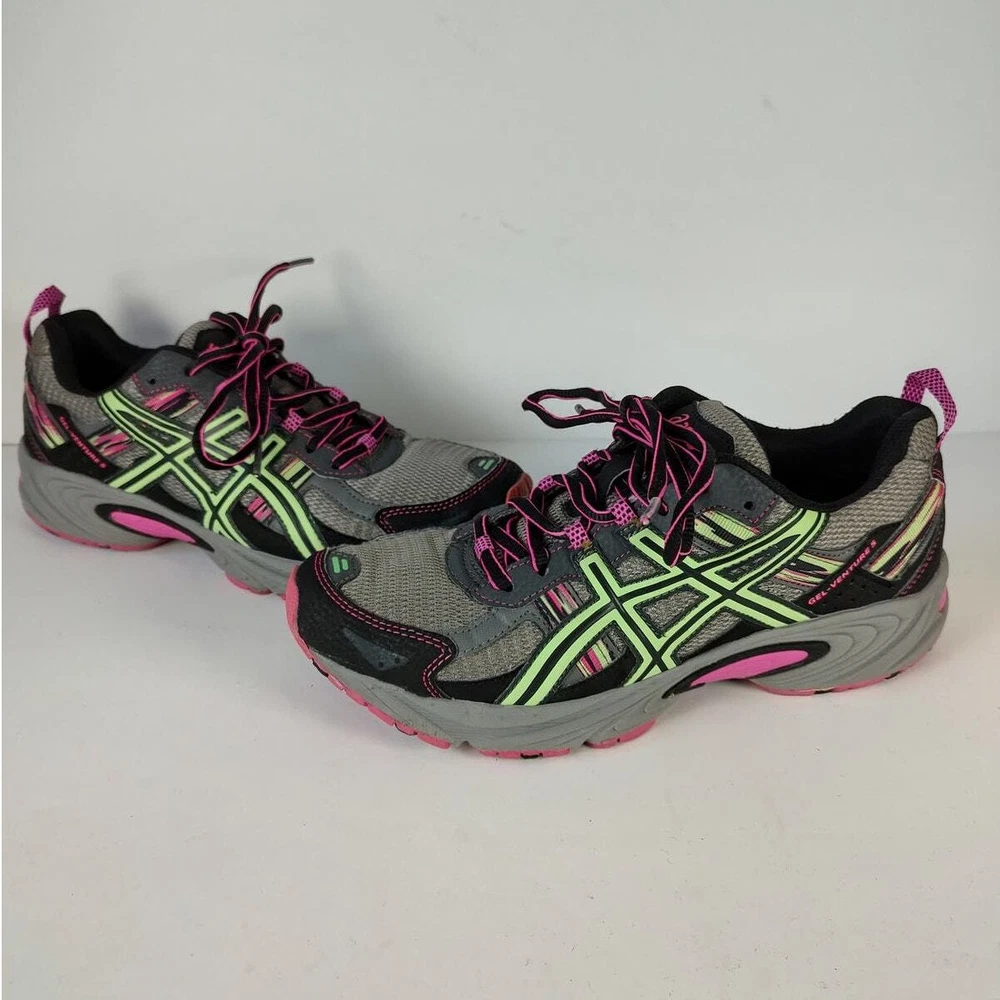 Asics Gel-Venture 5 - Grey and pink asics running shoes, womens size 8.5. Theyre in great condition, no holes or stains. Theyve been thoroughly cleaned before listing Please reference photos before purchasing