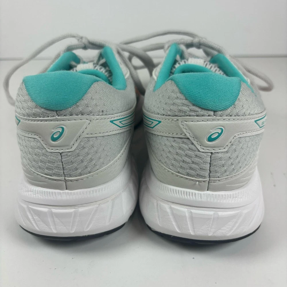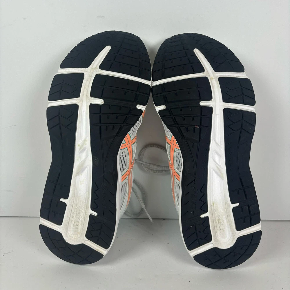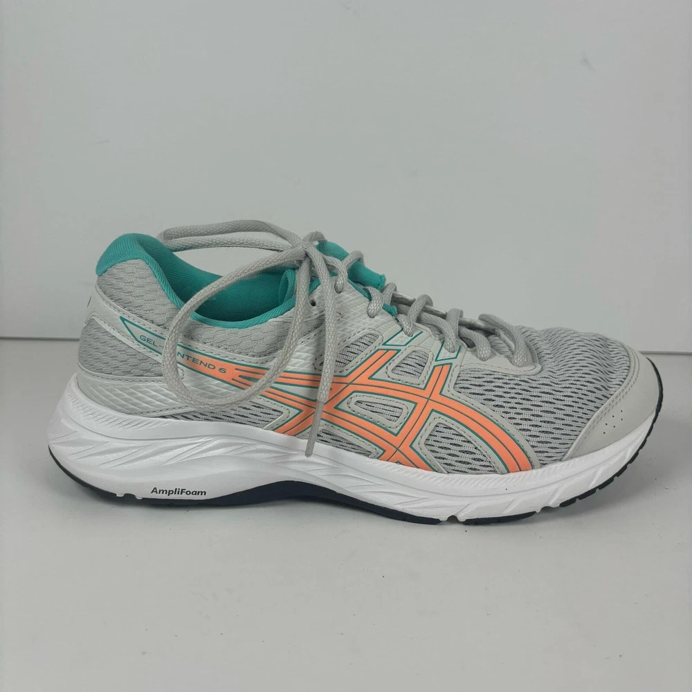 Light grey Asics running shoes, women's size 7.5. Has a little bit of damage on the toe of the left shoe (see pictures) but otherwise they're in great condition has been thoroughly cleaned before listing refer to pics before purchase as all defects are shown