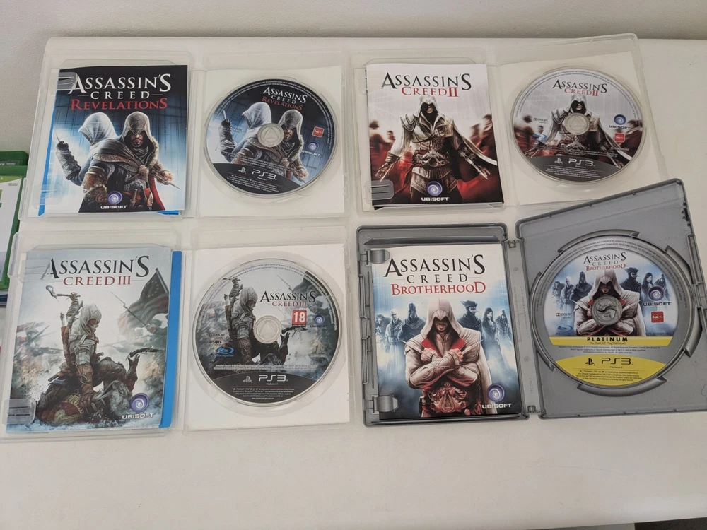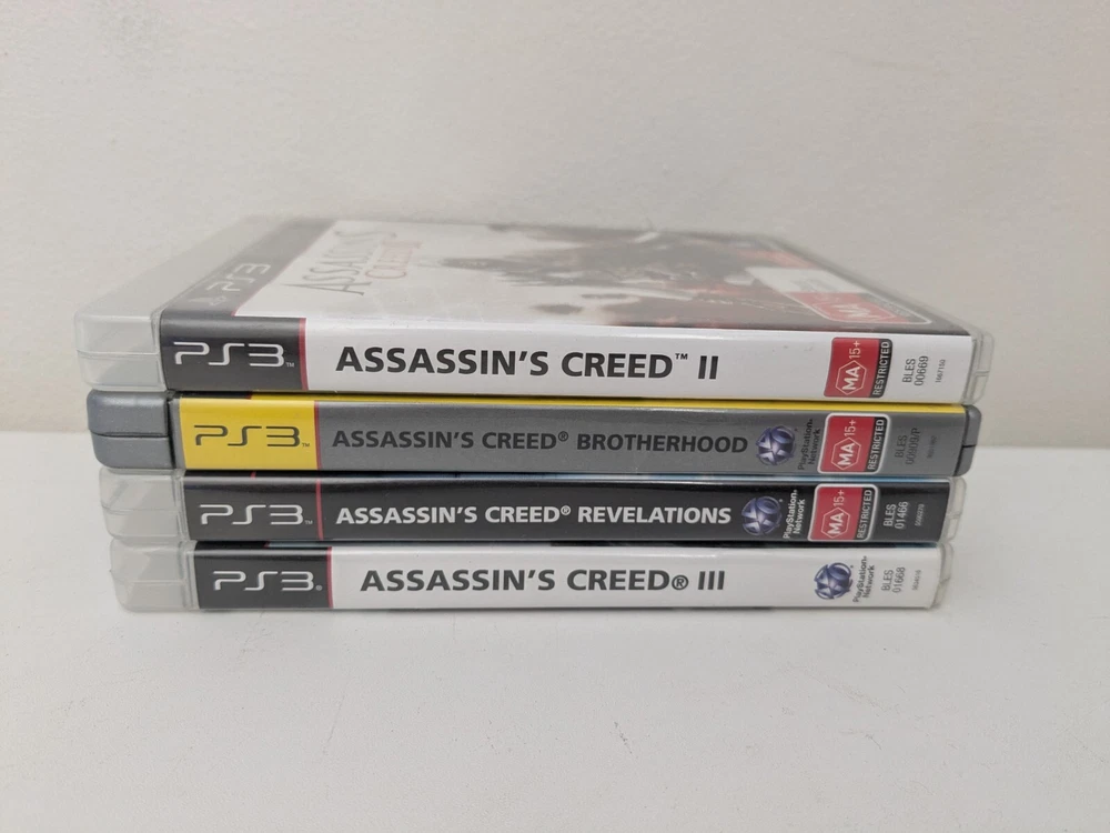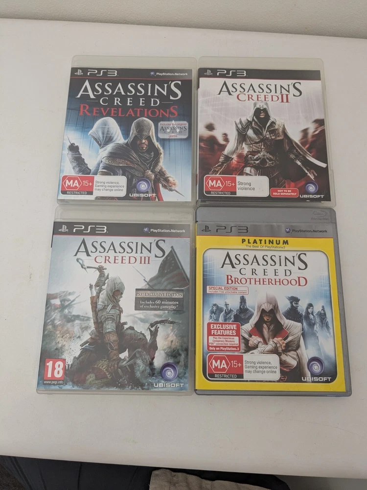 Assassins Creed PS3 Sony PlayStation 3 - 4 x Game Bundle Bulk Lot Complete PAL. Immerse yourself in the thrilling world of Assassin's Creed with this bundle of four games for the Sony PlayStation 3. Join the ranks of skilled assassins and experience intense martial arts combat, captivating role-playing elements, and adrenaline-pumping action and adventure. Published by Ubisoft, this MA 15+ rated collection includes a manual for each game, guaranteeing hours of entertainment for fans of the popular video game series. Get your hands on this complete bundle and dive into the gripping world of Assassins Creed on your PS3.