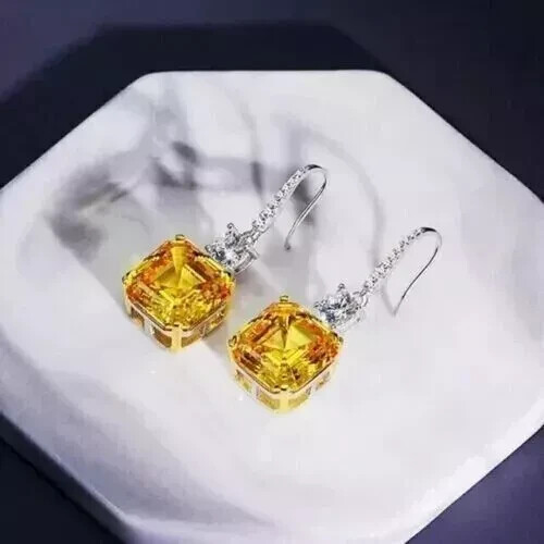 Asscher Cut Simulated Citrine Dangle Earrings in 14k White Gold Plated