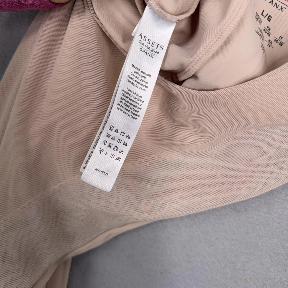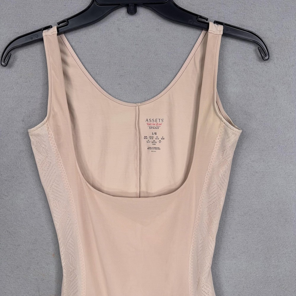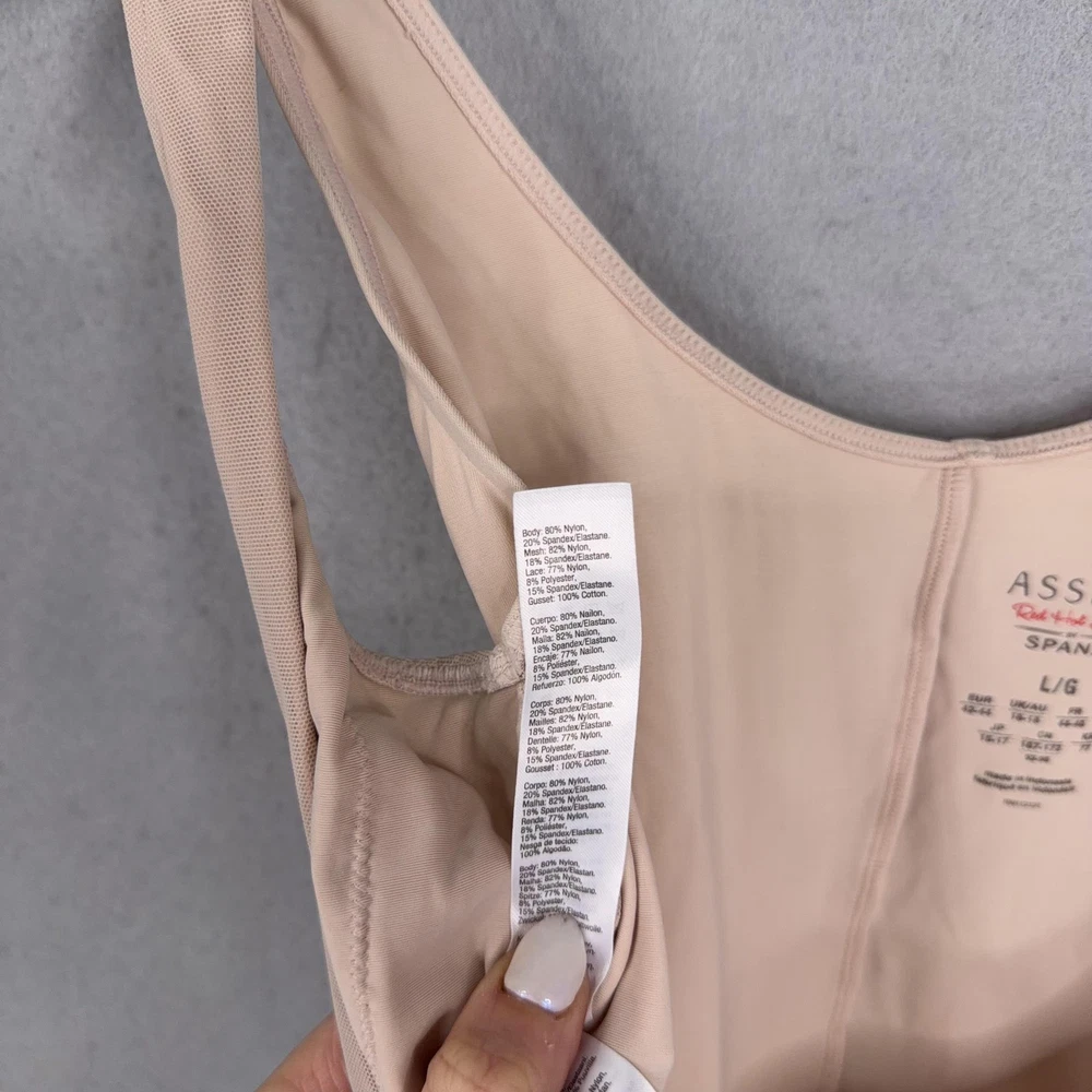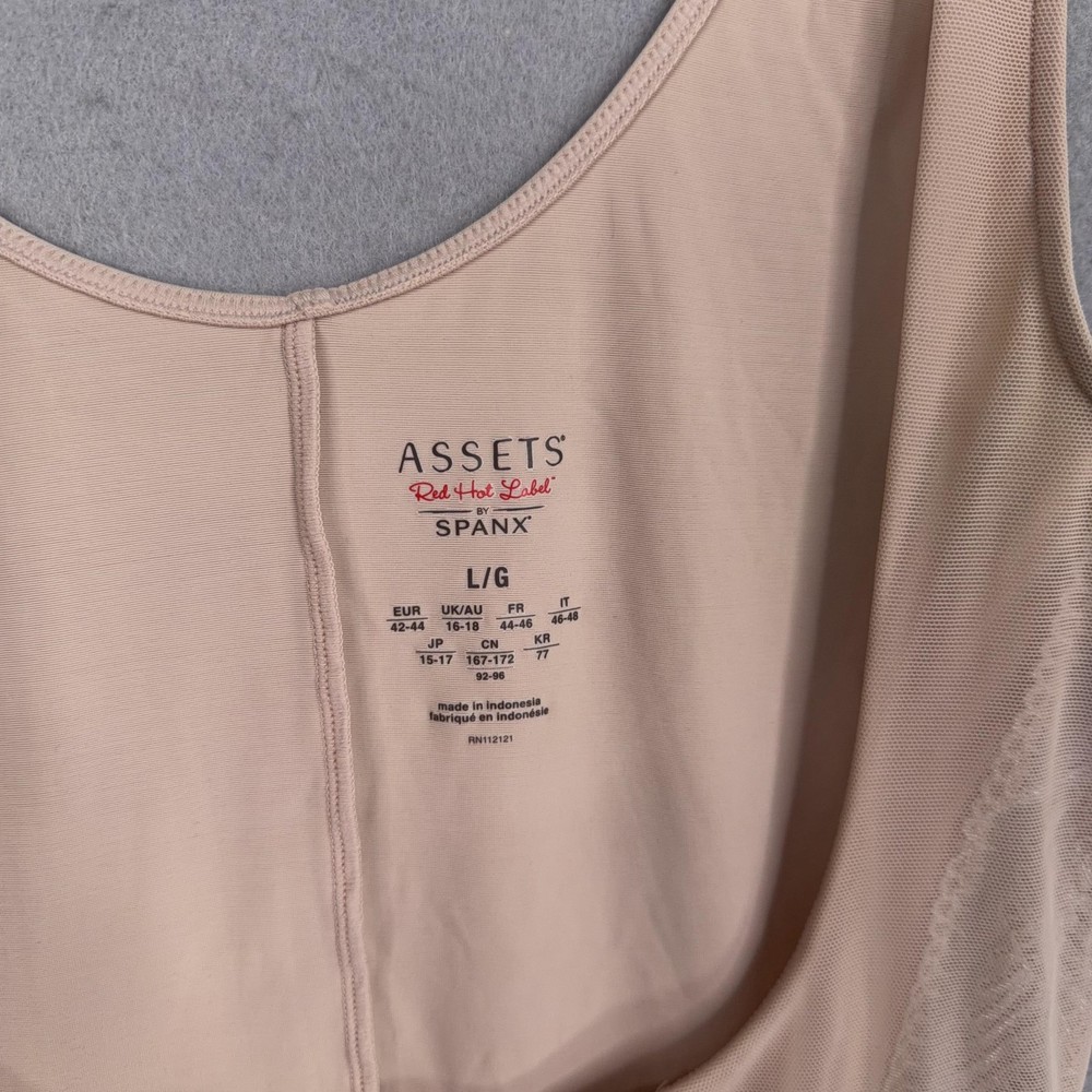 Assets By Spanx Shapewear Bodysuit Womens Large Beige Red Hot Label Mid Thigh Previously worn bodysuit with light overall wear. Fabric and seams intact; no original packaging or hangtags. Brand: Assets Red Hot Label by Spanx. Style: One-piece shaping bodysuit with mid-thigh legs designed to smooth the body under clothing. Color: Beige nude; solid microfiber body with tonal patterned mesh side panels. Department: Womens shapewear; size on tag: Large (L/G) with international equivalents including EUR 42-44 and UK/AU 16-18. Material: Stretch blend including nylon and spandex with cotton in the gusset lining (per care tag). Details: Scoop neckline front and back, wide shoulder straps, smoothing compression fabric, breathable mesh side panels, open gusset for convenience, seamless leg openings for minimal panty lines. Label information: Printed inner label with Assets Red Hot Label by Spanx branding, made in Indonesia; RN 112121. 23950 Measurements: Previous washings may change sizing on the tag. Refer to photos above for all measurements. Compare our measurements to one of your favorite garments. Measurements are approximate. All items are bagged and sealed after being photographed, then stored in a smoke free environment. Washed per eBay standards. I carefully package and ship daily. Contact me with any questions. Thanks