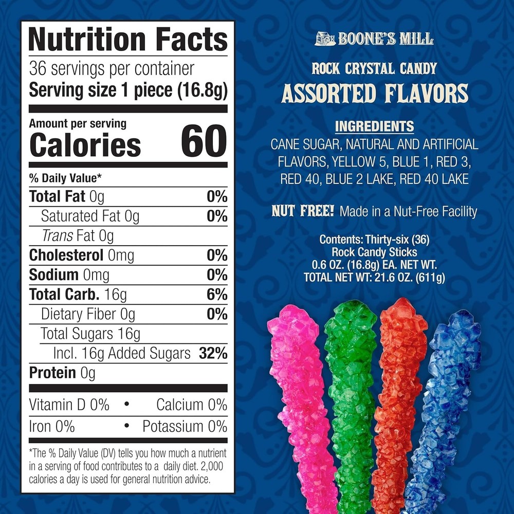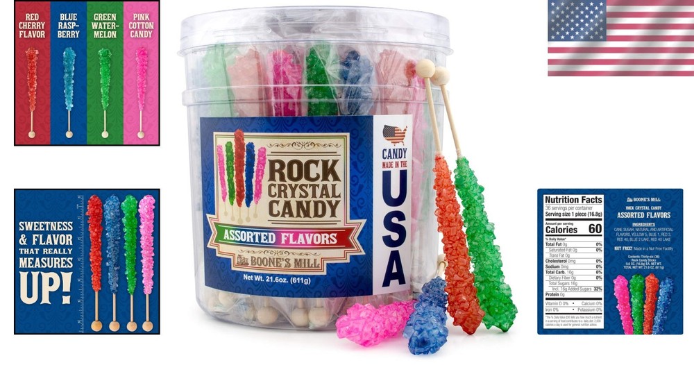 Assorted Flavor XL Rock Candy Sticks – 36 Count Party-Ready Treats – USA Crafted ‹ › ‹ › ‹ › ‹ › ‹ › ‹ › ‹ › ‹ › Assorted Flavor XL Rock Candy Sticks – 36 Count Party-Ready Treats MADE IN USA: Unlike other rock candy, our exquisite treats are proudly crafted in the USA, in Indiana. We cultivate our own sugar crystals with ingredients sourced domestically to ensure that you experience the vibrant sweetness of American quality. Product Highlights: 36 count of assorted flavor rock candy sticks, perfect for parties and celebrations. Stunningly brilliant colored crystals showcased through clear wrappers for an eye-catching display. Ideal for candy buffets, color-coordinating decorations, weddings, and festive events. Flavorful selections include: Pink Cotton Candy, Red Cherry, Blue Raspberry, and Green Watermelon. Nutrition information conveniently included on the tub label for informed indulgence. Large stick sizes ranging from 20-35 grams, making them the largest on Amazon! Why Choose Our Rock Candy Sticks? Bring a sweet touch to your celebrations with our Assorted Flavor XL Rock Candy Sticks! Their vibrant colors and delightful flavors ensure they will charm both adults and children alike. Perfectly fitting for any occasion, these handcrafted treats add a whimsical and colorful centerpiece to your candy buffet or dessert table. You deserve the best; indulge in the nostalgic flavors that evoke smiles and laughter as guests enjoy their sweet confections. With 36 sticks, you'll have ample supply for gatherings, parties, or just a special treat at home. Don't settle for ordinary when you can offer extraordinary - order your Assorted Flavor XL Rock Candy Sticks today and make every occasion even sweeter! Shipping Free & Fast Shipping - We offer free shipping to most of the USA with a normal delivery time of 3-7 days. However, due to the current situation, additional delivery time (up to 3 weeks) may be required for some items. Alternative Carriers - We may use alternative carriers (e.g. USPS, FedEx, UPS, etc.) to ensure your package arrives safely and on time. Due to the use of multiple carriers, we are unable to provide a tracking number automatically. Handling Time - Orders are processed and shipped within 1-2 business days of receiving cleared payment. Shipping Restrictions - Shipping to Alaska, Hawaii, Puerto Rico, Guam, and other US territories may incur shipping charges or delivery restrictions. Please contact us before ordering, or your order can be refunded/cancelled. State Restrictions - There may be restrictions based on your state of purchase. For example, certain items may not be shipped to California due to state regulations. Contact for Tracking Updates - If you require tracking updates or have any concerns about the delivery of your order, please feel free to contact us, and we will be happy to assist you. Return 30-Day Hassle-Free Returns - We want you to be completely satisfied with your purchase. If you are not, you can return the item within 30 days of receiving it for a full refund or exchange. Easy Return Process - To start a return, simply contact us and we will provide you with a prepaid return shipping label and detailed instructions. Restocking Fee - There are no restocking fees for returns. However, the buyer is responsible for return shipping costs if the return is not due to a seller's error. Refund Processing Time - Refunds will be processed within 5 business days of receiving the returned item in its condition. Payment We accept all major credit cards, PayPal, and Apple Pay for your convenience. Your payment information is secure and encrypted to ensure a safe and seamless transaction. Please complete your payment within 3 days of purchase to avoid any delays in shipping. Feedback Your feedback is extremely important to us. We strive to provide the best products and customer service possible. If you are satisfied with your purchase, please take a moment to leave us a positive review. If you have any concerns or issues with your order, please contact us before leaving negative feedback. We are committed to resolving any problems and ensuring your satisfaction. Contact Us If you have any questions or concerns, please feel free to out to our customer support team. You can contact us through the eBay messaging system. We are available Monday to Friday, 9:00 am to 5:00 pm EST, and we will do our best to respond to your inquiry within 24 hours. Buy it now and enjoy a pleasant shopping experience! Expiration Date: Rock Candy Sticks Calories per 100 g/mL: Rock Candy Sticks Course: Dessert Number in Pack: 36 Style: Rock Crystal Candy Unit Quantity: 36 Sticks Flavor: Cotton Candy,Pink Cotton Candy,Red Cherry,Blue Raspberry,Green Watermelon Food Specifications: Gluten Free Allergens: None Product: Boiled & Hard Sweet Shape: Stick Type: Rock Candy Stick Packaging: Box Calories per Serving: Less Than 50 Number of Servings: 36 Serving Size: 20-35 Grams Occasion: Party Item Weight: 1.35 pounds