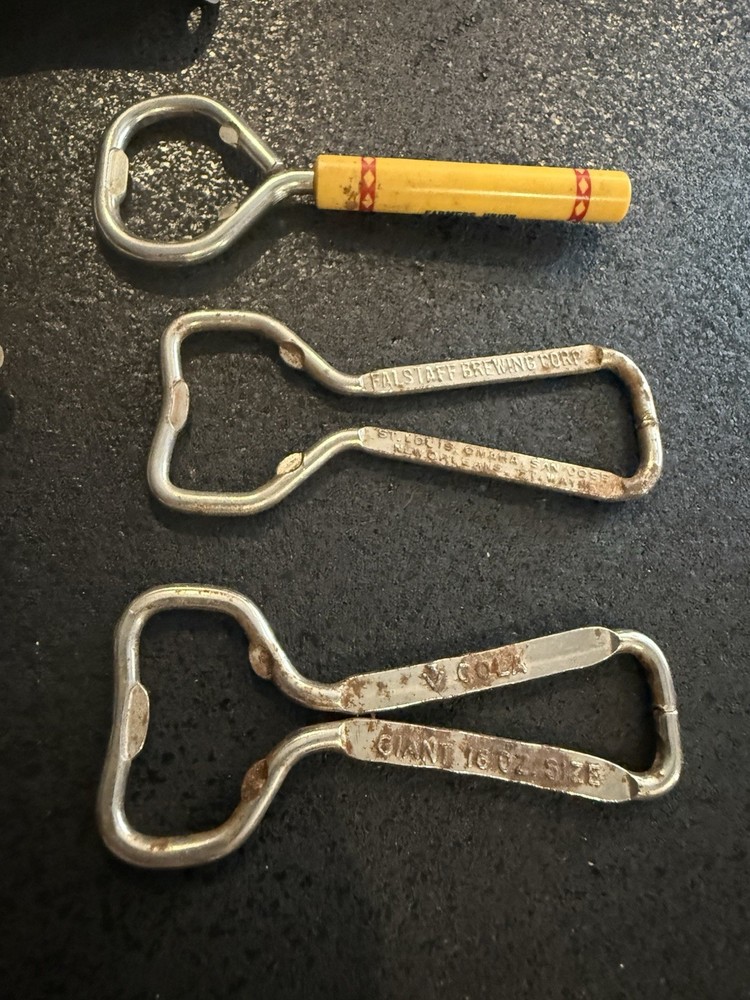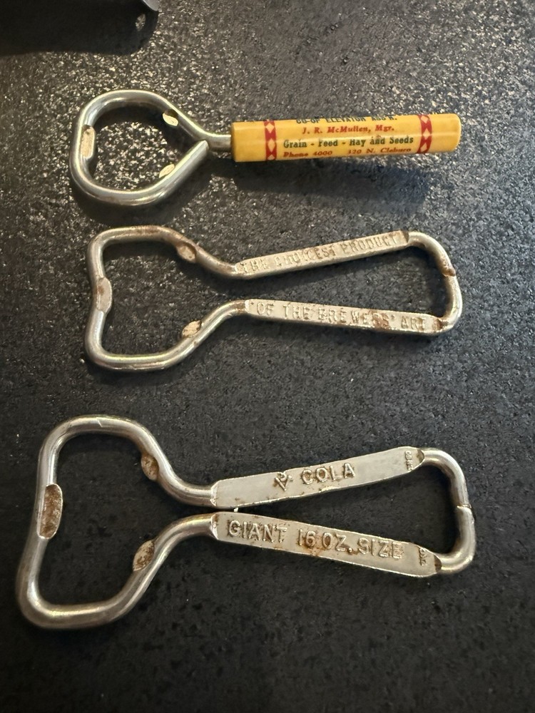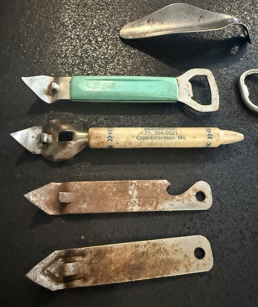 The product is an assortment of 7 vintage bottle and can openers with advertising, perfect for collectors of breweriana items. Each opener features unique designs and branding, adding to the charm and nostalgia of any collection. These openers are sure to be conversation starters and fun additions to any home bar or man cave. The openers advertising companies such as 3V Cola (Vim, Vigor and Vitality), Falstaff Brewing Corp, Farmers Union CO-OP Elevator ASS’N Grand Island Nebr, H.A.R.A. - Everett, PA. (Hobby Auto Racing Association), Cape Mercantile Bank & Trust Co Cape Girardeau, MO, Miller Brewing Co, and Coleman Cooler.