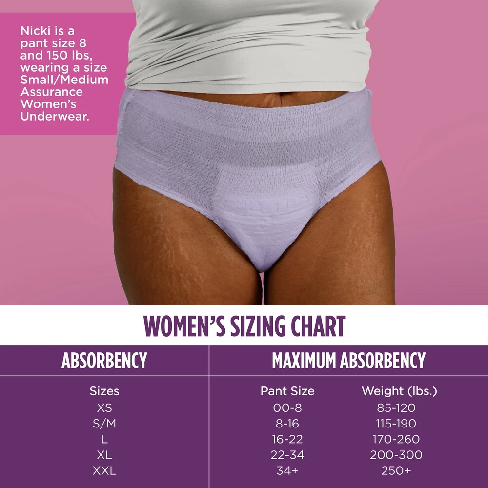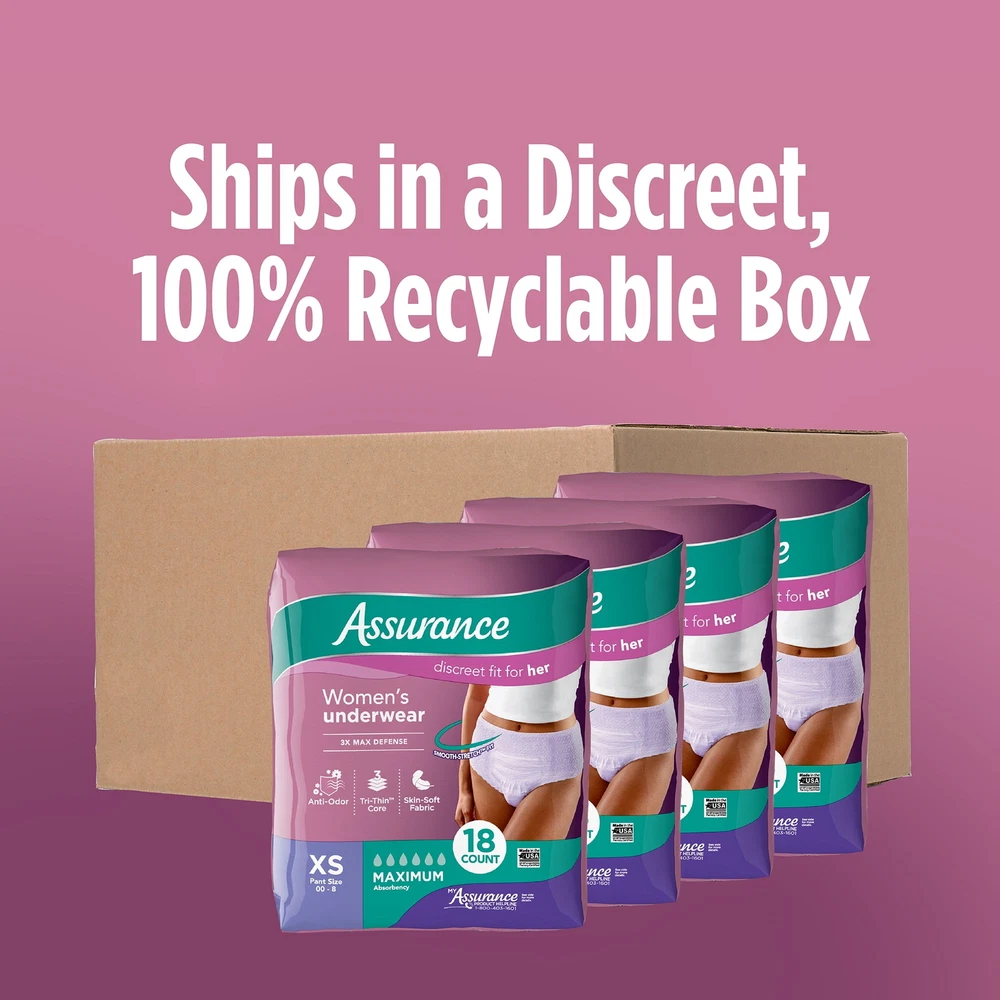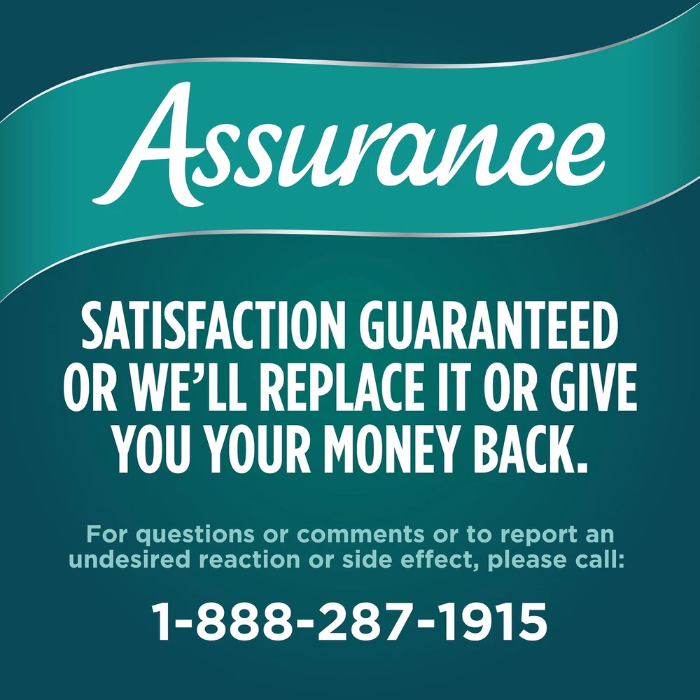 Rest Assured with Assurance At Assurance, we believe bladder leakage shouldn't disrupt your daily life. That's why we thoughtfully designed our Assurance Incontinence & Postpartum Underwear for Women with your maximum discretion and protection in mind. Unlike ordinary adult diapers, our smooth-stretch fit contours to your body and our unique skin-soft 100% breathable material make for an underwear-like fit and feel you can depend on. Assurance Incontinence & Postpartum Underwear for Women are designed with a unique Tri-Thin ™ absorbent core and anti-odor feature helps keeps you feeling comfortable for up to 8 hours - that is a full work day! Made with you in mind, Assurance Underwear for Women helps you feel comfortable and dry while living your active, on-the-go lifestyle. Assurance for All! Available in sizes Extra Small, Small/Medium, Large, Extra Large and Extra Extra Large we believe in providing you the best value for your products no matter what size you are in. Our smooth-stretch fit provides a full coverage design made for your body shape and comfort. 72 count contains 2 bags of 36. *when the moisture barrier is tested alone On Aug 19, 2024 at 05:23:09 PDT, seller added the following information: