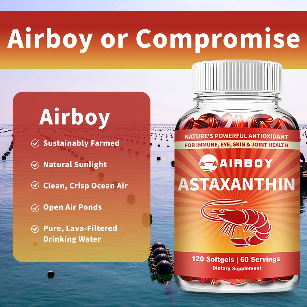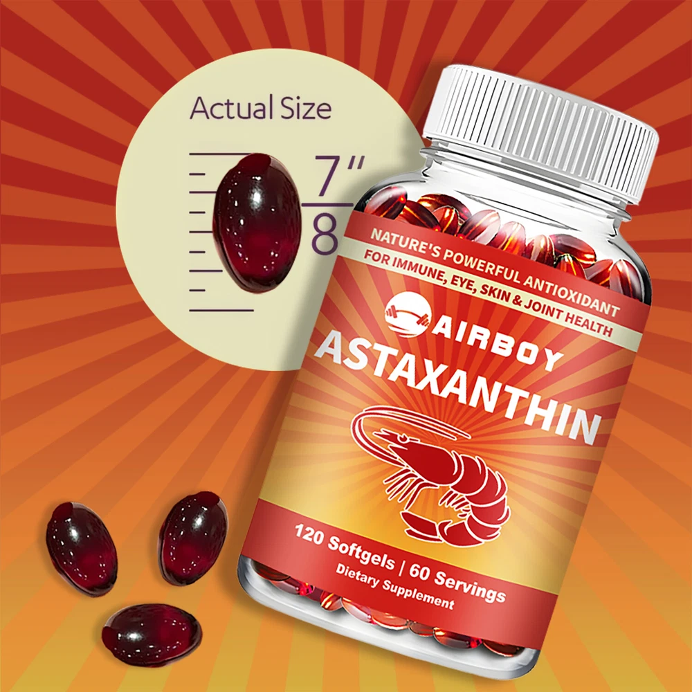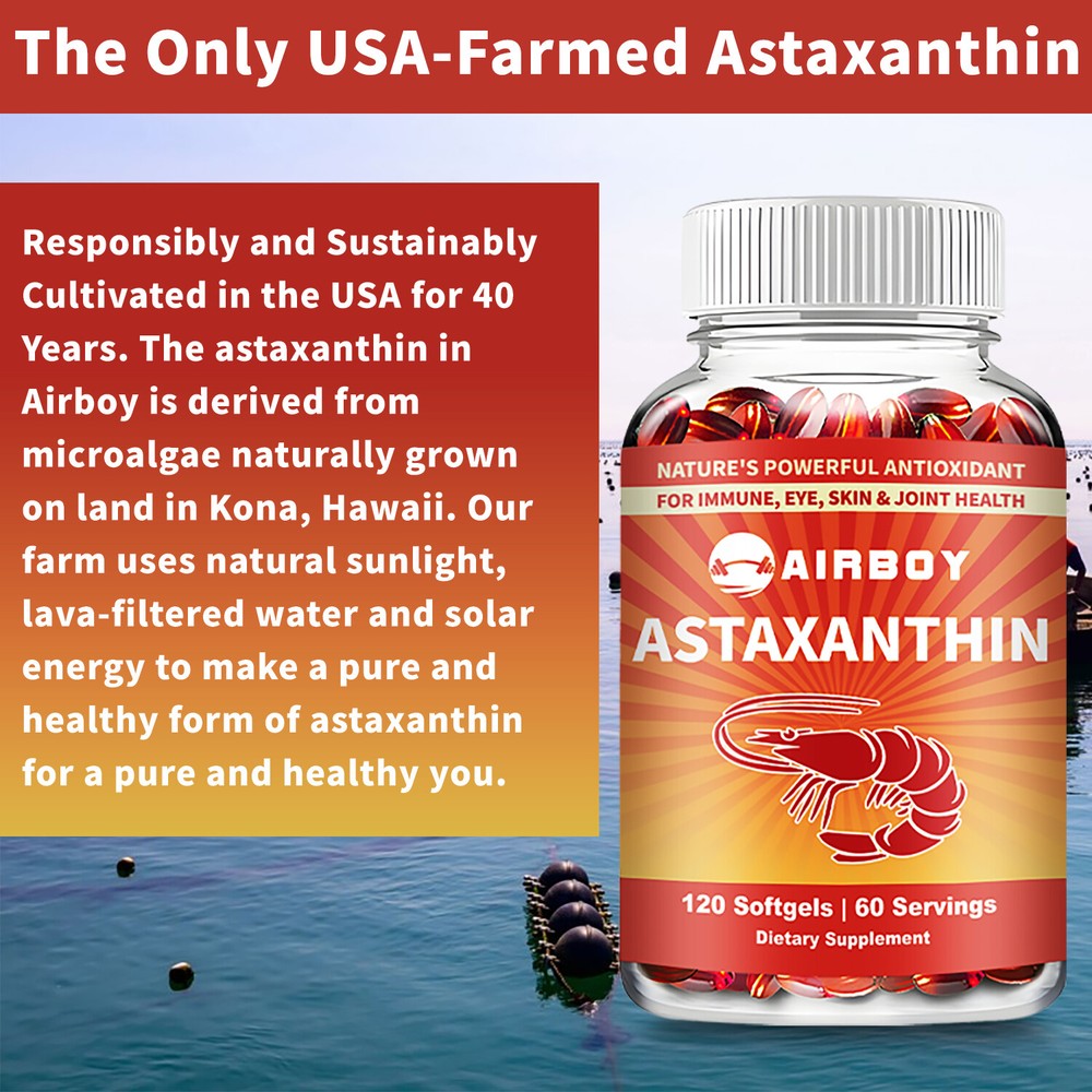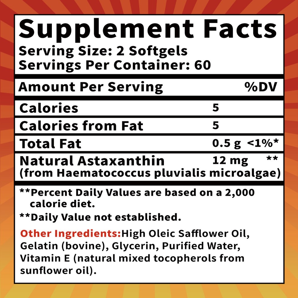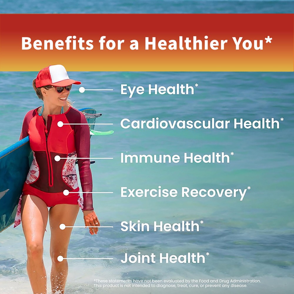 Effects: Anti-oxidation, Anti-aging, Heart Health Ingredients: Astaxanthin Directions: Take 2 capsules once daily after a meal. Shipping: Ships within 48 hours on working days. Shelf life: 2 years Description: ANTIOXIDANT ACTIVITY: Astaxanthin is a natural, potent carotenoid that supports antioxidant activity and is made from pure, concentrated Icelandic algae Astalif, making it one of the most effective formulas available. SKIN AND EYE HEALTH SUPPORT: Cold-pressed with organic coconut oil for a superior experience that supports cell, skin and eye health. Sustainably Sourced: Our astaxanthin is sustainably sourced and produced using clean geothermal energy methods that reduce energy consumption by 50%. Our products are manufactured in the USA in a GMP compliant facility using only the highest quality and international ingredients. Document