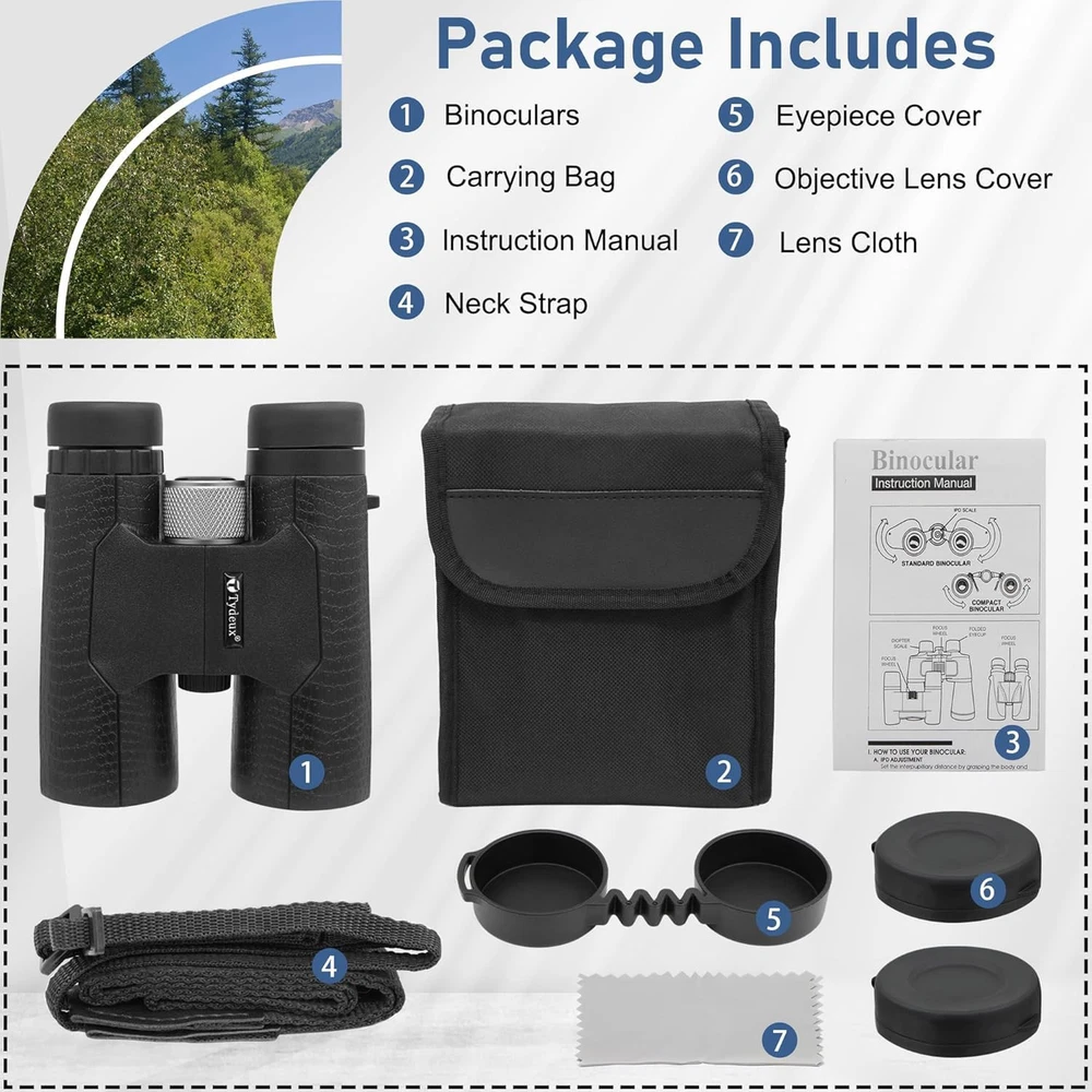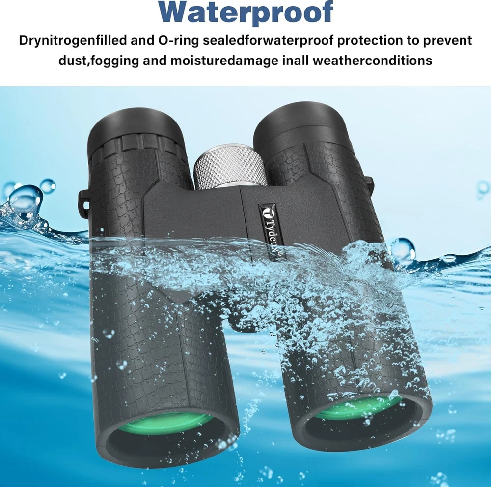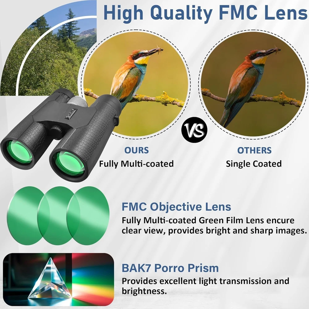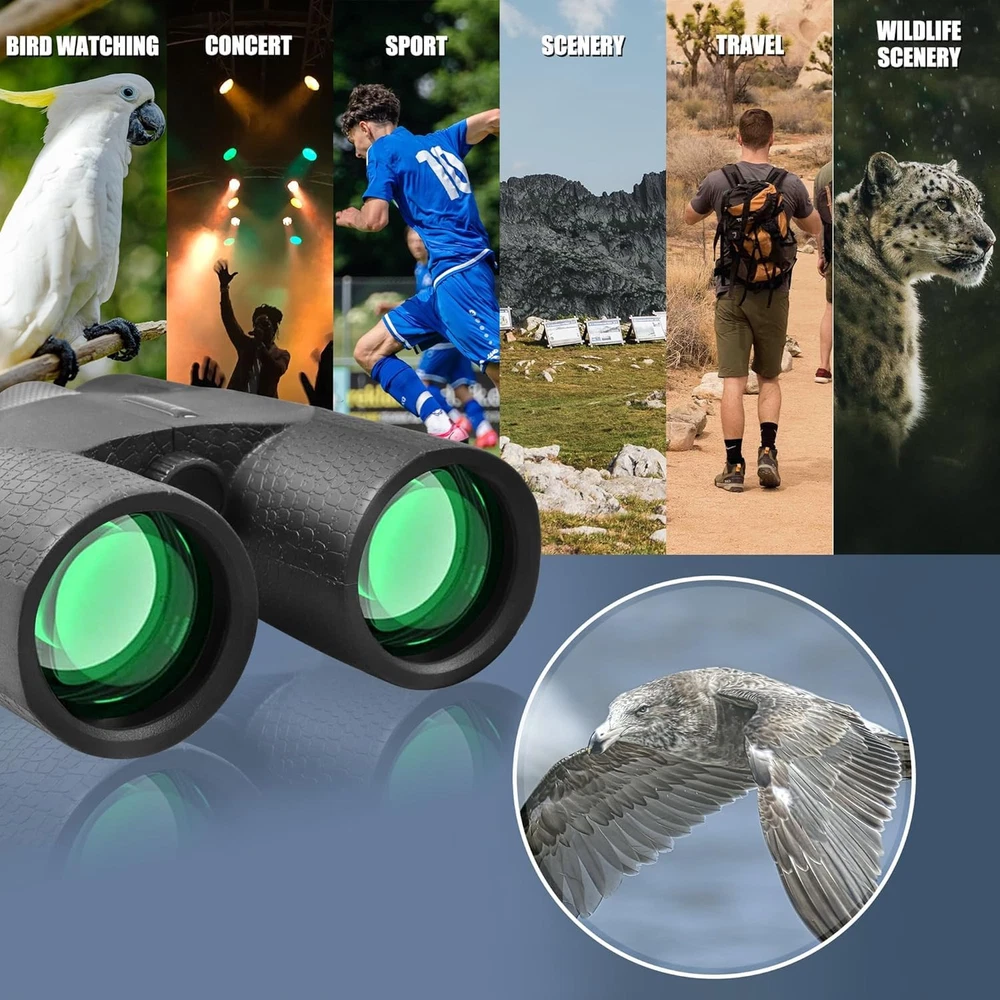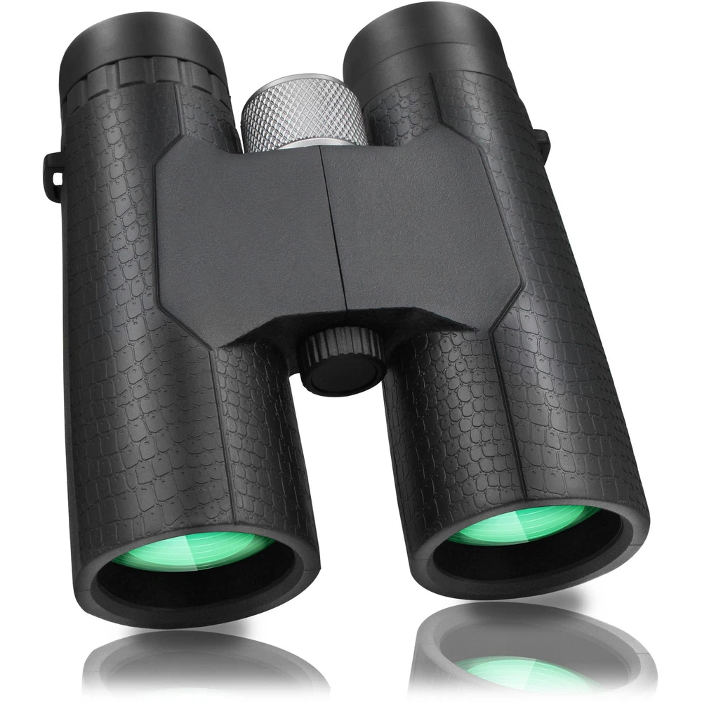 High Powered Large Eyepiece Binoculars: This binoculars has 10 x magnification; 42 mm objective lens and wide field of view 288 ft 1000 yds; letting you look farther and see wider Coating with premium BAK7 prism; it ensure imaging verisimilar Adjustable Eye Cups: The binocs can be pull down the rubber eyepieces and more fit the glasses wearer; getting close to lens and see easily; for those who do not wear glasses; will gain more focused slight and feel more easeful through rising eye cups Resistant Comfortable Touch: The rubber armor ergonomic design and steady grip allows for accurate focusing and have shock-resistance; antiskid features; rugged construction rubber eye relief provides comfort for spectacle wearers Portable Compact Binoculars Design: One hand can be mastered when you use the birding binoculars for opera bird watching camping traveling wildlife watching football game cruise or other outside activity Good Gifts: These binoculars are fully competent and able to work for bird watching; hunting hiking travel sports events theater and concert. also ideal great gifts