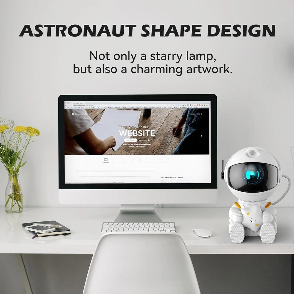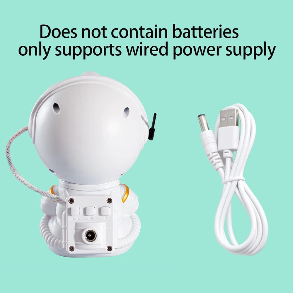 Astronaut Galaxy Projector, Star Projector Galaxy Light, Night Light for Kids, Nebula Ceiling LED Lamp, Room Decor, with Timer and Remote, Gifts for Birthdays 【Astronaut Galaxy Projector】: This night light projector has up to 8 stunning nebula effects, accompanied by green stars, projected onto the wall or ceiling is a good choice for room decoration, creating relaxing and comfortable star lights for bedroom, ideal for home theater, date night, or enjoying falling asleep under the stars and many other uses 【Remote Control and Timer】:The star projector has two control methods: buttons on the back and remote control. You can adjust the switch between nebula mode and starlight mode, the color and brightness of nebula, and the flickering frequency of stars. Stars or nebula patterns can be used together or individually. In addition, you can set the timer for 60 or 120 minutes, and it will automatically turn off when the set time is reached. 【Innovative design unique appearance】:This nebula projector adopts the astronaut's appearance design to echo the theme of the Milky Way, bringing you a dreamlike visual effect. The astronaut's head supports 360° rotation, which is easy to adjust the nebula projection angle, and can be projected anywhere in a fixed position Unrestricted, not only an astronaut star projector, but also a good looking decoration. 【Multi-purpose scene use】: This galaxy light projector can be used as bedside night light, bedroom atmosphere light, car atmosphere light, game room decoration light, home theater atmosphere light, desk computer desk decoration. You can use the astronaut projector in bedroom, kids room, living room, game room, home theater, inside the car, valentine's day date, Christmas, wedding and party, tent, etc. 【Perfect Gift】: Give this astronaut light projector as a gift (Birthday, Christmas, Valentine's Day) to your family or friends, whether it's your cute kids, or adults who just want to relax, believe who No one can refuse to fall asleep under the stars. If you have any questions about our products or encounter any problems during use, please contact me by , we will solve all Night light This astronaut night light projector has seven kinds of galaxy changing effects and green stars, the head supports 360° rotation, and can be projected anywhere in a fixed position. Notes: 1. The product has an overheating protection mechanism. Avoid using it in high temperatures. Failure to do so may trigger the protection mechanism and cause the product or some functions to stop functioning. (Recommended operating temperature: 50°F - 113°F) 2. The remote control does not include batteries. Buyers must provide their own AAA batteries. The remote control will not function without batteries installed. 3. The Astronaut has four levels of brightness adjustment, which can be adjusted using the remote control based on ambient light.