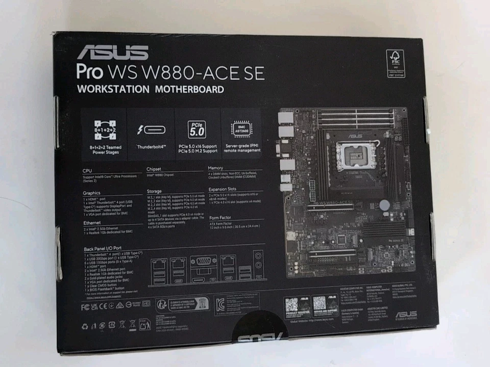 ASUS Pro WS W880-ACE SE Intel® Core™ Ultra Processor (Series 2) LGA 1851 ATX Motherboard, 8+1+2+2 Power Stages, PCIe® 5.0 Ready for Next-gen GPUs, DDR5, Thunderbolt™ 4 Type-C®, 2X 2.5 GbE LAN, 4X M.2 Brand ASUS CPU Socket LGA 1851 Compatible Devices Personal Computer RAM Memory Technology DDR5 Compatible Processors Supports Intel® Core™ Ultra Processors (Series 2) , LGA1851, Supports Intel® Turbo Boost Technology 2.0 and Intel® Turbo Boost Max Technology 3.0 Supports Intel® Core™ Ultra Processors (Series 2) , LGA1851, Supports Intel® Turbo Boost Technology 2.0 and Intel® Turbo Boost Max Technology 3.0 Chipset Type Intel W880 Memory Clock Speed 9066 MHz Platform Windows 10, Windows 11 Model Name Pro WS W880-ACE SE CPU Model About this item Ready for advanced AI PCs: Designed for the future of AI computing, with the power and connectivity needed for demanding AI applications Intel LGA1851 socket: Ready for Intel Core Ultra 9, 7, and 5 desktop processors Robust performance: 8+1+2+2 teamed power stages, ProCool II power connectors, high-quality alloy chokes and durable capacitors Future-proofed connectivity: 1 x Thunderbolt 4 ports, dual 2.5 Gb Ethernet, two PCIe 5.0 with full support for next-gen GPU, and one PCIE 5.0, three PCIe 4.0 M.2 slots and a USB 20Gbps front-panel header Exclusive AI and overclocking technologies: AI Cooling II, AI Advisor, and NPU boost DIY-friendly design: SafeSlot, M.2 Q-Latch, BIOS FlashBack, Q-Connector, Q-CODE Server-grade IPMI remote management: Hardware and software-level with a dedicated LAN port link to AST2600 BMC controller, plus a real-time monitoring and management software – ASUS Control Center Express. TUV GREEN MARK Certification Windows 11 (22H2 & later), Windows 10 64-bit(21H2 & later) From the brand ASUS ProArt Collection Previous page ProArt Motherboards Visit the Store ProArt Graphics Cards Visit the Store Intel Core Ultra 5
