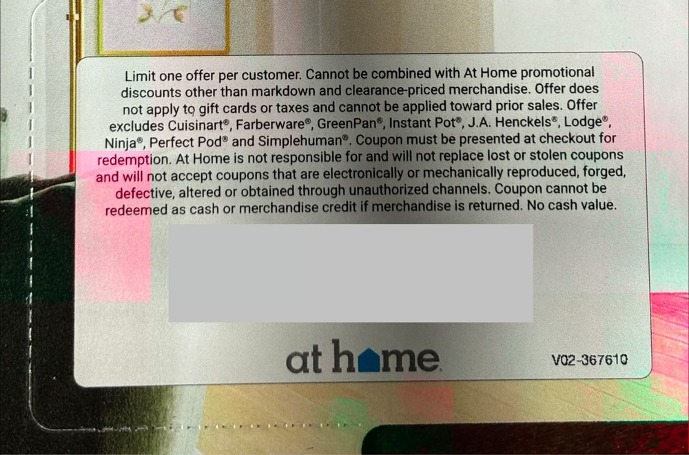 At Home 15% Off Coupon In Store And Online Full Priced Items Valid 2/16/2026 through 4/1/2026. Limit one offer per customer. Cannot be combined with At Home promotional discounts other than markdown and clearance-priced merchandise. Offer does not apply to gift cards or taxes and cannot be applied toward prior sales. Offer excludes Cuisinart®, Farberware®, GreenPan®, Instant Pot®, J.A. Henckels®, Lodge®, Ninja®, Perfect Pod® and Simplehuman®. Coupon must be presented at checkout for redemption. At Home is not responsible for and will not replace lost or stolen coupons and will not accept coupons that are electronically or mechanically reproduced, forged, defective, altered or obtained through unauthorized channels. Coupon cannot be redeemed as cash or merchandise credit if merchandise is returned. No cash value. TO CLARIFY, THIS IS NOT JUST VALID ON ONE ITEM. IT’S VALID ON ALL FULL-PRICE ITEMS MADE IN ONE ENTIRE TRANSACTION! Below are just a few examples of how much this 15% off coupon could realistically be worth. The larger your purchase of regular priced items, obviously, the larger the savings amount. Amount spent. Amount saved with 15% Coupon. $100. $15 $300. $40 $500. $75 $1000. $150 $1500. $225. $2000. $300. Buyer pays shipping or I dm it to you for online shopping after purchase. Thanks and happy shopping!