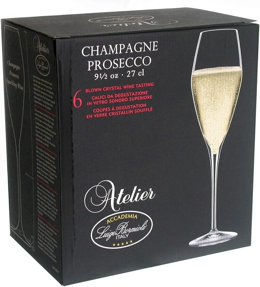 Atelier oz Champagne Glasses, Set of 6, Clear Measures 3”DIA X 10”H ”LBs oz wine glasses come in a set of 6 Enhance superior aroma diffusion - High-Tech blown lead-free crystal glass, is break resistant and dishwasher safe. Before Your First Use: Remove all labels from your glassware. Wash the glasses in warm water using a gentle, non-abrasive dishwashing detergent or place directly in your dishwasher. Rinse and dry immediately with a lint-free towel or cloth Titanium Reinforced - Permanent anti-abrasion treatment applied directly to the glass’ stems to increase resistance to breakages Special treatment and/or accentuated epicure (indentation) create extra persistent flow of bubbles is applied Fine, reinforced and laser cut rims Pulled stems do not have any mold seams and are highly flexible Made in Italy Like all collections, Atelier embodies Italy's gusto for the good things of the earth: our wines and foods that are uniquely Italian, but loved the world over. An extensive collection of graceful glasses whose angled bowls add interest to the design and more surface for refracting light through beverages. Atelier stemware is machine blown in Parma Italy and made in 's proprietary material. produced glassware is an exciting fusion of elegance and technology. In addition to having ideal bowl shapes, fine rims and beautifully drawn stems, glassware made in is extremely brilliant in color, has a beautiful sound, maintains its clarity after thousands of industrial dishwashing cycles and possesses an extremely high level of durability. The stems are also reinforced with titanium.