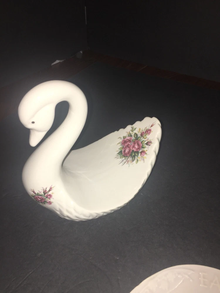 Athena made in USA white ceramic swan with colored flowers