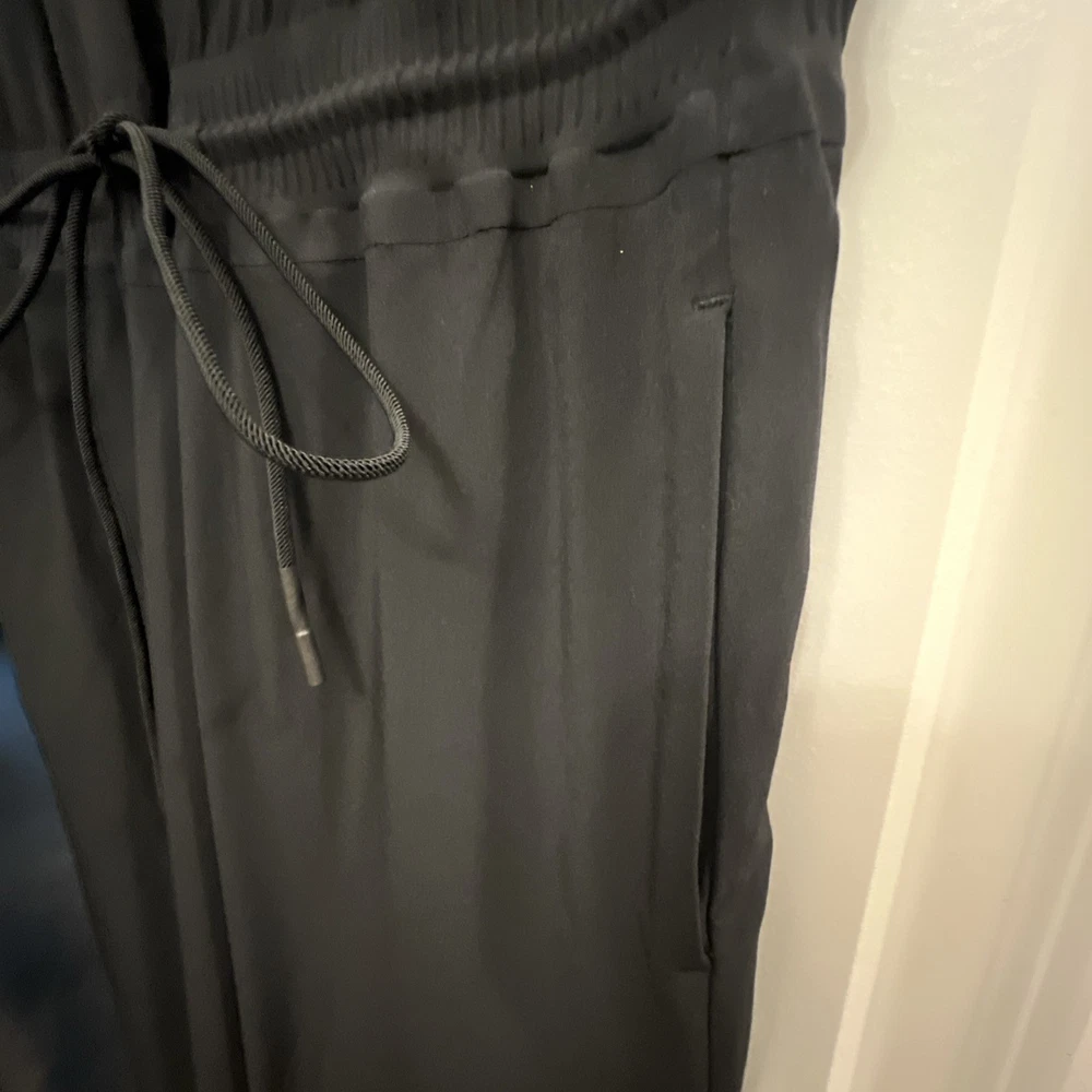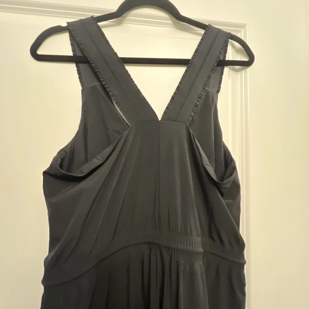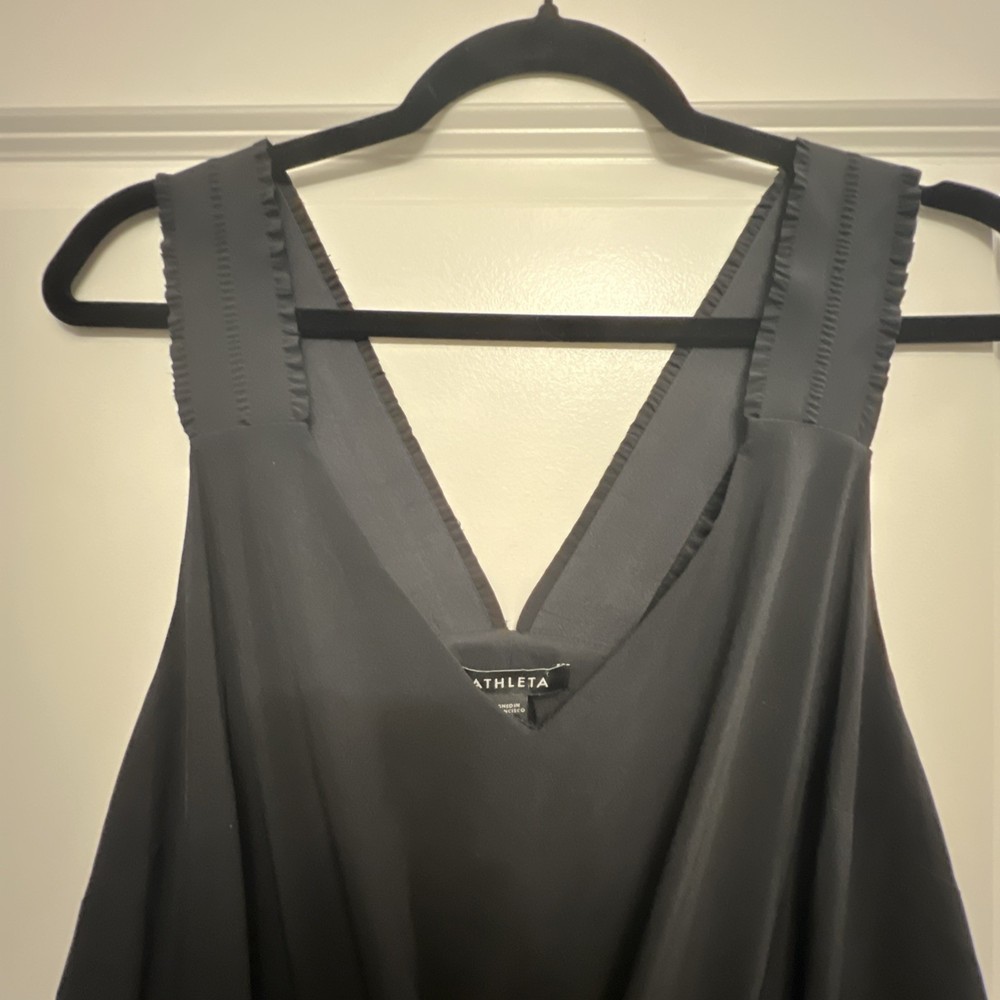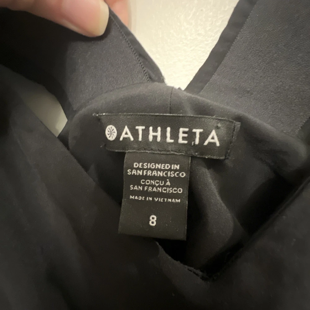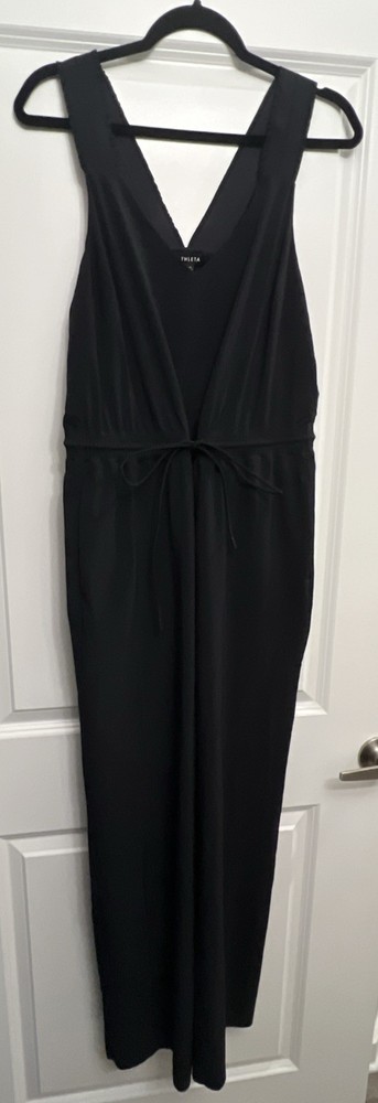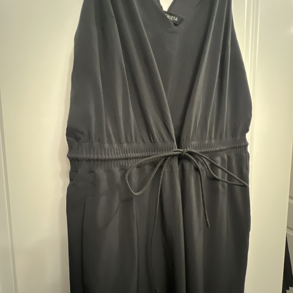 The Athleta Black Savannah Jumpsuit Romper in size 8 is a versatile and stylish one-piece outfit perfect for various occasions such as travel, activewear, casual outings, and workwear. Made from lightweight and breathable fabric, this jumpsuit features a V-neckline, pull-on closure, and relaxed fit. The sleeveless design and straight leg style make it suitable for warm weather in summer, fall, and spring. With accents like a drawstring detail and convenient pockets, this jumpsuit by Athleta is both sustainable and fashionable, making it a great addition to any woman's wardrobe.