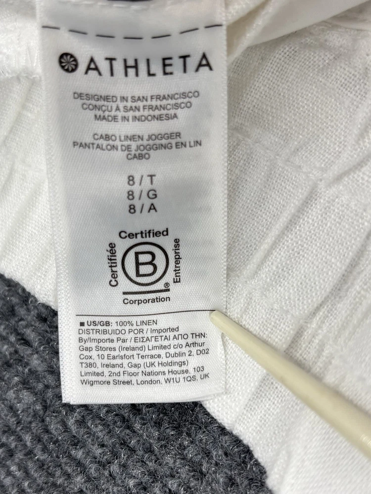 Brand: Athleta Occasion: Casual, Travel, Activewear Color: White Country/Region of Manufacture: Indonesia Pattern: Solid Leg Style: Tapered Season: Summer, Spring, Fall, Winter Size: 8 Tall Material: Linen Inseam: 30 in Closure: Pull On Features: Pockets, Elastic Waist, Lightweight, Adjustable Waist, Breathable, Comfort, Easy Care Size Type: Tall Department: Women Type: Pants Fit: Athletic Style: Jogger Theme: Athleisure, Beach, Outdoor, Bohemian, Classic, Nature, Nautical, Preppy, Tropical Waist Size: 30 in Garment Care: Machine Washable Performance/Activity: Walking, Beach, Cheerleading, Weightlifting, Yoga