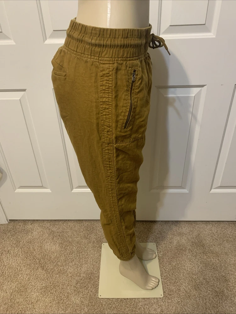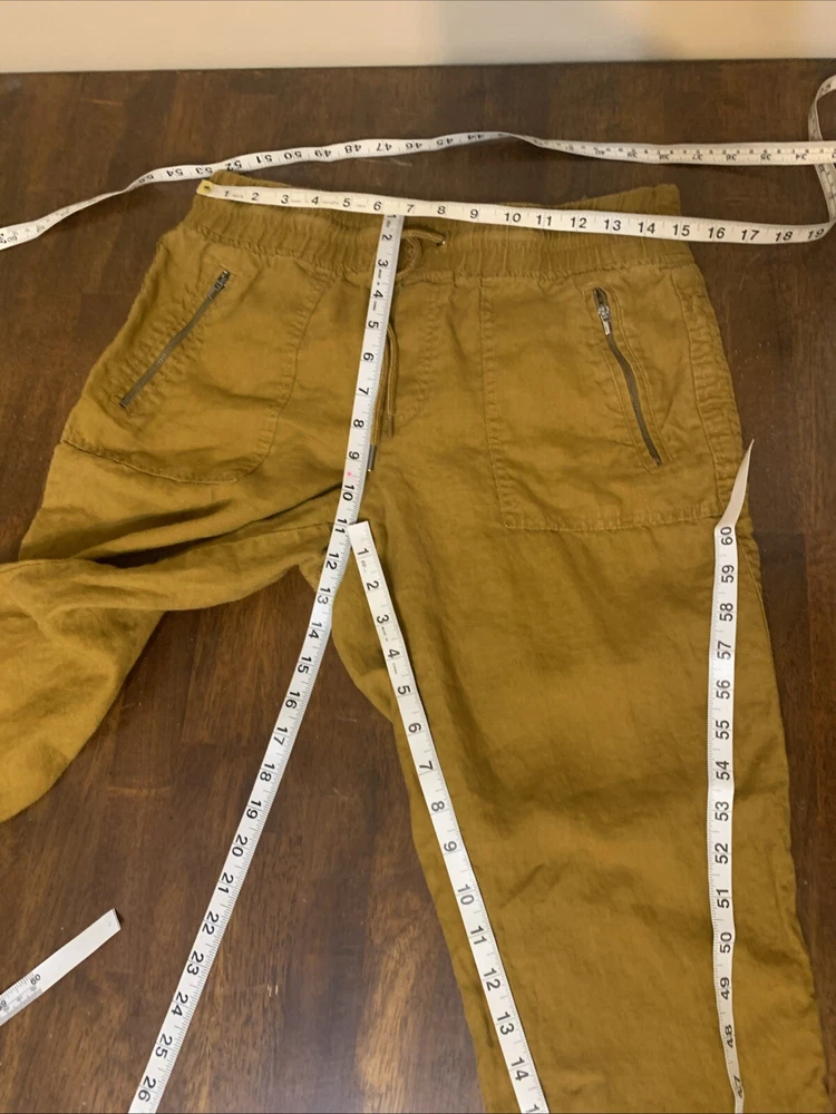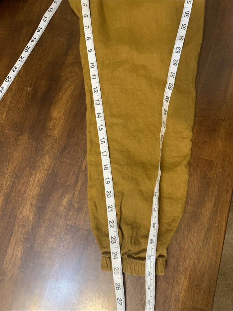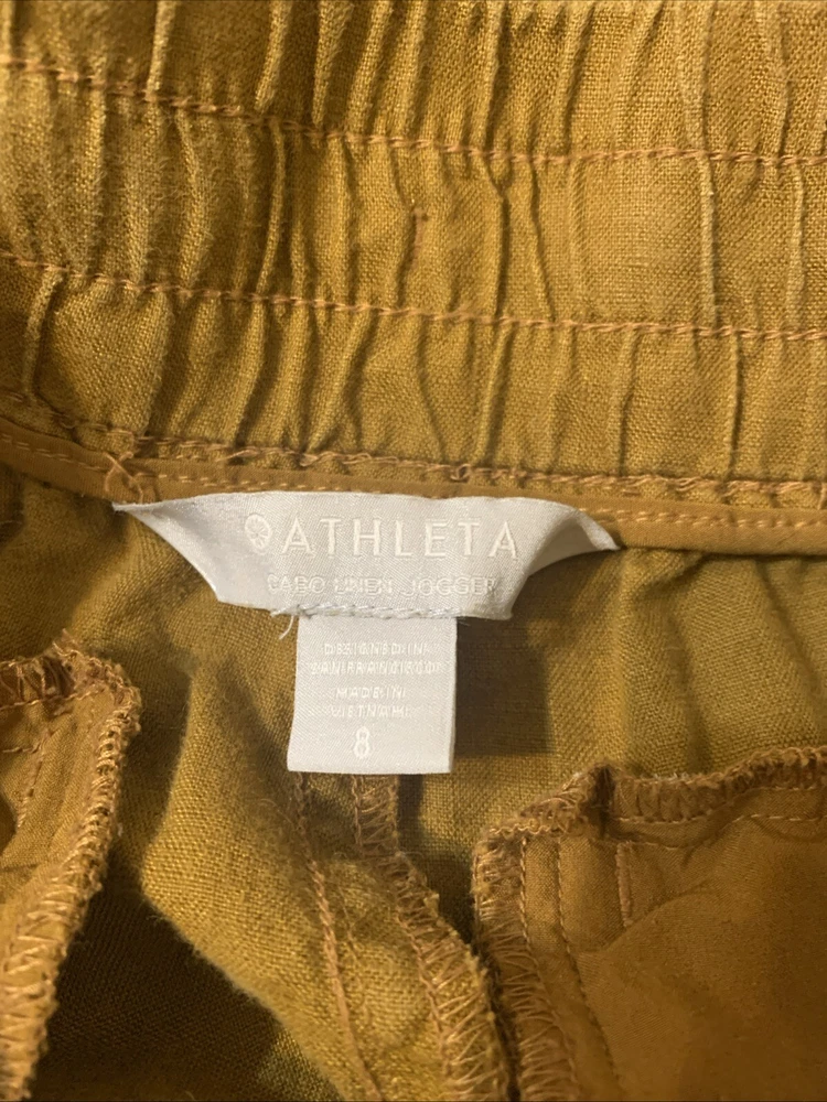 This is a pair of Athleta Cabo Linen Jogger pants in size 8, designed for casual wear. The pants come in a solid brown color and feature a drawstring closure for an adjustable waist. Made from lightweight linen fabric, they have a tapered leg style with a 27-inch inseam. The joggers are perfect for activities like walking, cycling, and hiking during the summer, fall, or spring seasons, offering comfort and style with an elastic waist and pockets for added convenience.