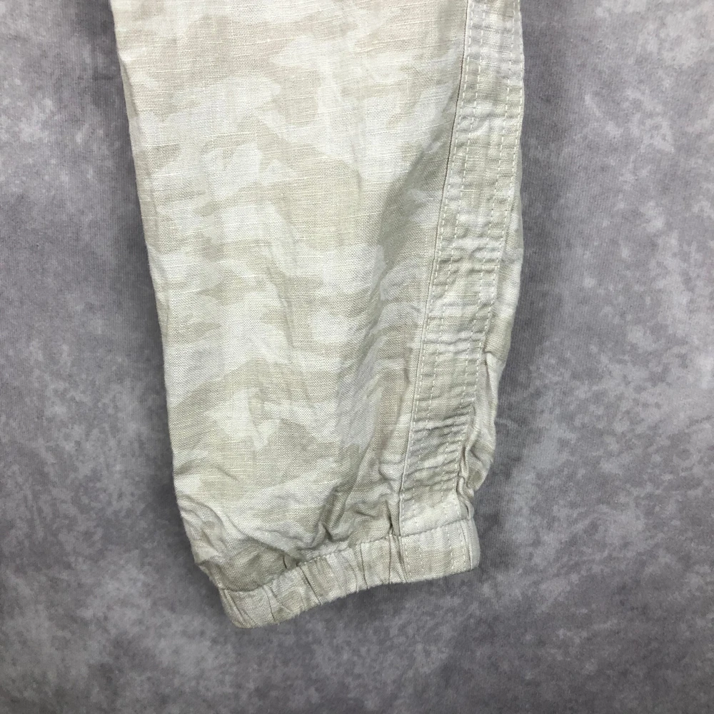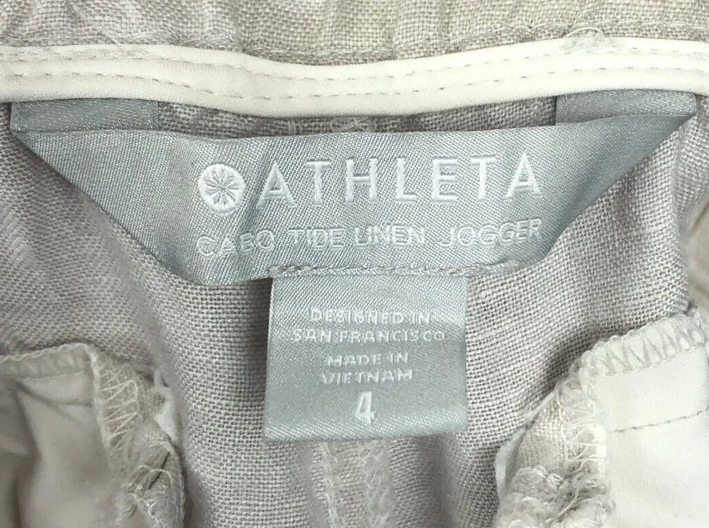 Athleta Cabo Tide Linen Camo Jogger Pants Size 4 Front zipper pockets. Drawstring. Elastic waist band. Back pockets. 100% linen Measures approximately: Waist 30" (unstretched & untied) Inseam 28" Excellent preowned condition. (N)