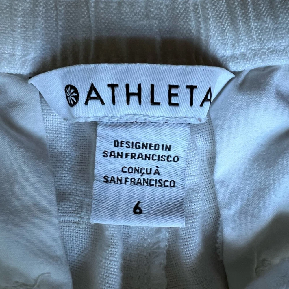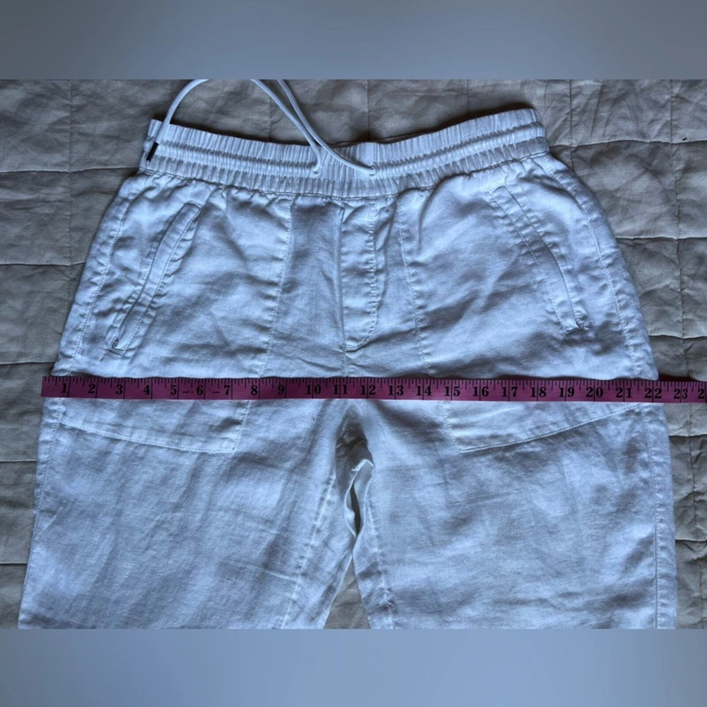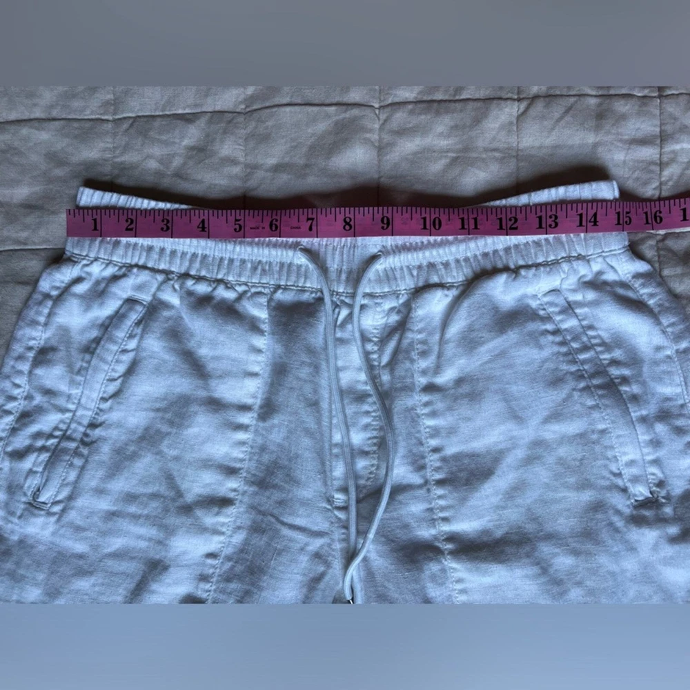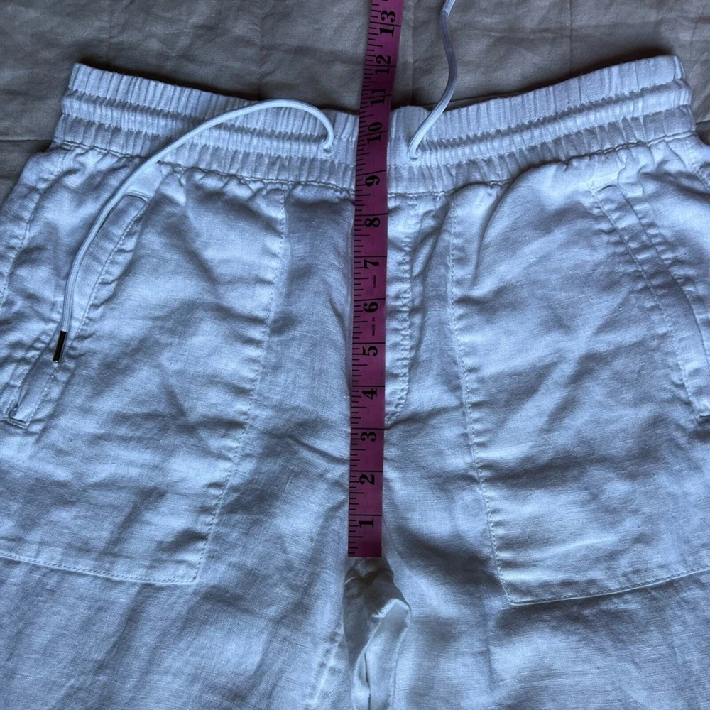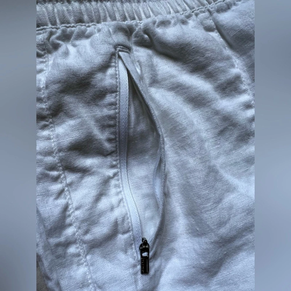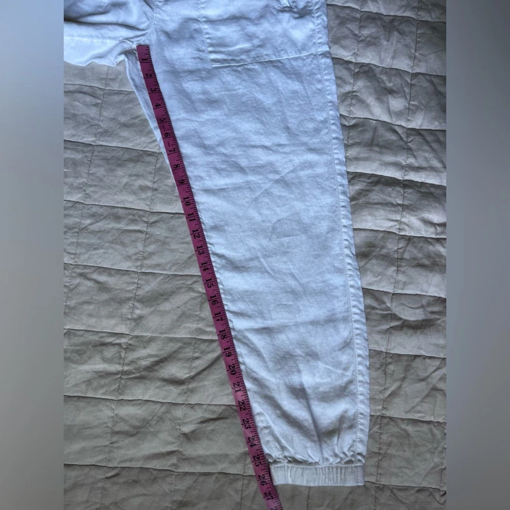Athleta Cabo White Linen Jogger Pants Beachy Lagenlook Resortwear Casual - 6 Excellent like new condition. no flaws. Features High rise, elastic waist with drawstrings Zippered front pockets Faux pockets on back 100% linen Measurements & fabric details in photos Send me an offer or bundle to save :) let me know if you have any questions! Tags Coastal vacation summer spring leisure casual closet staple