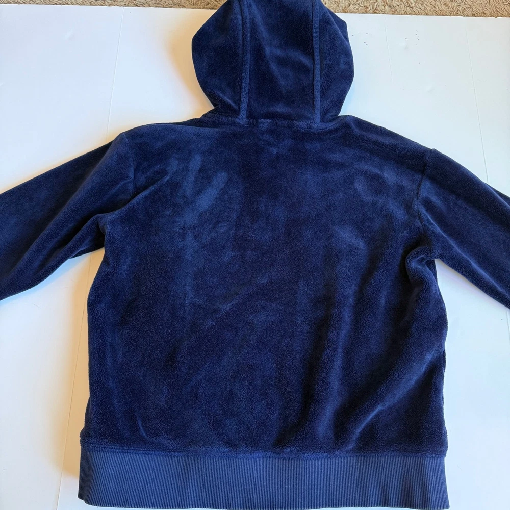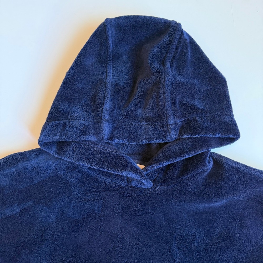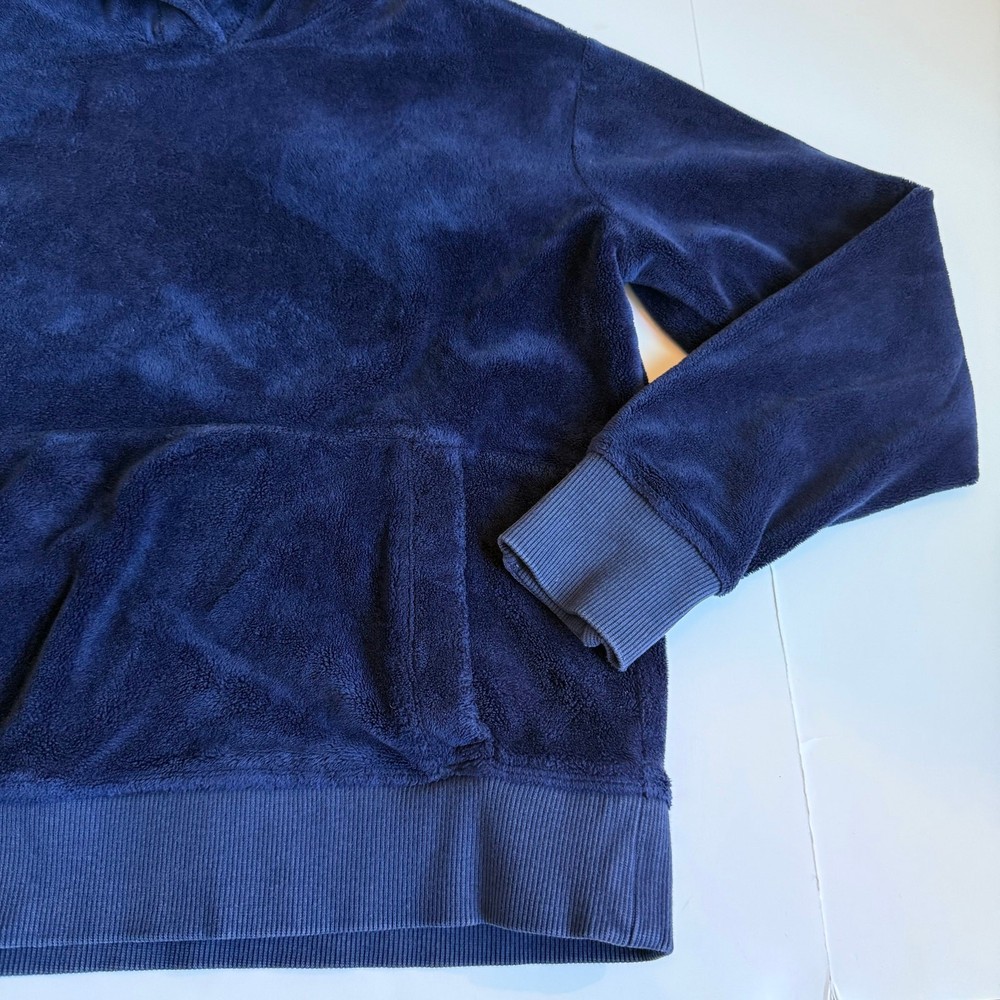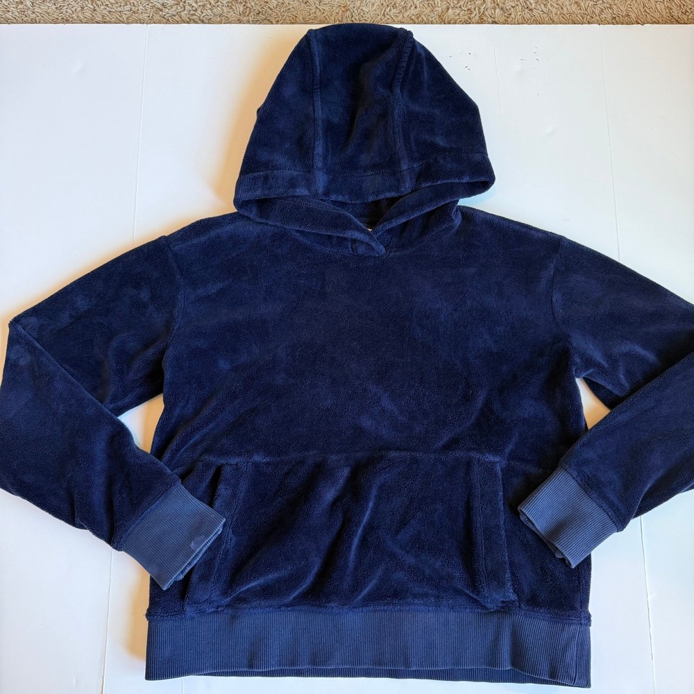 Girls size medium 8-10 Athleta Girl, Feelin Good Hoodie in Navy Blue. Super soft plush fabric. Kanga pocket. Thumb holes. Good/fair condition for paint stain on wrist. See close up photo. Otherwise great shape! So soft and comfy!! C-4577