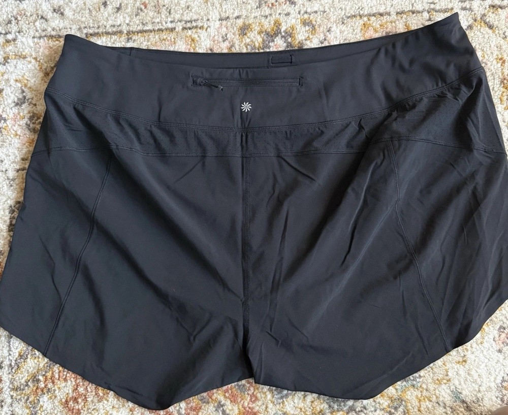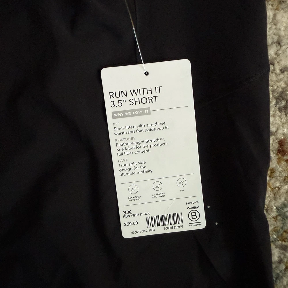 Athleta Run With It 3.5" Short - Size: 3X (Plus) - Condition: New With Tags (NWT) - Color: Black - MSRP: $59.00 Item Details: - Inseam: 3.5" - Fabric: Featherweight Stretch (Recycled Polyester/Spandex) - Liner: Yes, built-in brief - Pockets: Back zip pocket - Waist: Mid-rise, semi-fitted - Features: Split hem for mobility, UPF protection, moisture-wicking