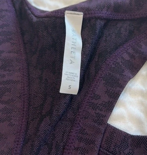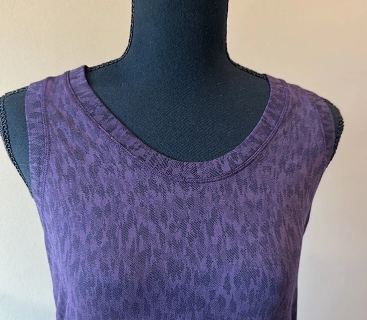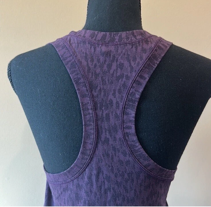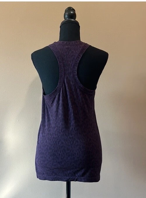Athleta small ladies racer back purple animal print exercise top. Longer length with rubber gripper on hem to prevent ride up
