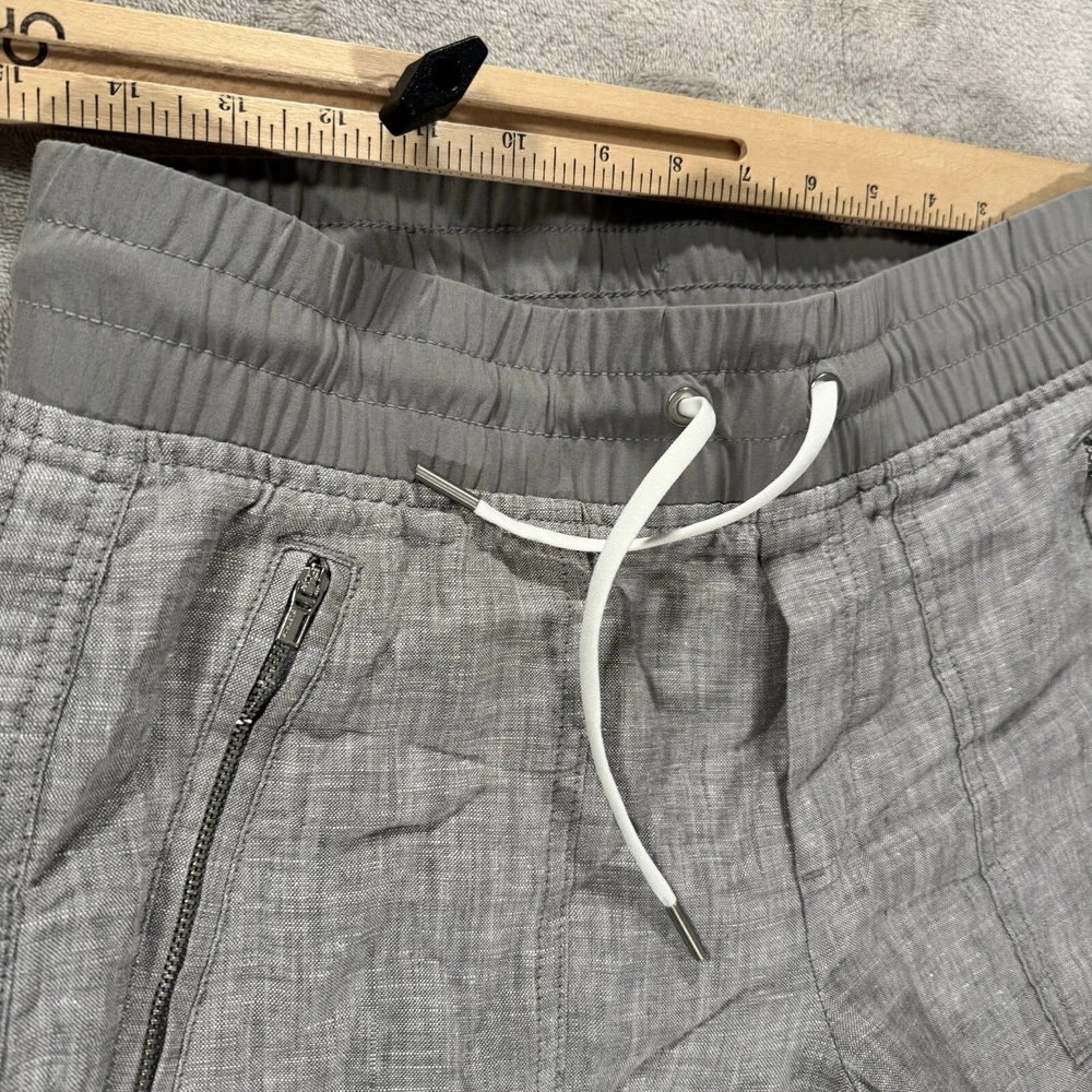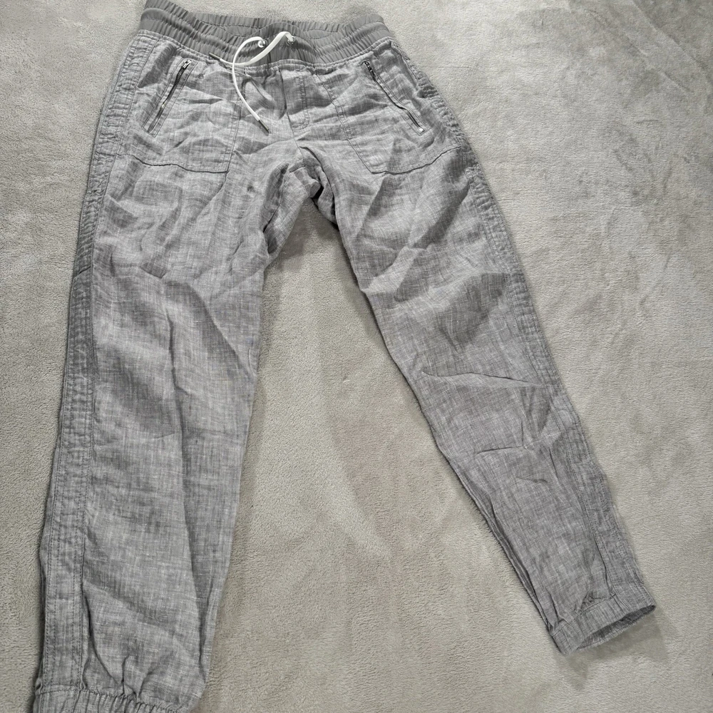 Elevate your casual style with these Athleta jogger pants, perfect for travel and everyday wear. The pants feature an elastic waist with drawstring closure and high-rise design, providing a comfortable fit. The chambray fabric type and solid gray color make them versatile and easy to pair with any top. These pants also come with pockets, making them practical for everyday use. They are breathable, easy to care for, and machine washable. With a tapered leg style and flat front, they give a modern and sleek look. The pants are perfect for beach, Hawaiian, and tropical themes.