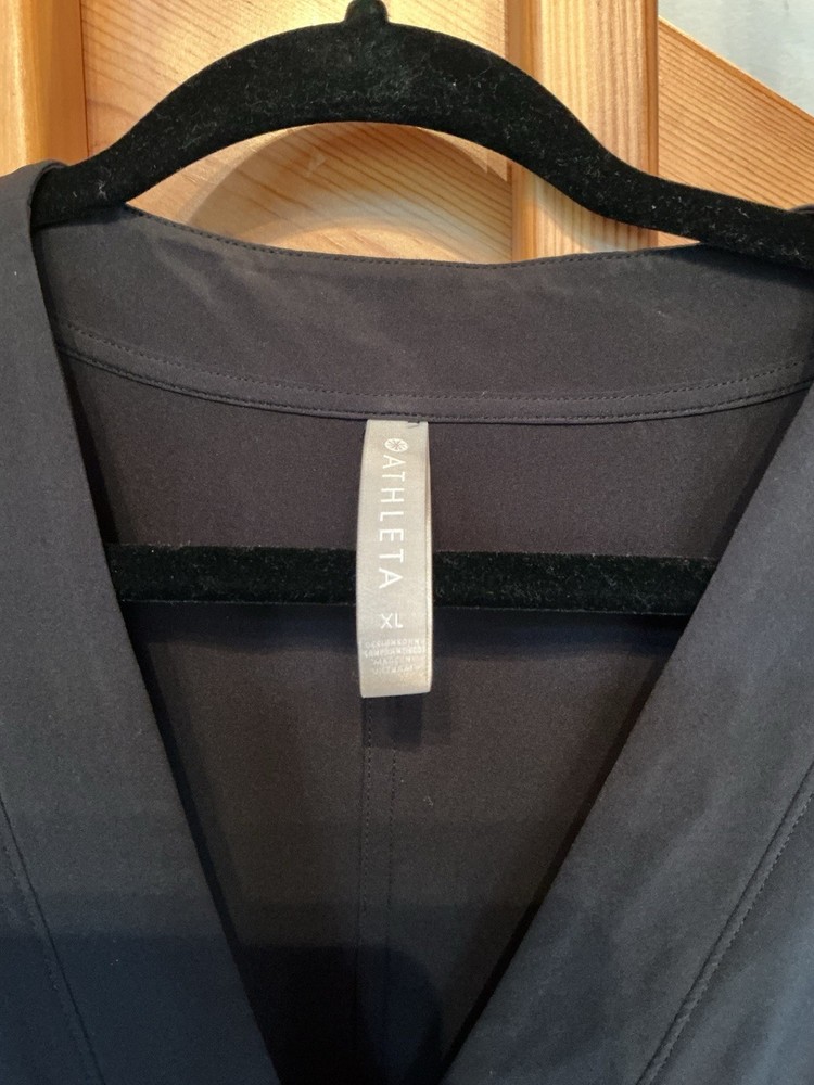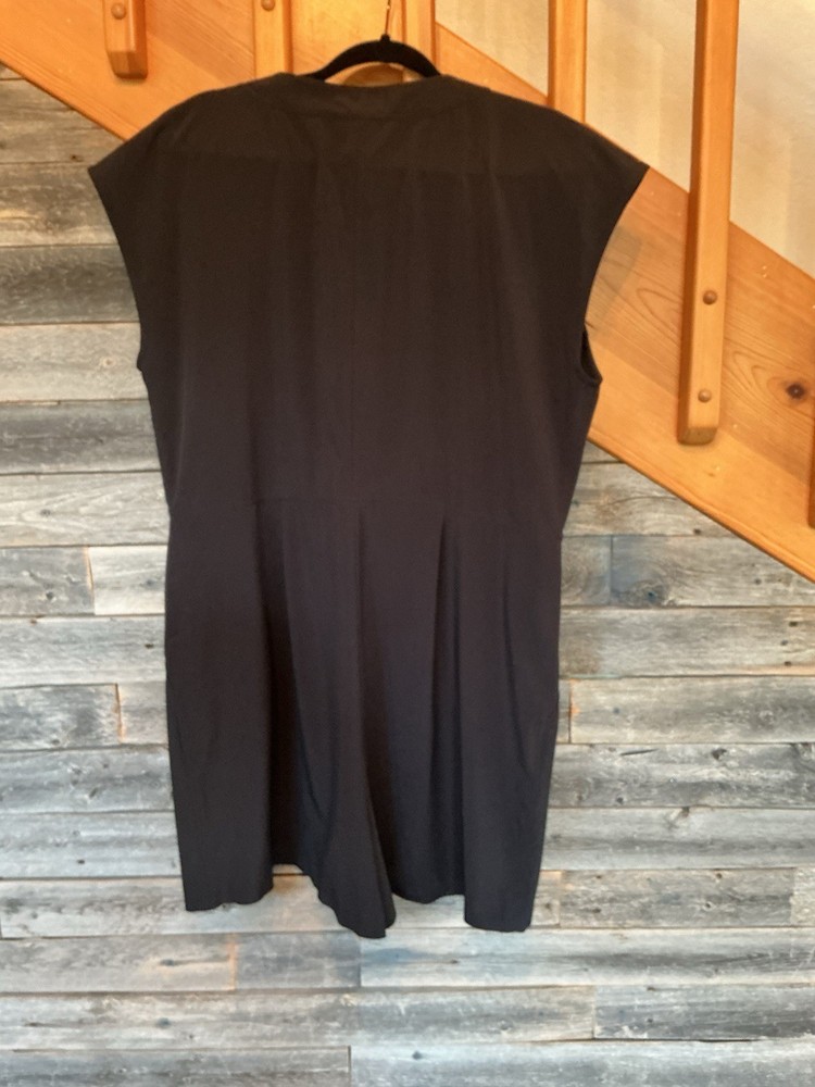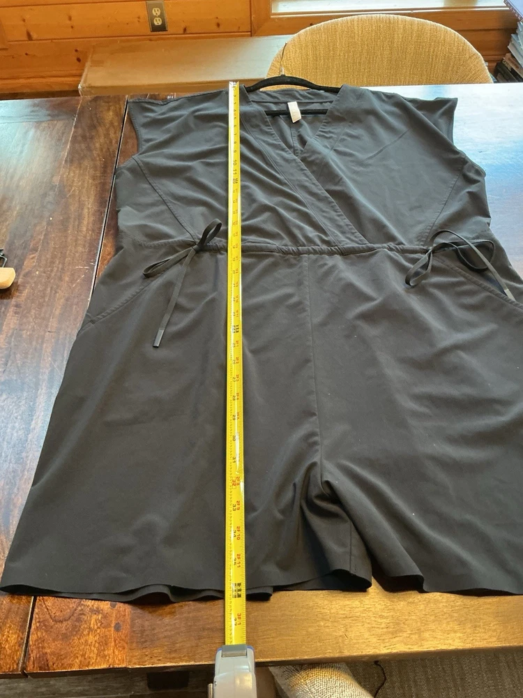 The Athleta Women's Romper Jumpsuit in size XL is a stylish and versatile piece perfect for travel or casual occasions. This black jumpsuit features a V-neck and a hidden vanity button, adding a touch of sophistication to its design. The sleeveless design and solid pattern make it a flattering and comfortable choice for the warmer seasons of summer, fall, and spring. Made by the brand Athleta, this one-piece outfit is machine washable for easy care and maintenance. Adjustable cinched waist to the size that you want two front slant pockets.