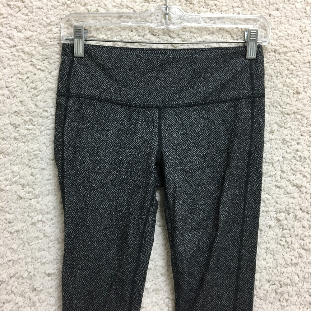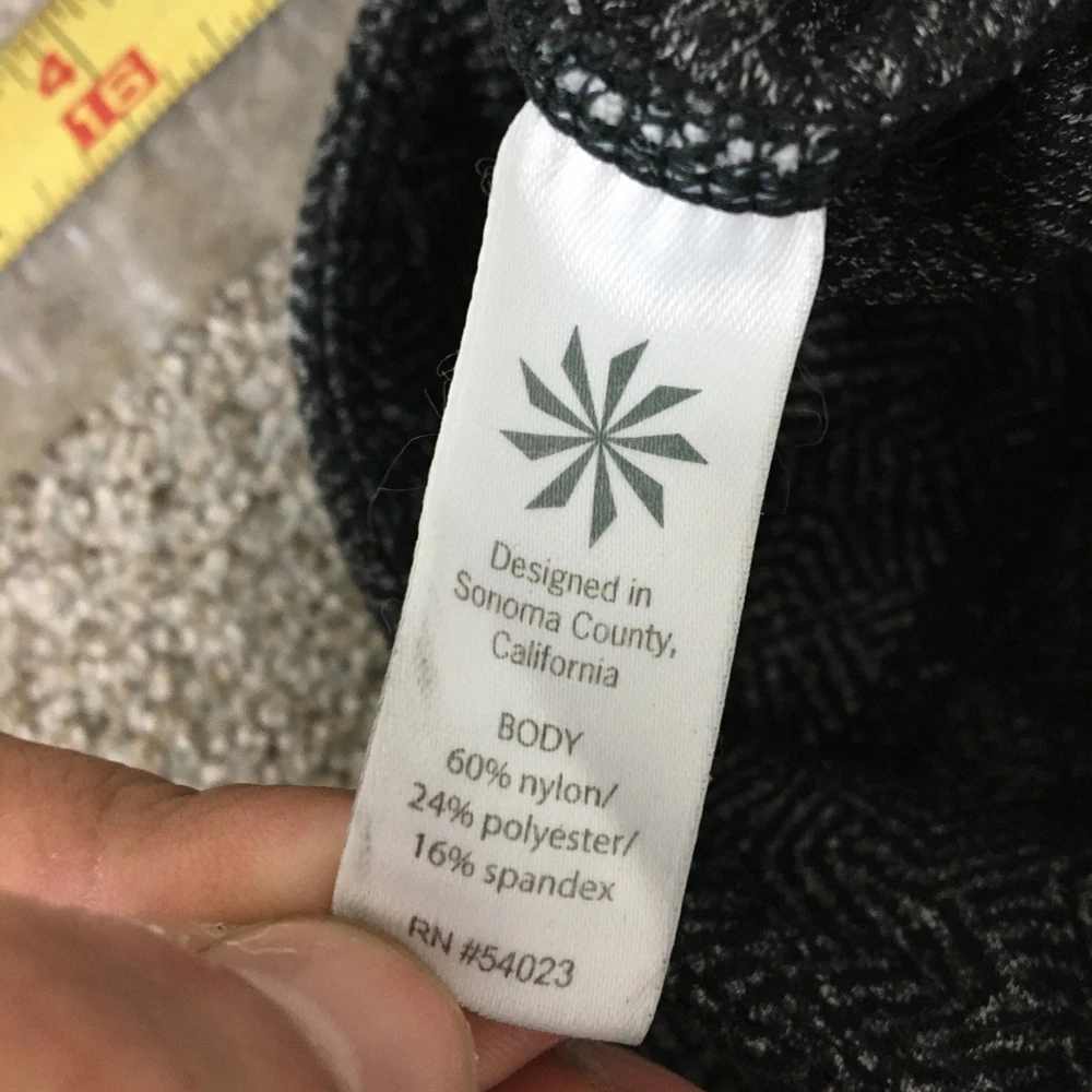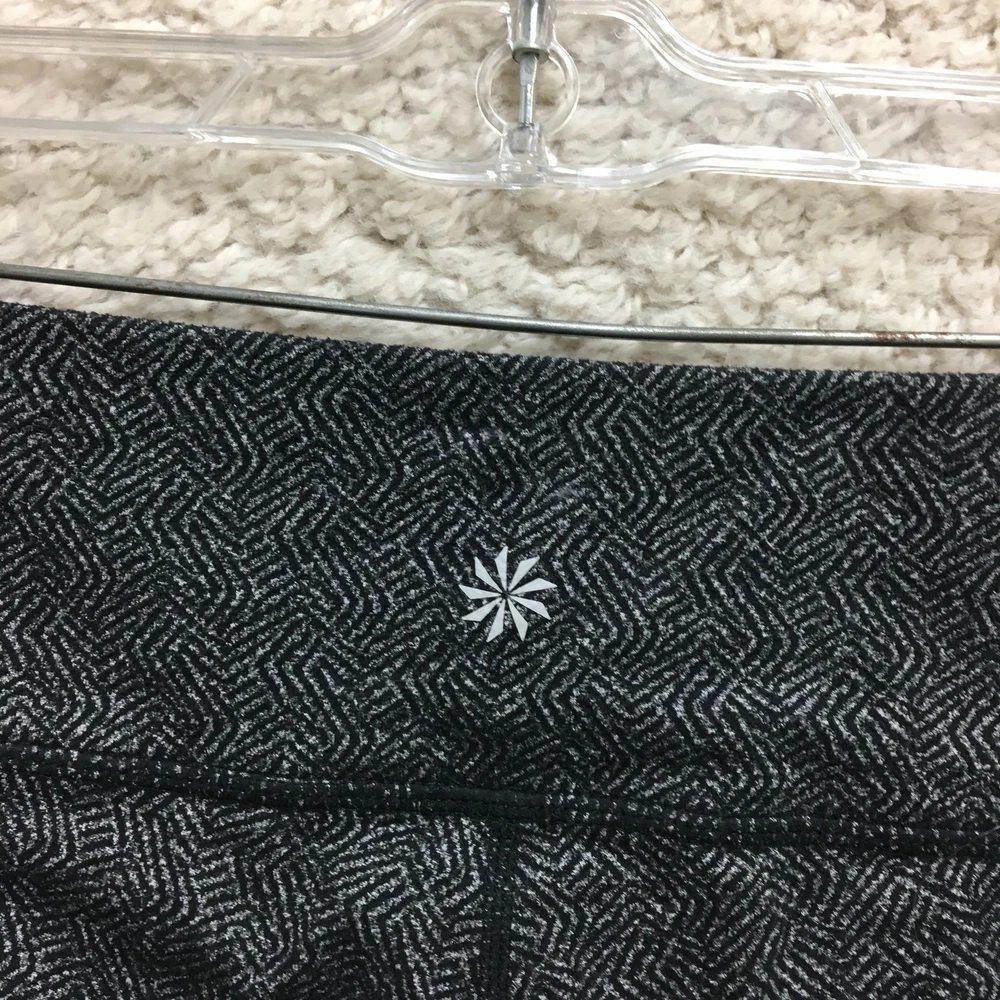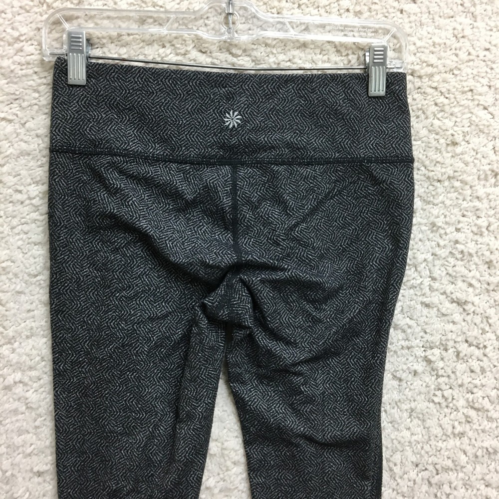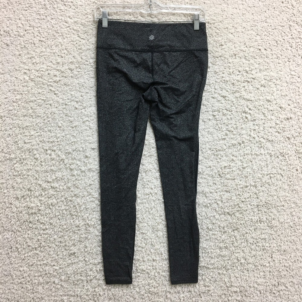 Athleta Leggings Womens Small Black Gray Pattern High Rise Activewear Yoga Pants Condition: Gently worn, no visible flaws, excellent used condition Features a black and gray geometric pattern throughout Stretchy, high-rise waistband for optimal comfort and movement Made with body fabric: 60% nylon, 24% polyester, 16% spandex Comfortable athletic fit, ideal for yoga, gym, or everyday athleisure Logo featured at back of waistband Size: Small (Womens) Made in Vietnam Designed in Sonoma County, California