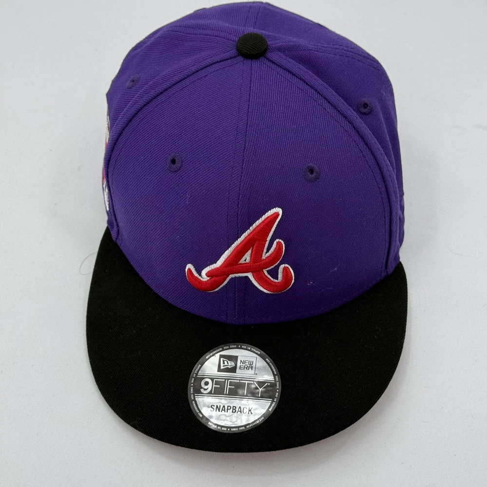 Step up your game day ensemble with the Atlanta Braves MLB All Star Game 2000 9Fifty New Era Hat. This classic snapback cap is a versatile addition to any fan's collection, featuring an adjustable strap for a personalized fit and crafted from durable polyester canvas material that can withstand the elements, making it ideal for all seasons – from the sunny days at the ballpark to breezy autumn evenings.Sporting a striking purple color, this hat makes a bold statement while paying homage to the iconic Atlanta Braves. The cap is adorned with the team's logo, adding an authentic touch to your sports apparel. Whether you're attending a game or just out and about, this cap is perfect for the casually minded sports fan looking to showcase their team pride in style.