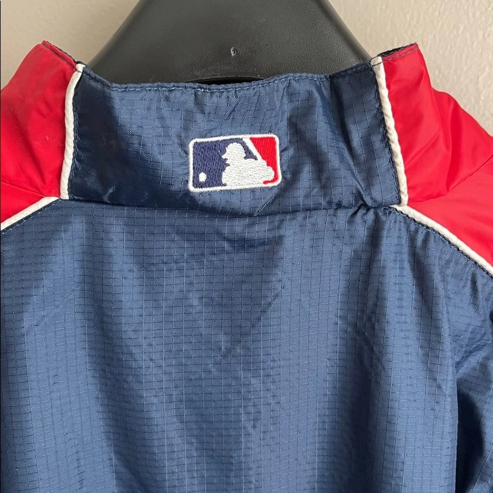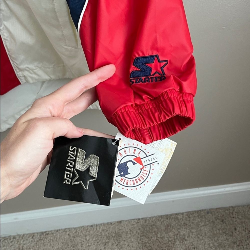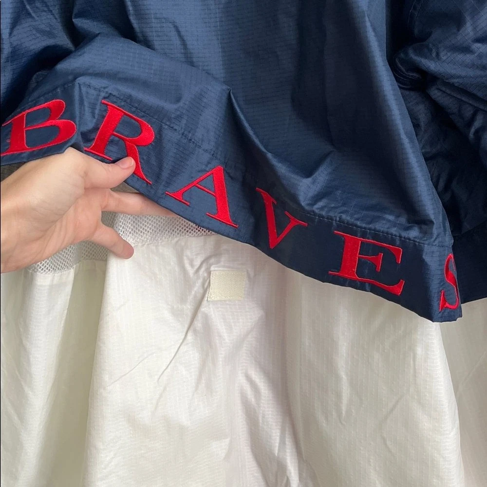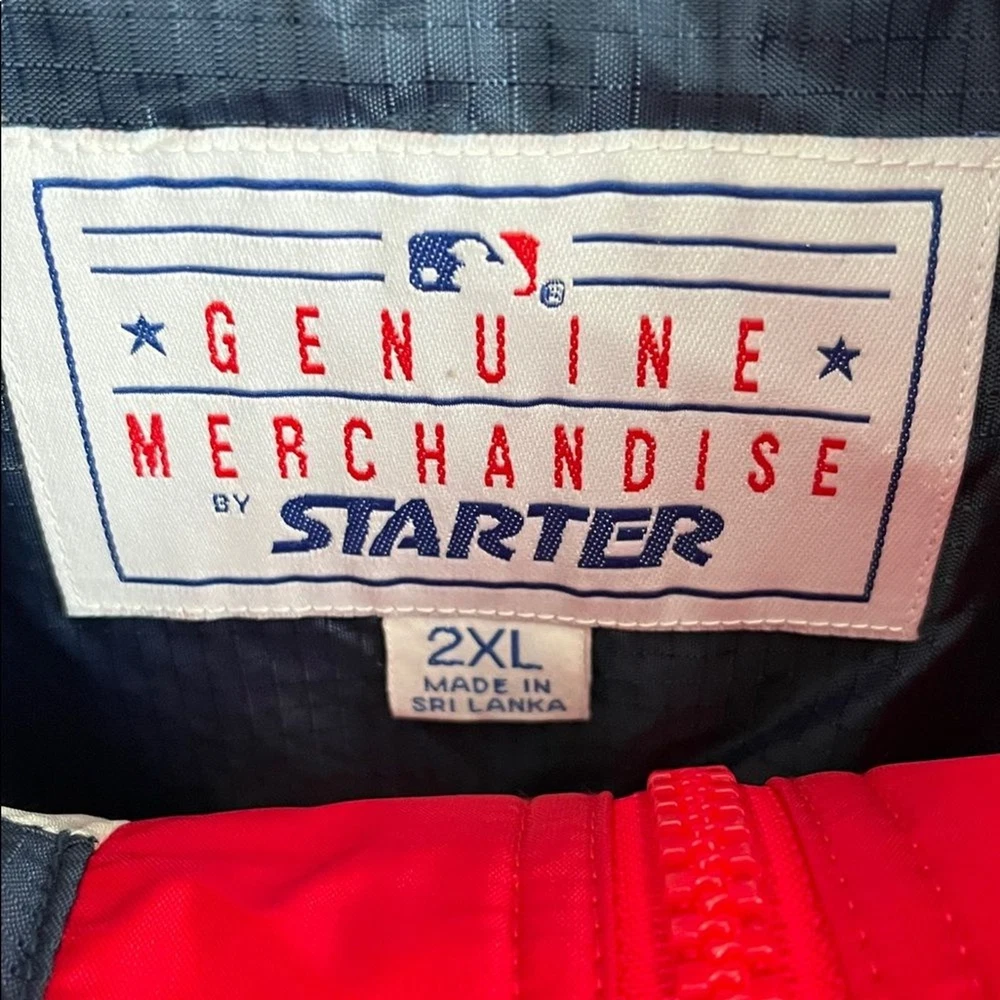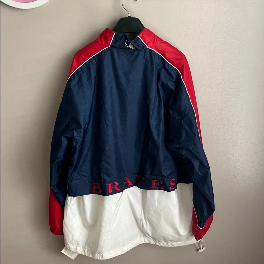 Atlanta Braves VTG Starter windbreaker jacket, size 2XL. Full center zip, adjustable bungee waistband and exterior hip pockets. Back velcro-closure vent flap. Braves logo embroidered on chest and name embroidered on back. Laying flat, in approximate inches: 32.25 length 28.5 pit to pit 23.5 shoulder seam to shoulder seam 33 sleeve, measured from base of collar