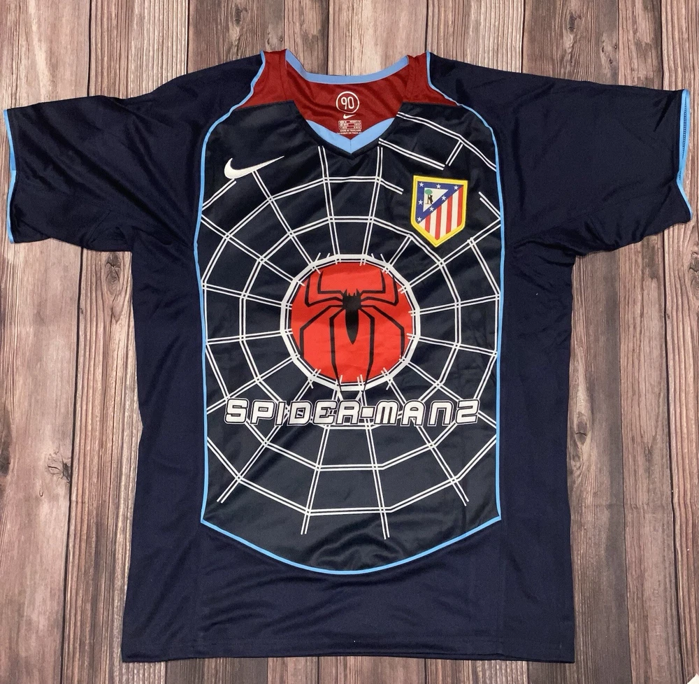 Show your support for Atletico Madrid with this 2004-05 Away Spider-Man 2 Soccer Football Jersey by Nike. Made for men, this blue jersey is the perfect addition to any soccer fan's collection. The jersey features the iconic Nike logo along with the Atletico Madrid team emblem, making it a must-have for any fan of the team. The size of the jersey is a men's size L and it is perfect for wearing to games or just out and about. The material is of high quality and will keep you comfortable no matter what the weather is like. Get this jersey today and show your support for Atletico Madrid!