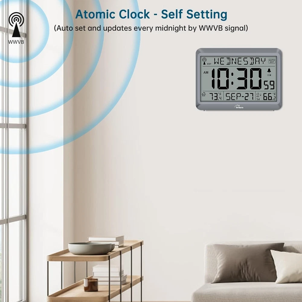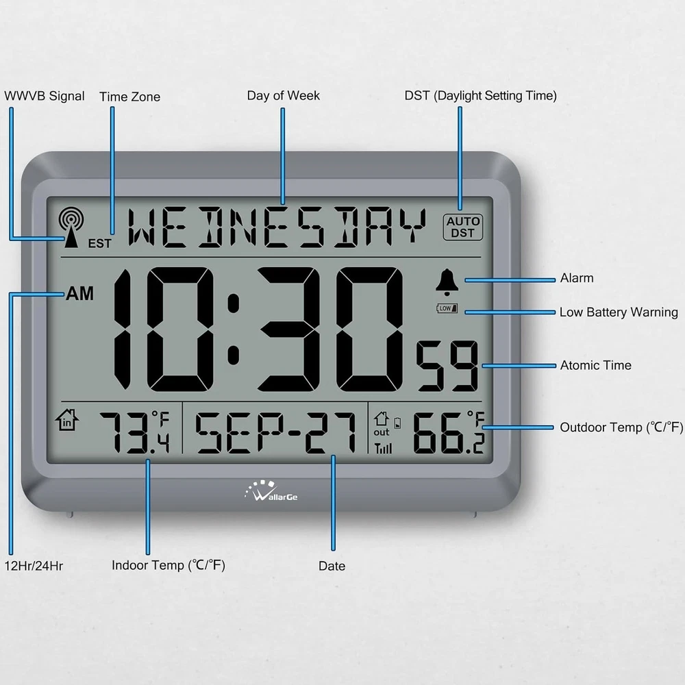 About this item ๐๐ฐ๐ฐ๐๐ฟ๐ฎ๐๐ฒ ๐๐๐ผ๐บ๐ถ๐ฐ ๐๐น๐ผ๐ฐ๐ธ - The atomic clock has a built-in receiver that automatically synchronizes itself with the WWVB radio broadcast, which will update time automatically every midnight to ensure accurate time. It has 4 time zones: EST, CST, MST, PST. ๐๐๐ผ๐บ๐ถ๐ฐ ๐๐น๐ผ๐ฐ๐ธ ๐๐ถ๐๐ต ๐๐ป๐ฑ๐ผ๐ผ๐ฟ ๐ฎ๐ป๐ฑ ๐ข๐๐๐ฑ๐ผ๐ผ๐ฟ ๐ง๐ฒ๐บ๐ฝ๐ฒ๐ฟ๐ฎ๐๐๐ฟ๐ฒ - This atomic clock can display both indoor and outdoor temperature, helps you better manage your daily life. The wireless outdoor sensor monitors and transmits the outdoor temperature to the clock to display. The sensor should be placed within 330 feet and out of direct sunlight or rain. ๐๐ถ๐ด๐ถ๐๐ฎ๐น ๐๐น๐ฎ๐ฟ๐บ ๐๐น๐ผ๐ฐ๐ธ ๐๐ฎ๐๐๐ฒ๐ฟ๐ ๐ข๐ฝ๐ฒ๐ฟ๐ฎ๐๐ฒ๐ฑ - The clock is supported by 3 x AAA battery and outdoor sensor is supported by 2 x AA battery. (Batteries are not included). When batteries of clock or sensor are running low, there would be a low battery symbol appearing on screen and blinking, reminding you to replace new batteries in time. ๐๐ฎ๐ฟ๐ด๐ฒ ๐๐ถ๐๐ฝ๐น๐ฎ๐ ๐๐ถ๐๐ต ๐ง๐ฒ๐บ๐ฝ๐ฒ๐ฟ๐ฎ๐๐๐ฟ๐ฒ, ๐๐ฎ๐ ๐ฎ๐ป๐ฑ ๐๐ฎ๐๐ฒ - Two temperature modes switchable (Celsius and Fahrenheit). When click button, both indoor and outdoor temperature exchange mode at the same time. There are also two display modes of time selectable: Standard Time and Military Time. ๐๐จ๐ง๐ข ๐๐ฆ๐ง ๐ฎ๐ป๐ฑ ๐๐น๐ฎ๐ฟ๐บ โ With DST on, clock will go forward or fall back one hour automatically in daylight saving time. When DST or alarm is on, there would be a corresponding icon staying on screen. Both of them could be turned off manually if for no need. Atomic Clock Indoor Outdoor Temperature Self-Setting Digital 4 Time Zones DST Product Description Get Started Quickly 1. Adjust the outdoor temperature link channel of clock and outdoor sensor to be same๏ผlike A-A, B-B, C-C. 2. Install batteries (3xAAA for clock and 2xAA for outdoor sensor) and choose your time zone. 3. Outdoor temperature starts to connect first, once finished, clock starts to search for WWVB signal. 4. Put clock to a place with good signal for better reception and outdoor sensor to a safe place outside within 330feet/100m. 5. Clock updates time automatically when signal received successfully. Tips: In most areas, a signal can only be received at night. If your clock does not receive WWVB signal in daytime, please wait overnight and it will be set in the morning. Outdoor temperature range: -40โ ~ 158โ (-40ยฐC to 70ยฐC). Indoor temperature range: 32โ ~ 122โ (0ยฐC to 50ยฐC). When clicking to change the temp display unit, indoor and outdoor will change simultaneously. The outdoor sensor should be placed within 300ft/100m and out of direct sun light or rain. This atomic is a wall clock and table clock. There are hangging holes on the clock back, you can hang it on wall easily. There is also a folding stan on the back, so it can also be used as a desk clock. Previous page Return Policy: We offer a 30 day return policy from the receiving date. Please contact us for a Return Label. Please use our return label provided by us because it will go back to our supplier. Feedback: Your satisfaction is very important to us! If you have any problem with your order, please contact us and we will do our very best to make you satisfied. As long as you are happy with your purchase, please leave a positive feedback for us. We will always leave you a positive feedback in return. If you have any problem with your purchase, please do not leave a negative feedback. Please Contact us ... and your issue will be solved quickly and positively We are a small family-owned business trying to make it, not a huge company that doesn't care ... We will ALWAYS do our best for you