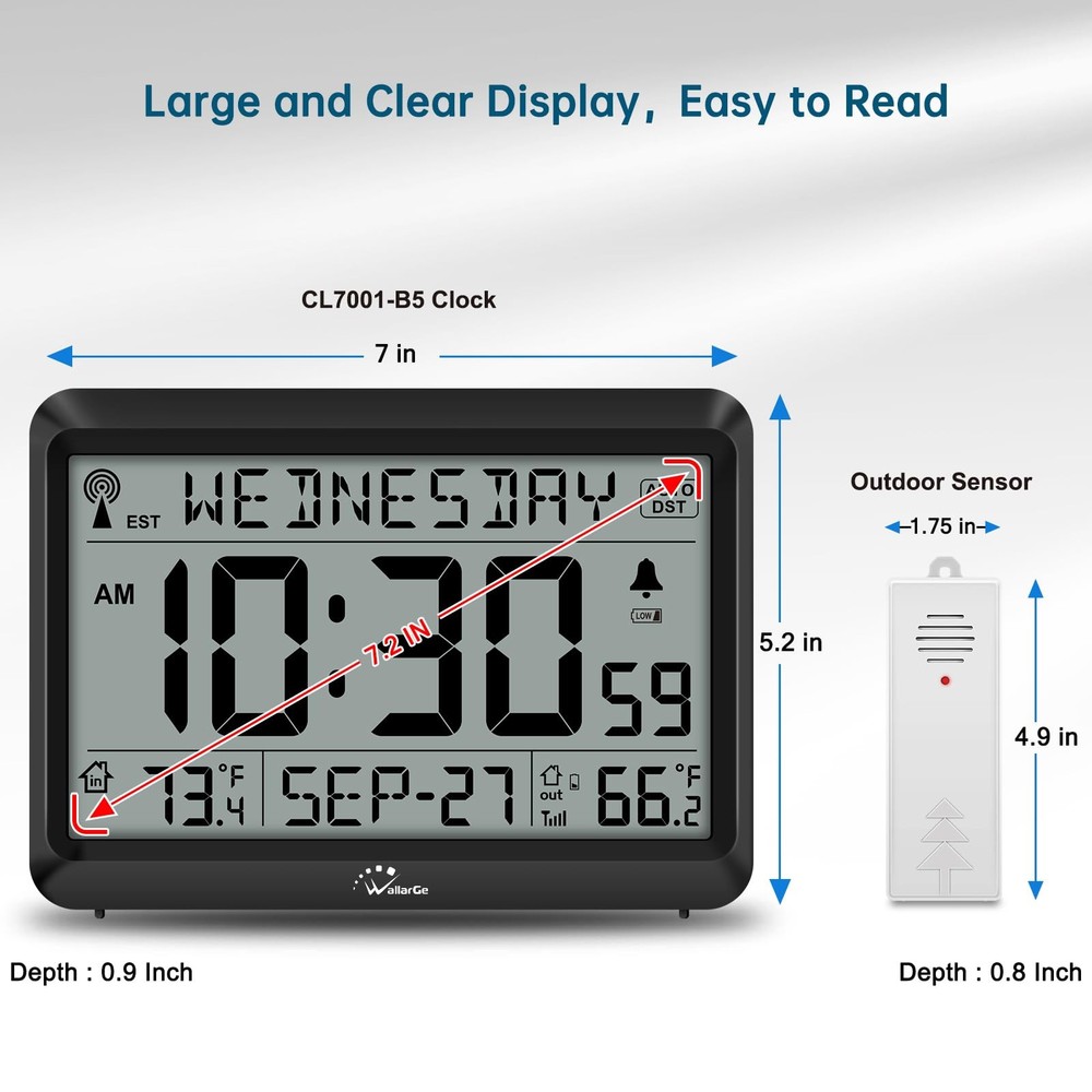 ๐๐ฐ๐ฐ๐๐ฟ๐ฎ๐๐ฒ ๐๐๐ผ๐บ๐ถ๐ฐ ๐๐น๐ผ๐ฐ๐ธ - The atomic clock has a built-in receiver that automatically synchronizes itself with the WWVB radio broadcast, which will update time automatically every midnight to ensure accurate time. It has 4 time zones: EST, CST, MST, PST. ๐๐๐ผ๐บ๐ถ๐ฐ ๐๐น๐ผ๐ฐ๐ธ ๐๐ถ๐๐ต ๐๐ป๐ฑ๐ผ๐ผ๐ฟ ๐ฎ๐ป๐ฑ ๐ข๐๐๐ฑ๐ผ๐ผ๐ฟ ๐ง๐ฒ๐บ๐ฝ๐ฒ๐ฟ๐ฎ๐๐๐ฟ๐ฒ - This atomic clock can display both indoor and outdoor temperature, helps you better manage your daily life. The wireless outdoor monitors and transmits the outdoor temperature to the clock to display. The should be placed within 330 feet and out of direct sunlight or rain. ๐๐ถ๐ด๐ถ๐๐ฎ๐น ๐๐น๐ฎ๐ฟ๐บ ๐๐น๐ผ๐ฐ๐ธ ๐๐ฎ๐๐๐ฒ๐ฟ๐ ๐ข๐ฝ๐ฒ๐ฟ๐ฎ๐๐ฒ๐ฑ - The clock is supported by 3 x AAA battery and outdoor is supported by 2 x AA battery. (Batteries are not ). When batteries of clock or are running low, there would be a low battery symbol appearing on screen and blinking, reminding you to replace new batteries in time. ๐๐ฎ๐ฟ๐ด๐ฒ ๐๐ถ๐๐ฝ๐น๐ฎ๐ ๐๐ถ๐๐ต ๐ง๐ฒ๐บ๐ฝ๐ฒ๐ฟ๐ฎ๐๐๐ฟ๐ฒ, ๐๐ฎ๐ ๐ฎ๐ป๐ฑ ๐๐ฎ๐๐ฒ - temperature modes switchable (Celsius and Fahrenheit). When click button, both indoor and outdoor temperature exchange mode at the same time. There are also display modes of time selectable: Standard Time and Military Time. ๐๐จ๐ง๐ข ๐๐ฆ๐ง ๐ฎ๐ป๐ฑ ๐๐น๐ฎ๐ฟ๐บ โ With DST on, clock will go forward or fall back hour automatically in daylight saving time. When DST or alarm is on, there would be a corresponding icon staying on screen. Both of them could be turned off manually if for no need.