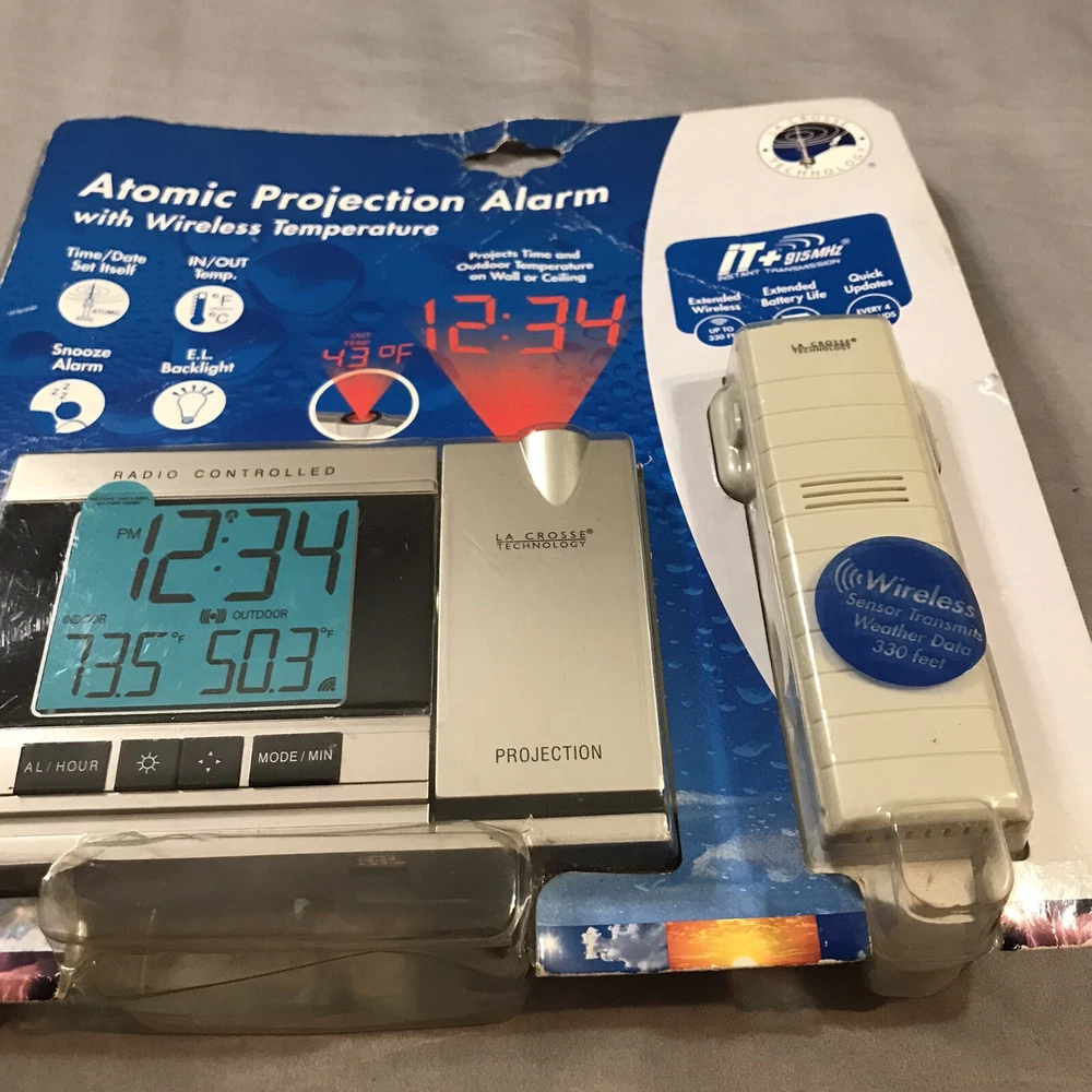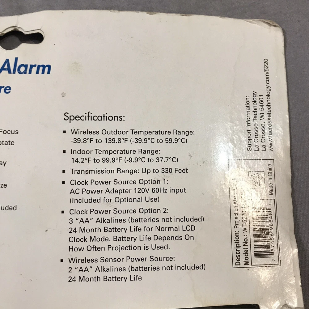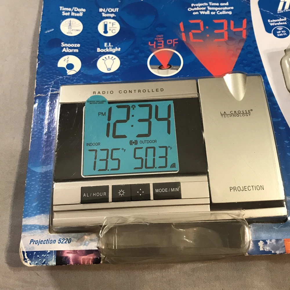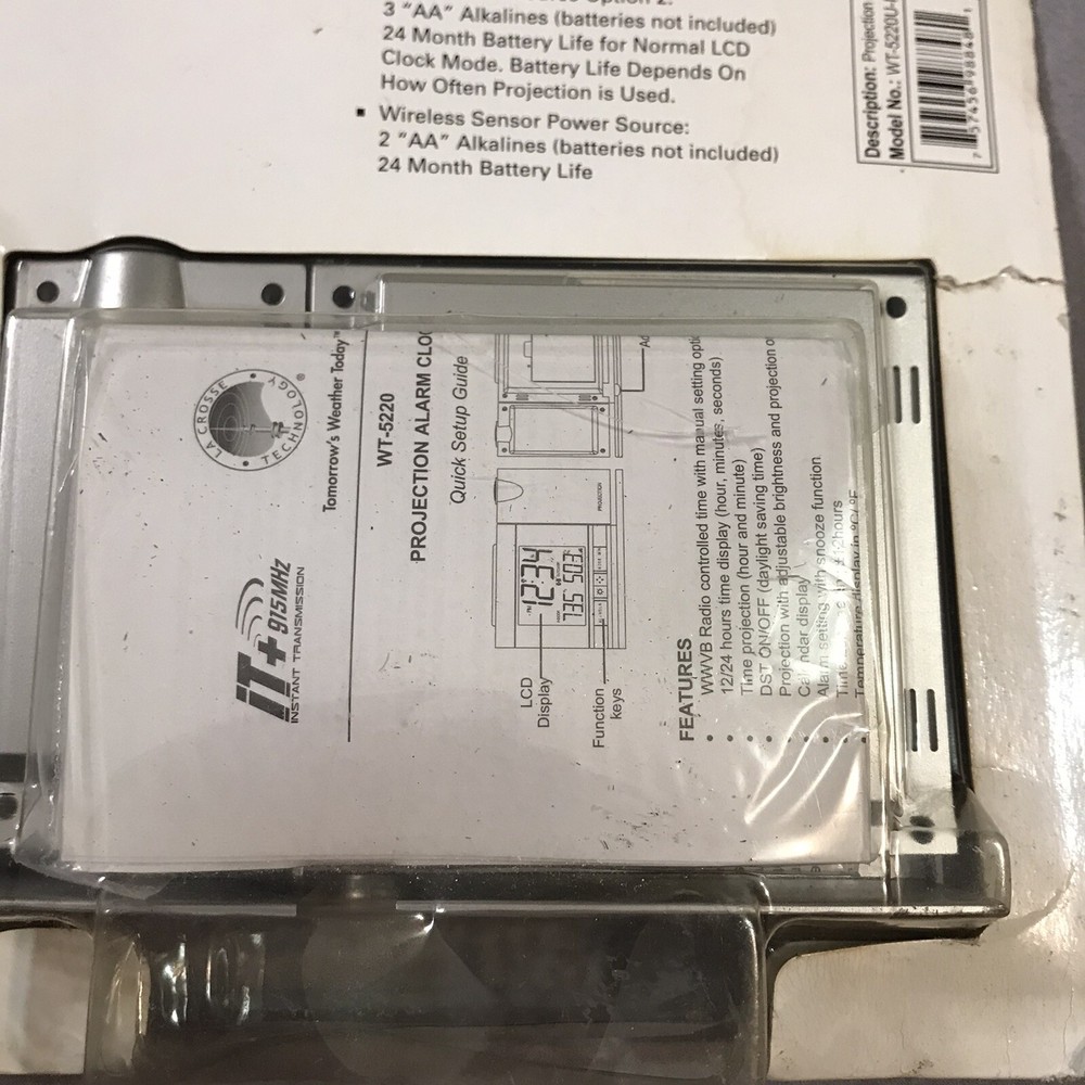 Atomic Projection Alarm Wireless Temperature Projection 5220 Box has caught some dust/dirt inside from sitting in garage. Item is still new in box. Please see pictures.