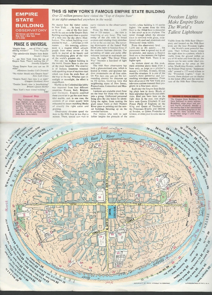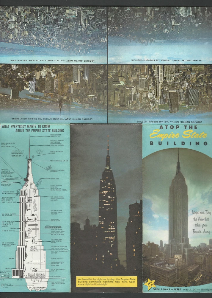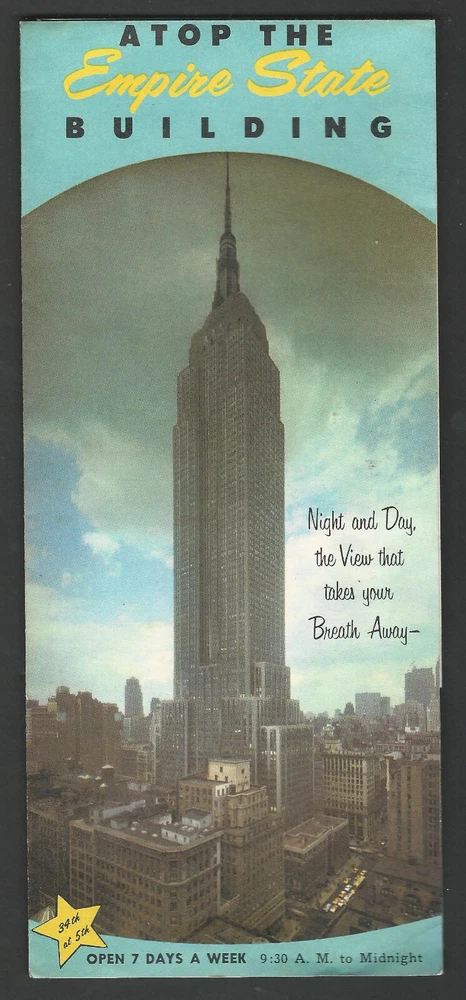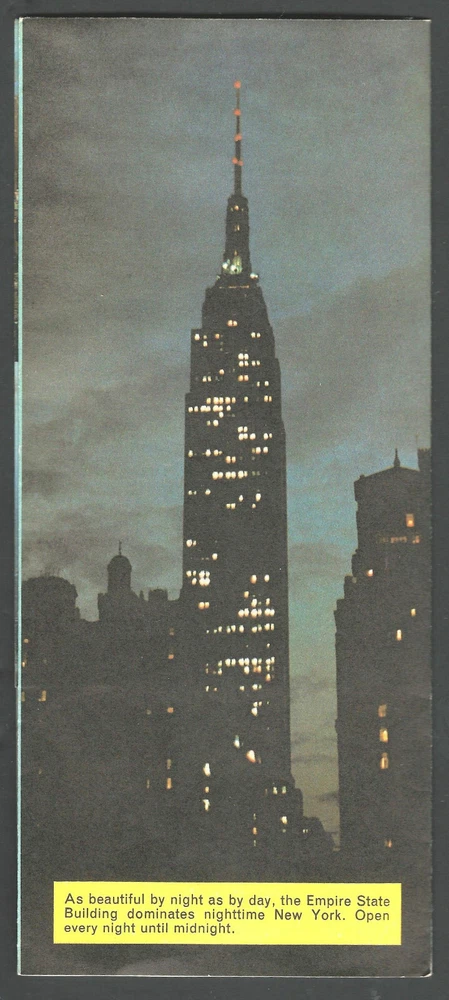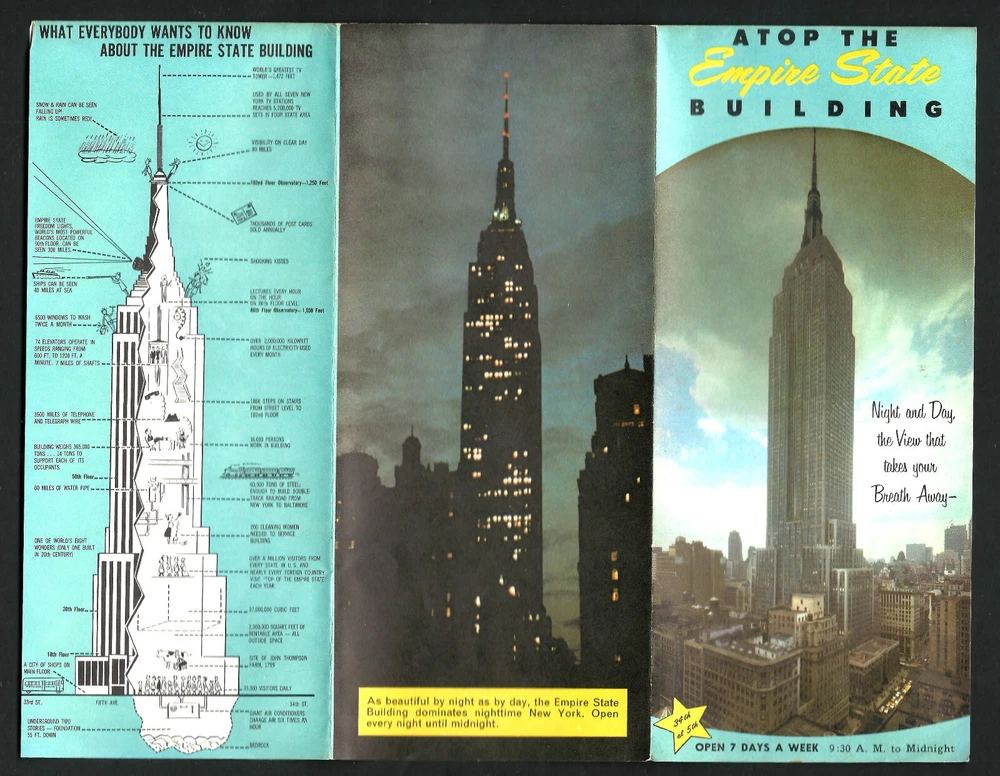 Atop the EMPIRE STATE BUILDING 1962 Tour Brochure Brochure has map of views from observation level of the building plus fun facts. Opens to three panels on each side, 12 X 9-1/4 inches. Postage combined with other items purchased at the same time IF you wait for a combined invoice before making payment.
