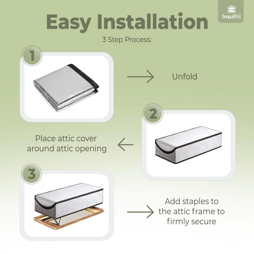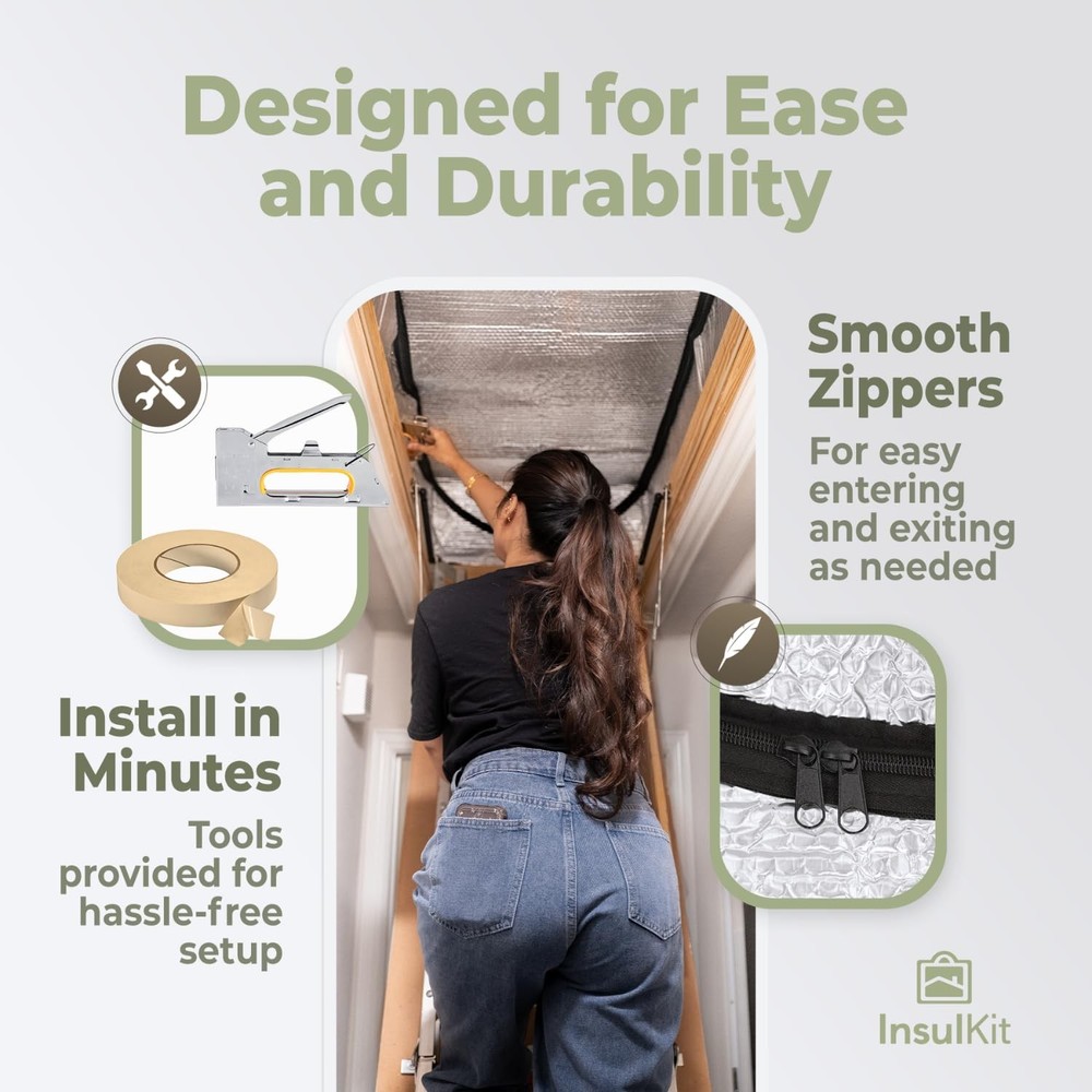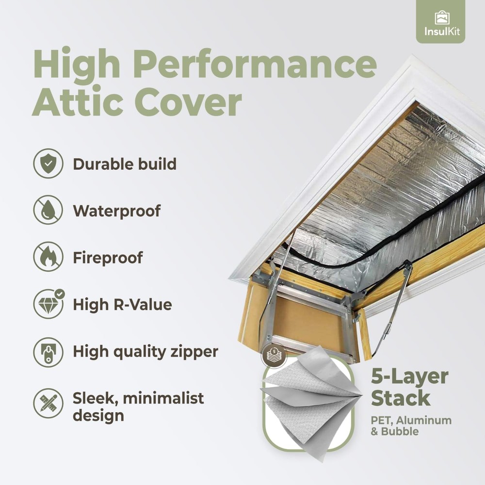 Welcome to a world of comfort and savings with our Attic Door Insulation Cover! Say goodbye to chilly drafts and hello to a cozy home. Our premium cover is designed to fit over your attic stairs opening, providing superior insulation and energy savings. ✅ REDUCE ENERGY COSTS - Our attic cover's 5-layer structure with PET, aluminum, and double bubble ensures maximum insulation, cutting your energy bills. Say goodbye to wasted energy and hello to savings. ✅ MAXIMUM DURABILITY - Unlike others, our attic cover boasts super thick seams and high-grade zippers, guaranteeing long-lasting performance. It's a one-time investment for years of energy savings and comfort. ✅ EASY INSTALLATION, INSTANT RESULTS - With our attic cover, installation is a breeze. Simply fit it over your attic access opening, and enjoy immediate temperature regulation in your home. ✅ PREMIUM MATERIALS, PREMIUM PERFORMANCE - Crafted with PET, aluminum, and double bubble, our attic cover offers superior insulation. The 230gsm material thickness and R value of 15 ensure your home stays cozy all year round. ✅ MODERN LUXURY FOR YOUR HOME - is synonymous with modern home luxury. Elevate your living space with our sleek, minimalist attic cover that not only enhances insulation but also adds a touch of elegance to your home. ✅ PEACE OF MIND GUARANTEED - Invest in our attic cover and enjoy peace of mind knowing your home is well-insulated and energy-efficient. It's a small step that leads to big savings and a more comfortable living environment.