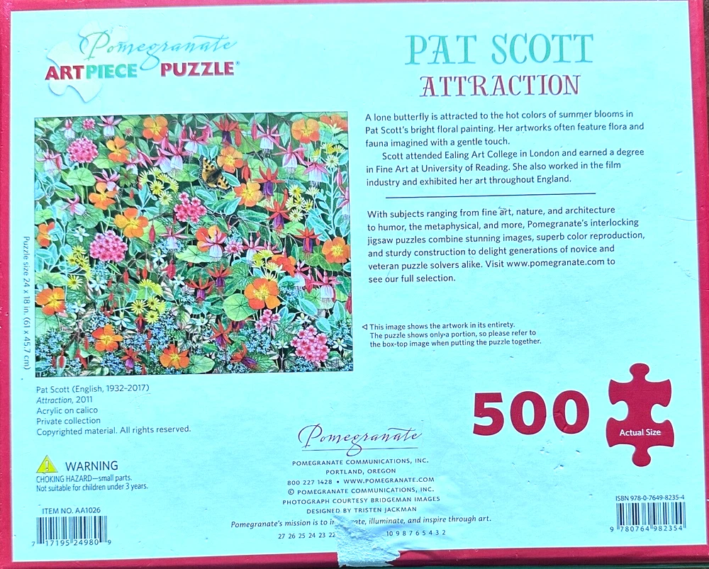 Attraction COMP 500 pc Puzzle Beautiful A Carpet of Flowers Leaves Butterflies Buy more than one item and save a lot on postage! I am happy to combine shipping on multiple items by weight. I will refund any overage paid. Please look at my site joycescorner for additional puzzles and other items. I usually add a few different one each week. Feel free to contact me if you have any questions. I try to ship items within 2 business days of completed payment. Thank you for looking!