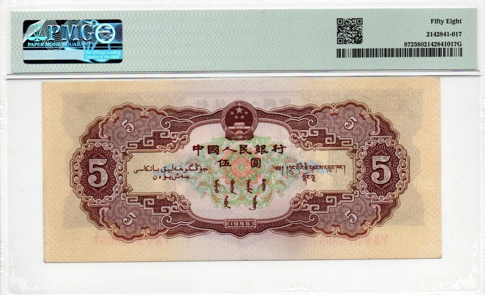 Auction Preview! China Banknote 1956 5 Yuan, PMG 58, SN:5750957 黄5元!
