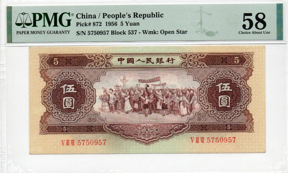 Country: China Year: 1956 Grade Designation: PMG Star Grade: 50 Type: Banknotes Country/Region of Manufacture: China Certification: PMG Circulated/Uncirculated: Uncirculated