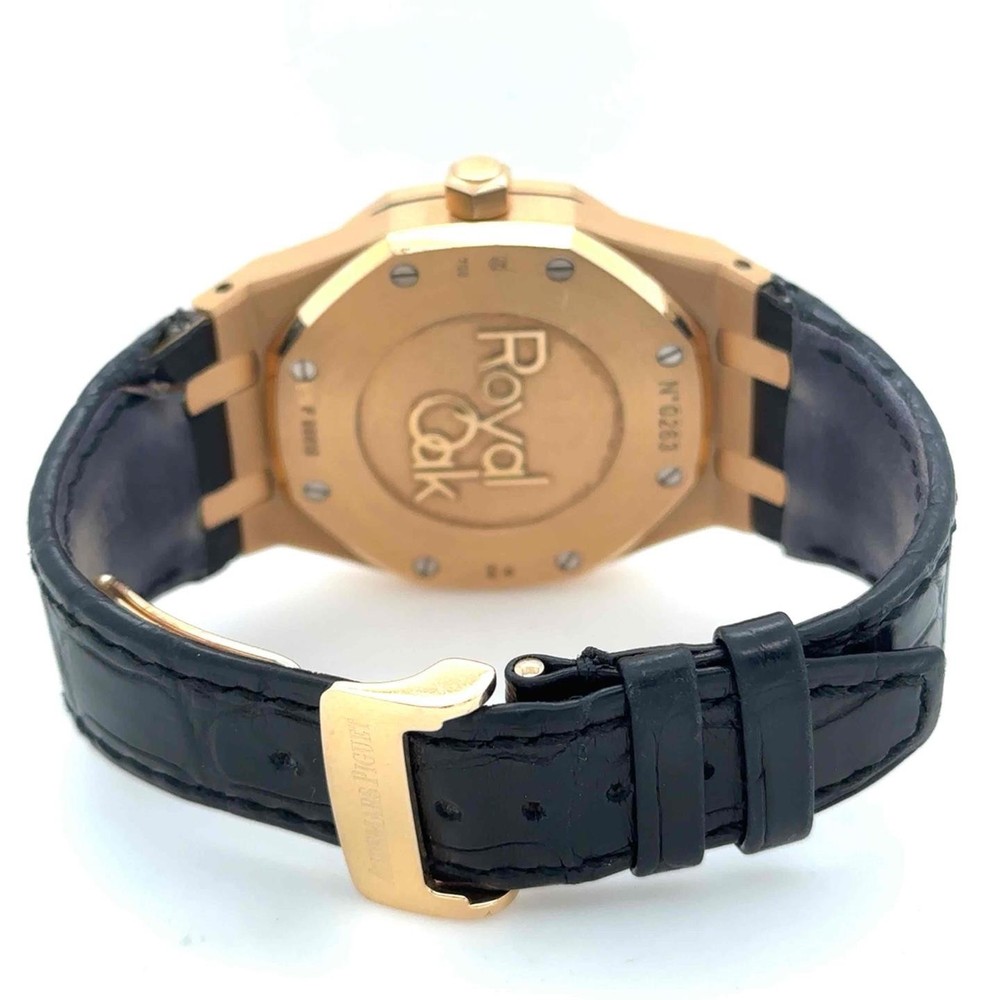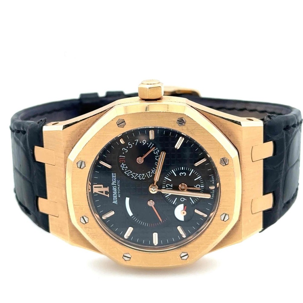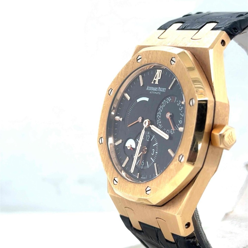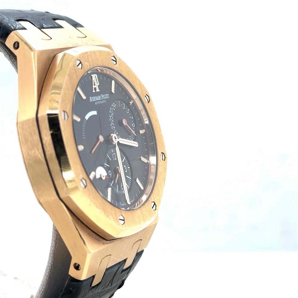 Audemars Piguet Royal Oak Dual Time 39mm Automatic 18k Rose 26120OR.OO.D002.01 Audemars Piguet Royal Oak Dual Time 39mm Automatic 18k Rose 26120OR.OO.D002.01 Description 18kt rose gold case with a brown black leather strap with crocodile patte strap. Fixed18kt gold 18kt rose gold bezel. Black guilloche dial dial with luminous hands and luminous stick hour markers. Minute markers around the outer rim. Dial Type: Analog. Luminescent hands and dial markers. Date subdial at 2 o'clock. Two - date and 24 hours. power reserve subdials. Audemars Piguet Calibre 2329/2846 Automatic movement, containing 33 Jewels, bitting at 28800 vph, and has a power reserve of approximately 38 hours. Scratch resistant sapphire crystal. Screw down crown. Solid 18kt rose gold secured by 8 screws case back. Octagon case shape, case size: 39 mm, case thickness: 10.0 mm. Deployment clasp. Water resistant at 50 meters / 165 feet. Functions: second time zone, date, hour, minute, power reserve indicator, day/night indicator. Luxury watch style. Watch label: Swiss Made. Item Variations: 26120OR OO D002CR 01, 26120OR-OO-D002CR-01, 26120OROOD002CR01. Audemars Piguet Royal Oak Power Reserve Men's Watch 26120OR.OO.D002CR.01. Product Details General Color Black / Gold / Rose Case Case Thickness 10.0 mm Case Material 18kt Rose Gold Case Shape Octagon Case Back Solid 18kt Rose Gold secured by 8 screws Band Band Material Black Leather Strap with Crocodile Patte Band Type Strap Band Color Brown Clasp Deployment Dial Dial Color Black Guilloche Dial Type Analog Crystal Scratch Resistant Sapphire Hands Luminous Dial Markers Luminous Stick Second Markers Minute Markers around the outer rim Sub Dials Two - Date and 24 Hour. Power Reserve Indicator Luminiscence Hands and Dial Markers Bezel Fixed18kt Gold Bezel Material 18kt Rose Gold Crown Screw Down Information Brand Audemars Piguet Collection Name Royal Oak Power Reserve Gender Mens Model 26120OR.OO.D002CR.01 Watch Label Swiss Made Movement Automatic Engine Audemars Piguet Calibre 2329/2846 Power Reserve 38 hours Features Water Resistance 50 meters / 165 feet Calendar Date subdial at 2 o'clock Functions Second Time Zone, Date, Hour, Minute, Power Reserve Indicator, Day/Night Indicator Watch Features Day/Night Indicator, Power Reserve Indicator, Gold, Leather, Time Zone B2989790 Create your brand with Auctiva's Customizable Templates. Attention Sellers - Get Templates Image Hosting, Scheduling at Auctiva. Track Page Views With Auctiva's Counter