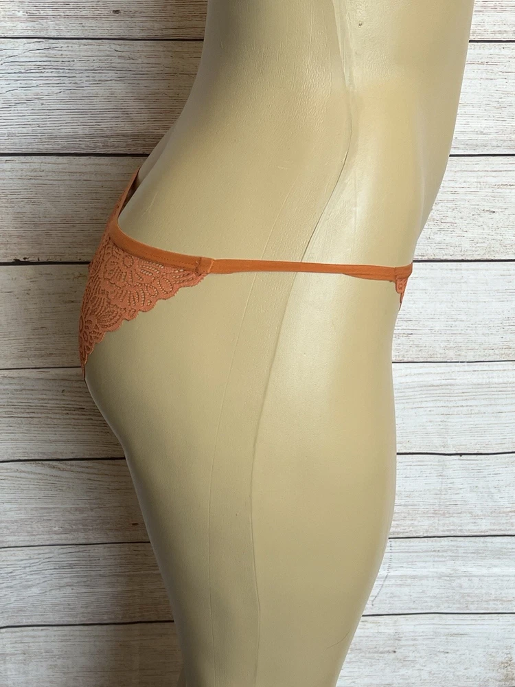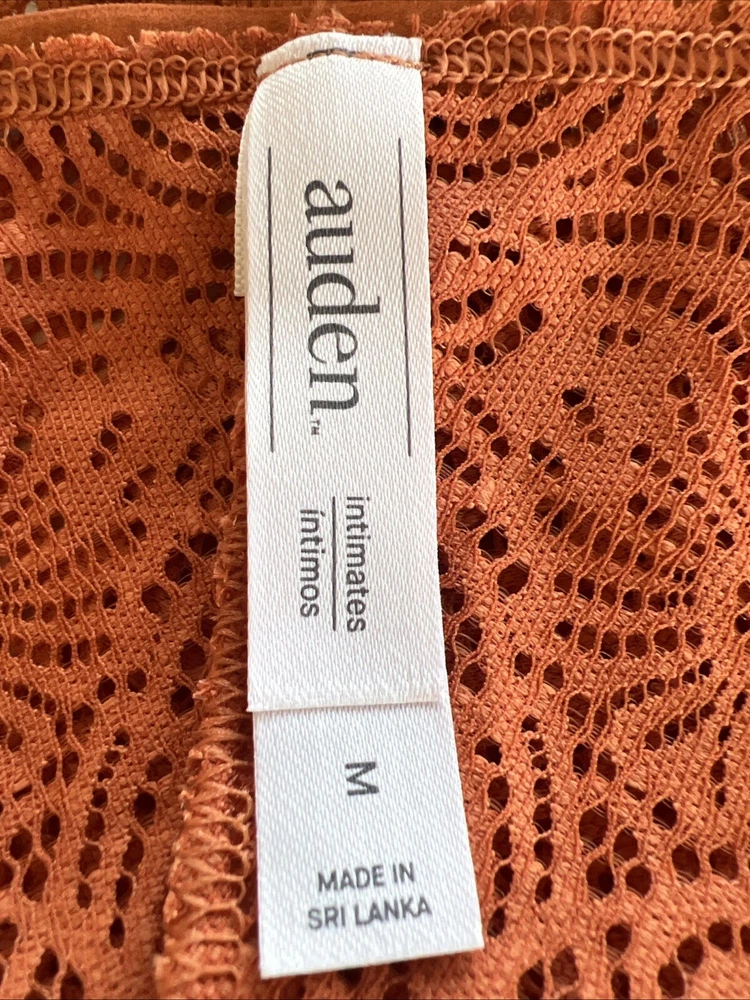 This is a women's orange lace tanga cheeky panty by Auden in size M. Made of lightweight nylon lace, this panty features a floral pattern and offers stretch for comfort. It is machine washable and designed with a compression area at the waist. The brand is Auden, and the country of manufacture is Sri Lanka.