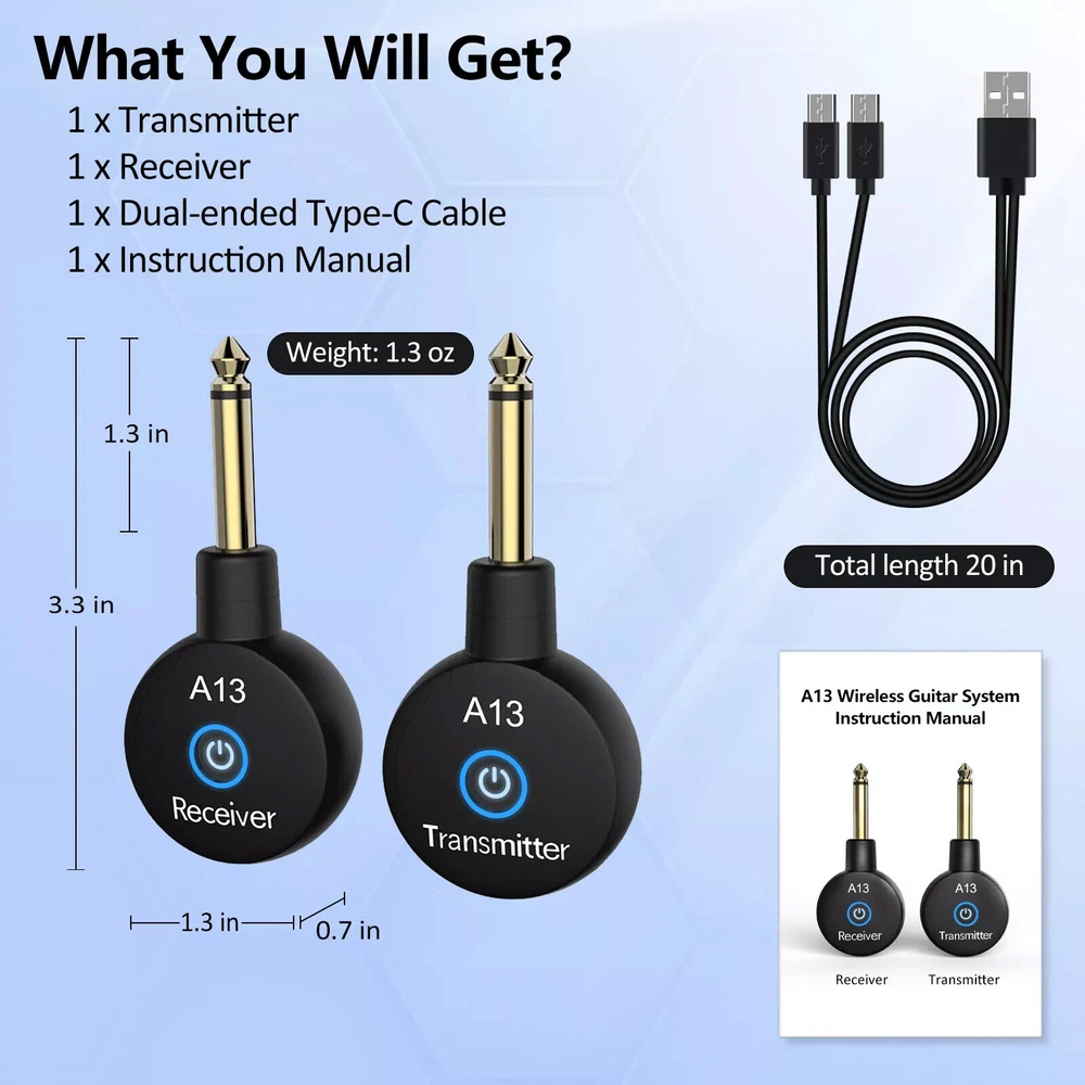 Description Clear Quality Signal Transmission] 2.4GHz digital wireless signal transmission with 24-bit/48KHz uncompressed conversion. High frequency which less than 4ms latency, no lag or no signal loss. effective range is about 100 feet. High quality restore the original guitar sound. [Rechargeable Wireless Guitar System] Built-in rechargeable lithium battery, working time is up to 5 hours after fully charged, and comes with a Dual-ended Type-C Charging Cable for convenient recharging, which ensures good performance for your every show. [Suitable for Variety of Occasions] This wireless transmitter and receiver system is compatible with all devices that have a 6.35mm (1/4") jack, including electric guitars, violins, basses, effect pedals, keyboards, and electronic instruments like the electric saxophone. INGPARTNER A13 wireless guitar system is designed for wireless connection to electronic instruments.This wireless guitar transmitter receiver has the characteristics of low delay, low noise, low interference, fast charging, long working time and high transmission. INGPARTNER A13 wireless guitar system in order to meet your requirements for perfect sound quality and best use experience, we have been working hard, so our guitar wireless transmitter receiver mission is to provide you with better stage performance, so that you can enjoy the best music experience! Wireless guitar makes strumming easy and happy, the wire winding pull, make playing the mood is not good.Wireless guitar transmitter receiver will be a best gift, throw away the cable, embrace the freedom of music, let yourself surrounded by 30 meters of surprise! Friendly Tips: 1.Due to the light and screen difference, the item's color maybe slightly different from the pictures. Please understand. 2.Please allow 1-2cm differences because of the manual measurement. Payment 1. We only accept payment through Payoneer. 2. Please make sure you have a valid account prior bidding. 3. Please pay for your item within 7 days after you order. Shipping 1. Buyer take responsibility in import / tax cost (not included in item price) 2. Pls contact with us to confirm extra cost if you need to upgrade the shipping option 3. If there's any concern about shipping, pls contact with us for further confirmation Return Policy 1. Refund or Replacement request is available within 30 days after parcel received and returning the item as the same condition as received. Please contact us to request a return authorization. Your name, auction number, and reason for return should be included in the message. 2. All items returned must contain all original packaging materials. Please repack the item carefully. Items returned will be tested and a new replacement will be shipping to buyer punctually. 3. In the event that a suitable replacement is not available then a refund will be issued. Shipping, handling and insurance fees are non-refundable. 4.If the item was found non-defective, the item will be sent back to buyer at buyer's expense. Items returned without authorization will be refused and returned to sender/buyer. 5. Buyer pay the shipping cost if the item damaged artificially, or buyer say "not like it", "size/color was different per they imaginary", etc. Contact us Please contact us via ebay message any time, all questions will be replied within 12 working hours. Customer Support Online : 9:00am - 22:00pm (GMT +8) Everyday