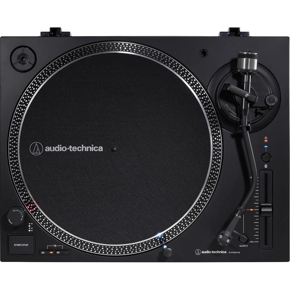Since the first cartridges rolled off the Tokyo assembly line in 1962, Audio Technica has been synonymous with high-quality turntables. The AT-LP120XBT USB is built on that legacy. Incorporating AT's standard attention to detail with today's technology, the AT-LP120XBT USB is designed to ensure you fully experience your vinyl's magic. A fully manual direct-drive turntable, the AT-LP120XBT USB plays 33-1/3, 45, and 78 RPM records so you can enjoy your entire collection. And while you're enjoying it, you can also archive it, using the USB output that allows you to record directly to your personal computer. You can also listen on wireless speakers or headphones where you want thanks to integrated Bluetooth® wireless connectivity. Outfitted with the high-performance AT-VM95E cartridge at the end of an S-shaped tonearm with adjustable tracking force, the AT-LP120XBT USB will deliver the listening experience your collection is worthy of. Audio-Technica AT-LP120XBT-USB-BK Includes: Audio-Technica Consumer AT-LP120XBT-USB Stereo Turntable with USB and Bluetooth (Black) 45 rpm Adapter USB Cable Stereo RCA Cable with Ground Wire Hinged Dust Cover Felt Mat Counterweight Plug-Type Stylus Target Light AC Adapter Limited 1-Year Warranty Audio-Technica AT-LP120XBT-USB-BK Features: Fully manual operation with 33 1/3, 45, and 78 rpm speeds Connects wirelessly to your speakers and other devices equipped with Bluetooth wireless technology, or to wired systems via the included stereo RCA cable aptX codec compatibility Anti-resonance, die-cast aluminum platter with felt mat Dual magnet phono cartridge with elliptical stylus Cartridge is compatible with nearly any VM95 series replacement stylus S-shaped tonearm with hydraulically damped lift control and lockable rest Switchable built-in preamplifier for phono- or line-level output Stroboscopic platter with speed indicator Variable pitch control with quartz speed lock Removable plug-type target light for easier queuing in low light Damped base construction for reduced low-frequency feedback coloration AC adapter handles AC/DC conversion outside the chassis, helping to reduce noise in the signal chain Convert your vinyl records to digital audio files with your recording software Audio-Technica AT-LP120XBT-USB-BK Specifications: Motor: DC Servo Drive Method: Direct Drive Speeds: 33 1/3, 45, 78 rpm Tonearm Type: S-Shaped Effective Arm Length: 9.075" / 230.5 mm Overhang: 0.63" / 16 mm Tracking Error Angle Torque: Starting: >1 kgf.cm Brake System: Electronic Cartridge Weight: Applicable: 3.5 to 8.5 g Anti-Skating Range: 0 to 4 g Signal to Noise Ratio: >50 dB Wow and Flutter Headshell: Model: AT-HS6 Mount: 1/2" Mount Cartridge: AT-VM95E Stylus: 0.3 x 0.7 Mil Elliptical Output: 1 x Stereo RCA Phono / Line Pair (Switchable Preamplifier) 1 x USB 1.1 Output Level: Phono: 4 mV Nominal at 1 kHz, 5 cm/sec Line: 240 mV Nominal at 1 kHz, 5 cm/sec D/A Converter: 16-Bit / 44.1 kHz or 48 kHz, USB Selectable Bluetooth: Version: 5.0 Output: Bluetooth Specification Power Class 2 Range: Up to 30' / 10 m with Line of Sight Profile: A2DP Codecs: SBC, aptX Gain: Phono Preamp: 36 dB Nominal, RIAA Equalized Turntable Platter: Die-Cast Aluminum System Requirements: Windows 7 or Later or Mac OS X or Later Available USB Port (USB 1.1 or Later) Power Requirements: 120 VAC, 60 Hz Power Consumption: 3 W Dimensions (W x H x D): 17.8" x 5.6" x 13.9" Weight: 17.6 lb / 8 kg without Dust Cover