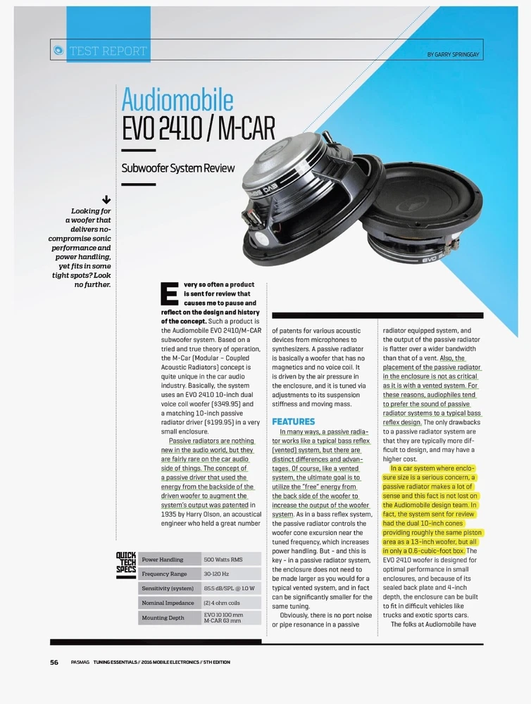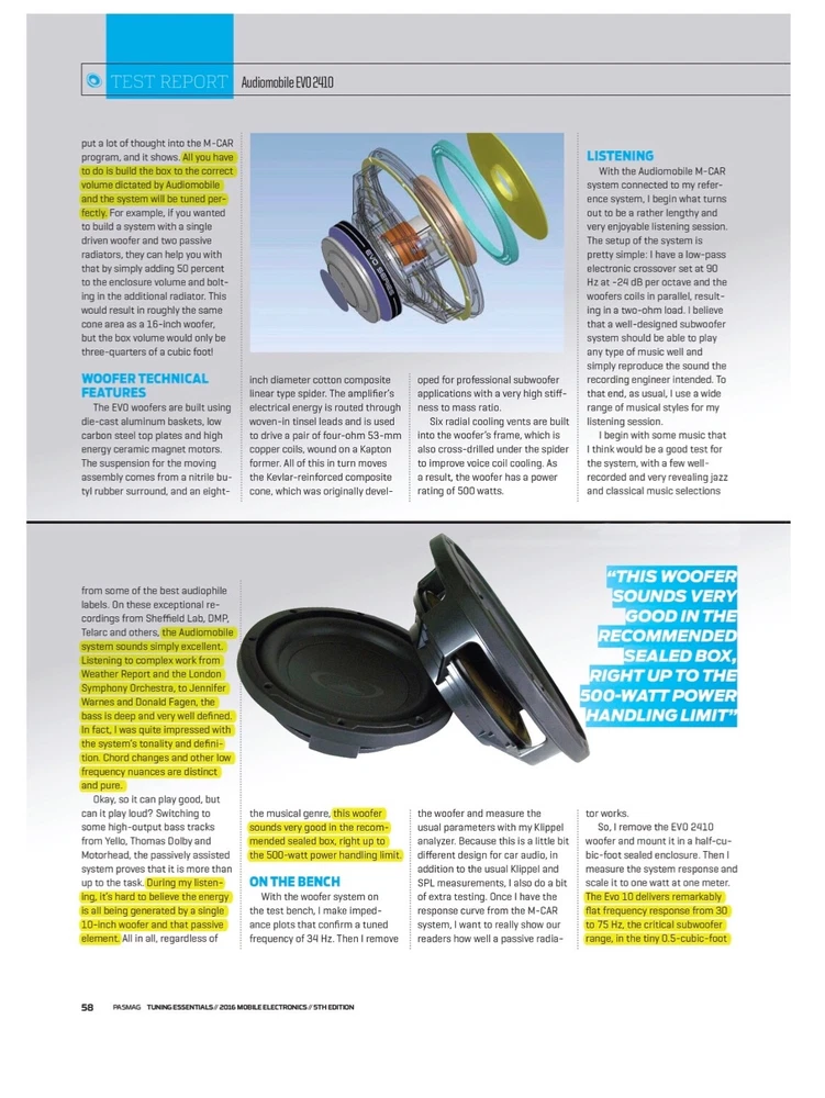 This Evo 2410 subwoofer represents a powerful addition to any premium car audio system. With a superior power rating of 600 watts, rms, it provides an exceptional sound quality experience for music lovers and mobile audio enthusiasts alike. The speaker features an array of unique, advanced driver technologies, including compact, ‘SMG’ motor, large-diameter, high-power voice coils, Aluminum Shorting-ring, and low Vas (enclosure air volume), as well as class leading Xmax, making it an incredibly versatile choice for both compact car or truck audio systems. This advanced subwoofer also features a unique sandwich Kevlar reinforced composite cone, as well as a heavy-duty, low-profile, ‘SLX’ cast Aluminum frame and modest 3.95” depth, ideal for those who want to upgrade their car audio to the ultimate level, without compromising their vehicles precious utility or their audio system budget.