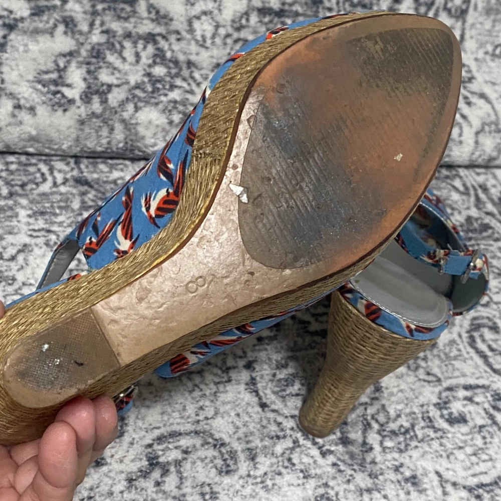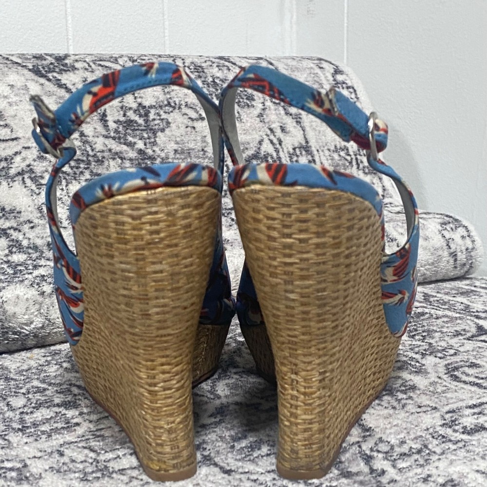 Audrey Brooke NAOMI Slingback Wedges in Blue Size 8, light blue background with red bird print, peep toe front, buckle closure, rattan wedge heel Heel Height - 4.5” - 5” Great condition No rips, tears, stains or damages See pics for more details & fabric content Fast shipping & pet/smoke free