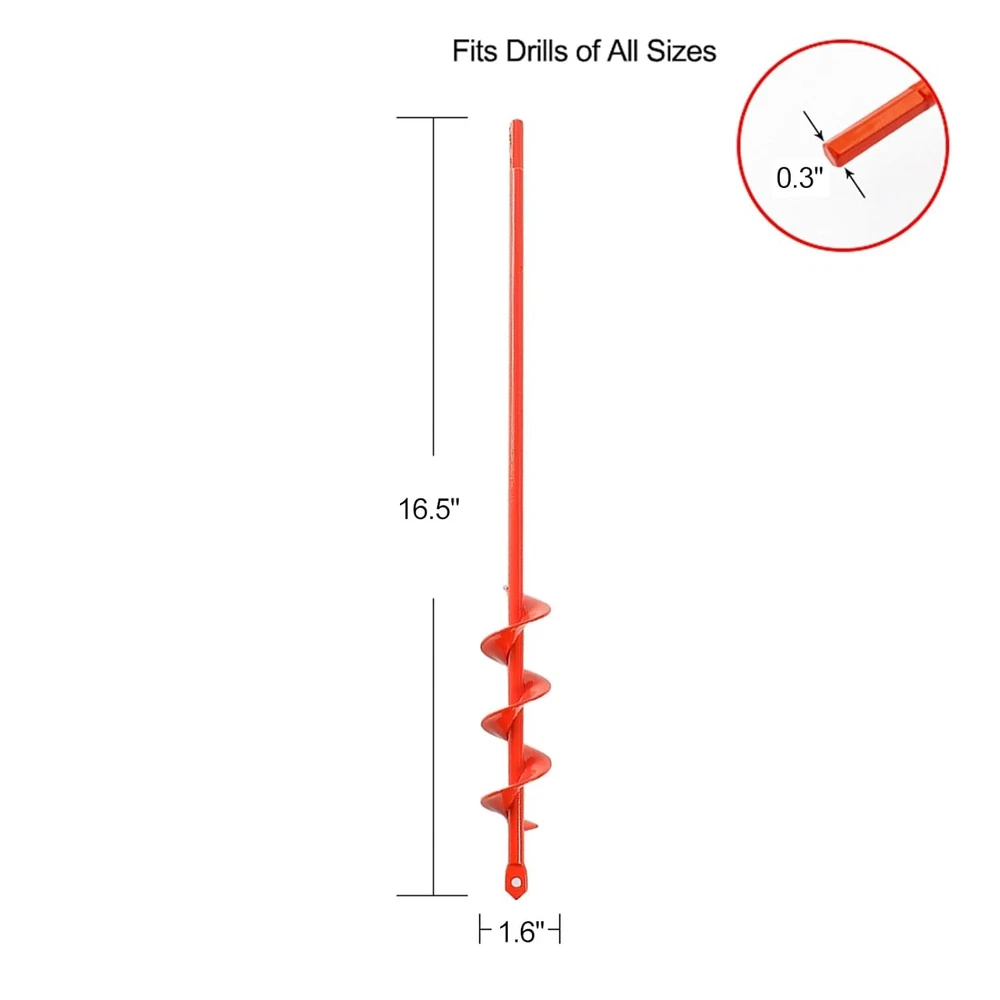 Auger Drill Bit for Planting 1.6"(D) x16.5"(L), Garden Ground Earth Spiral Drill Bit for 3/8" Hex Drive Drill, for Post Hole Digger Bulb Bedding Digging Plant Rapid Planter Shank Type Hex Tool Flute Type not_applicable Surface Recommendation Soil About this item HIGH EFFICIENCY: Designed with a new model upgraded bit and more blades on the shaft, this planting auger for drills ensures heightened efficiency in gardens. SIZE: Measuring 1.6"(D) x 16.5"(L), this auger drill bit is equipped with a 3/8 inch non-slip drive, making it an ideal tool for digging holes in your yard. EASY TO USE: Compatible with any 3/8" chucked drill. We recommend using an 18V or higher drill. Keep the auger clean from soil and debris when not in use. WIDE APPLICATION: Our garden auger is the best choice for enhancing efficiency when planting bulbs, potted plants, vegetables, flowers, bare-root trees, and shrubs. It's also suitable for tilling soil or planter boxes, mixing seed, soil, fertilizer, paint, or batches of mortar mix for hardscapes. The auger drill bit can effortlessly dig post holes, and it's even handy for anchoring your beach umbrella in the sand during vacations. It will be an invaluable helper for you. BUY WITH CONFIDENCE: We offer a 2-year warranty service. If you have any questions, please don't hesitate to contact us.