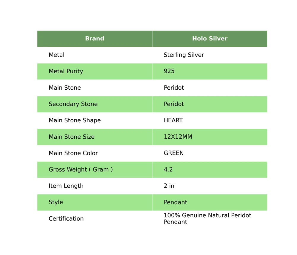 Welcome to Holo Silver Peridot Gemstone Indian Handmade Jewelry 925 Sterling Silver Pendant For Women Handmade Pendant, Sterling Silver Pendant, PERIDOT Pendant, Handcrafted Pendant SKU : PP-5-1 Gemstone : PERIDOT Stone Shape : HEART Metal Purity : 925 Sterling Silver Length : 2 Inches Width : Inches ___________________________________________________________________ Shipping Handling - Charge - Free ( Condition apply ) Handling Time - One business day . Delivery Time - 3 to 23 Days ( Various on destination ) Postage service - (A.) India Post - Below $100 order which takes 11 to 23 days . (B.) USPS, Fedex, DHL , Aramax- Order above $100 which takes 3 to 7 days . _________________________________________________________________ Returns - 1. We provide a 100% Money Back Guarantee, excluding shipping costs, within 30 days from the date of item receipt. 2. The item must not be altered or damaged in any way shape or form. 3. Upon receipt of the aforementioned items, your payment will be promptly refunded. 4. Please be so kind as to contact us via email in order to acquire comprehensive return instructions before proceeding with the return of the merchandise. 5. Kindly be advised to allocate a maximum period of 1 business day for the processing of all returns, in order for the appropriate credit to be applied. 6. Sizing does not affect the return policy. _________________________________________________________________ Payment - We accept PayPal for Payment , should made within three days once buying or winning done , in case of late information expected . _________________________________________________________________ FAQ's - Q.(A) ARE THE ITEMS YOU ARE SELLING BRAND NEW? We exclusively offer brand-new products, refraining from the sale of pre-owned jewelry. Our entire jewelry collection is composed of 100% natural, conflict-free pieces. We do not engage in the trade of imitation or lab-grown gemstones and diamonds. Q.(B) WHAT ARE YOUR BUSINESS HOURS? Our business hours are Monday to Friday, 10:00AM to 6:00PM, excluding holidays. ________________________________________________________________ Holo Silver is committed to delivering customers an unparalleled experience through the provision of exquisite handmade jewelry, meticulously crafted to uphold the most exacting standards of quality. Our operations encompass dual roles as both discerning connoisseurs and skilled artisans within the realm of jewelry making. We proudly hold an extensive proficiency in the fine art of enhancing gemstones, allowing us to harmonize them seamlessly with diverse aesthetic inclinations. We are delighted to extend to you the privilege of curating your very own jewelry collection. This collection will be graced by the presence of genuine and splendid natural gemstones, each possessing an innate authenticity and beauty that is truly unparalleled.