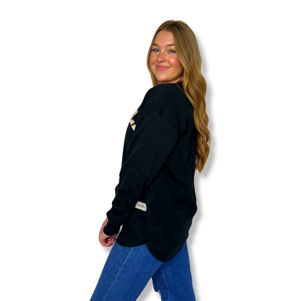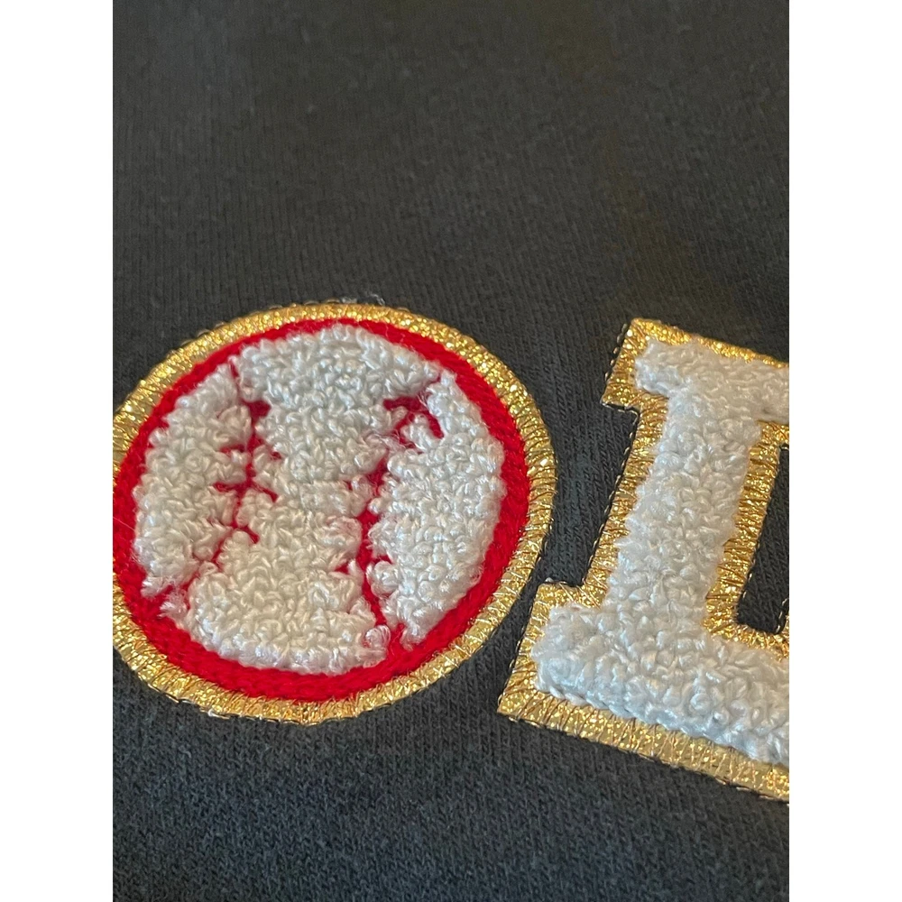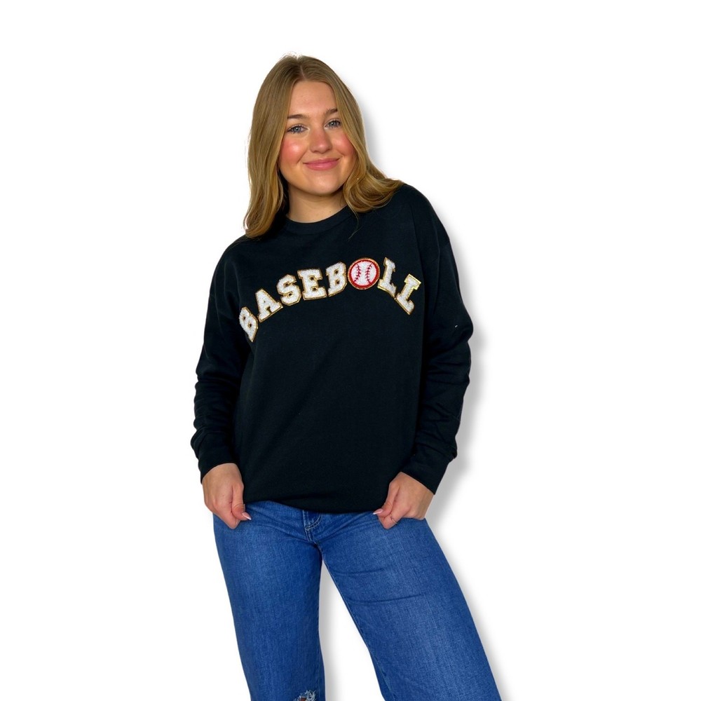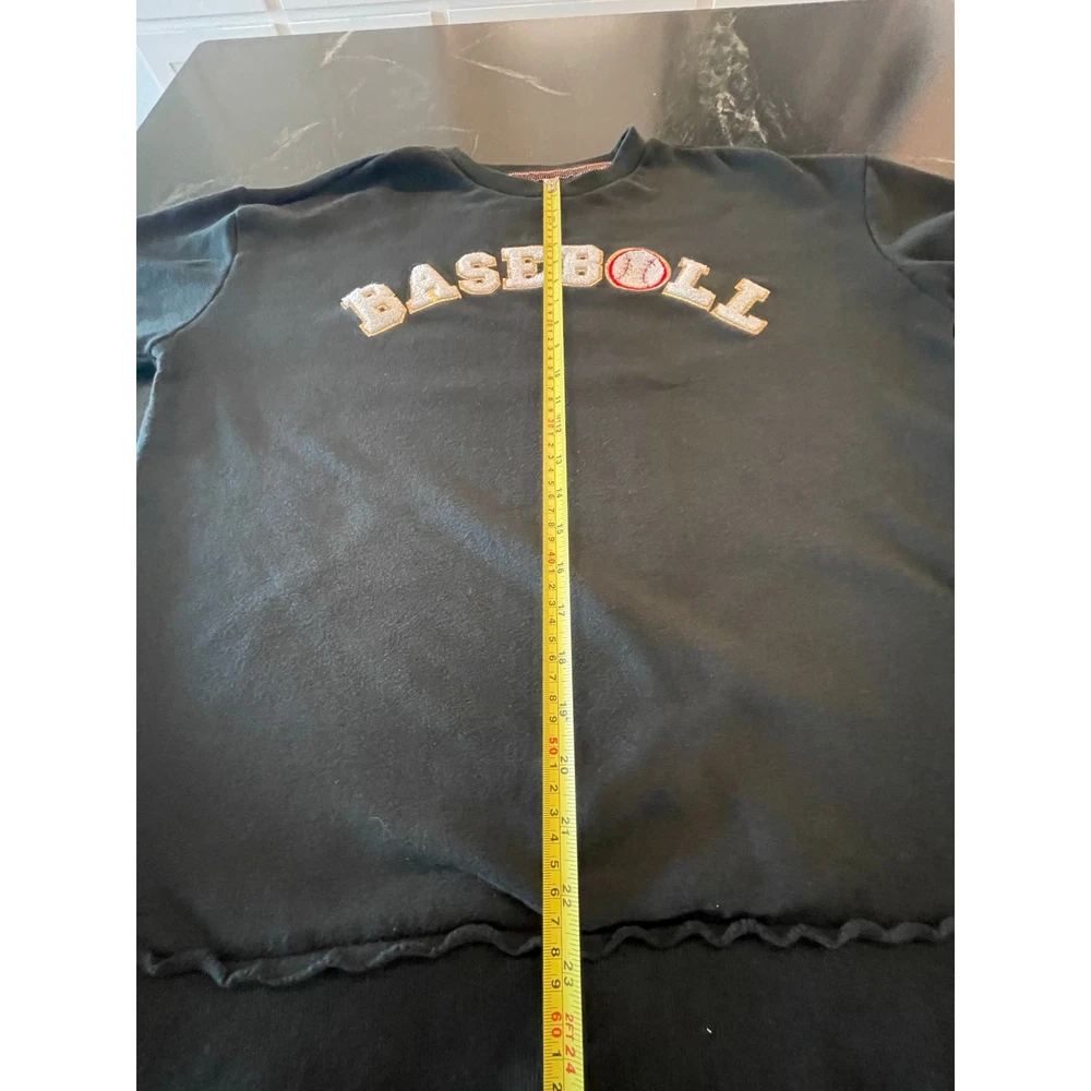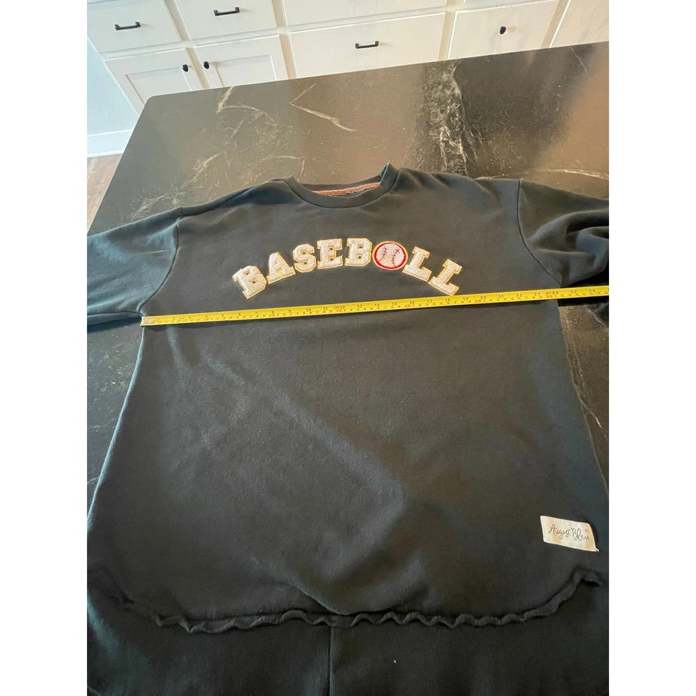 August Bleu black chenille patch baseball sweatshirt Large 60% cotton, 40% polyester. In excellent pre-owned condition. no wear or stress on the garment anywhere. Show your game day spirit with this stylish and practical pullover. The Baseball Preppy Patch Pullover was designed to offer comfort and style all in one. The unique high low hem was made to cheer on your team in the stands! Black high low pullover Crew neck Rounded high low hem Fleece interior Baseball custom patch Wash cold inside out, lay flat to dry We suggest ordering true to size for an oversized fit Run longer than the normal high low pullovers