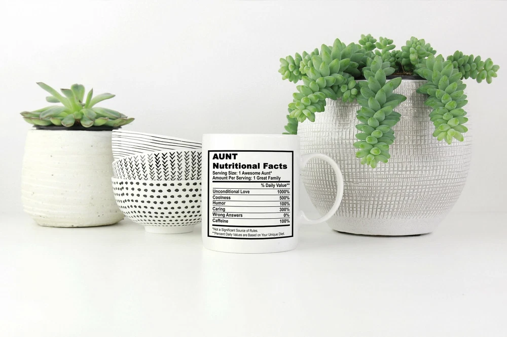 Aunt Nutritional Facts Coffee Mug Nutritional Facts Funny Coffee Mug Funny Gift Product Details.. This high quality 11oz. ceramic white mug has a premium hard coat that provides crisp and vibrant color reproduction sure to last for years. Perfect for all hot & cold beverages. The highest quality printing possible is used. It will never fade no matter how many times you wash it. Material: 100% Ceramic. Print both sides. Dishwasher and Microwave Safe. High Gloss + Premium White Finish. Printed in the U.S.A. Personalized & Custom. We support personalized and custom mug to add custom, when placing an order, you can add notes to the "order note" in shipping address section. Also you can contact us directly via message. Shipping Info. Ready to ship in 1 to 2 business days, All products are made-to-order and proudly printed in the United States. Shipped by USPS and DHL, You will receive your order in 5-7 days. Replace & Refund. All products are defective during shipping broken, chipped will be replaced free of charge. You are not satisfied with the product, we will refund 100% money to you. If any other issues arise, please do not hesitate to message, we would be more than happy to assist you.